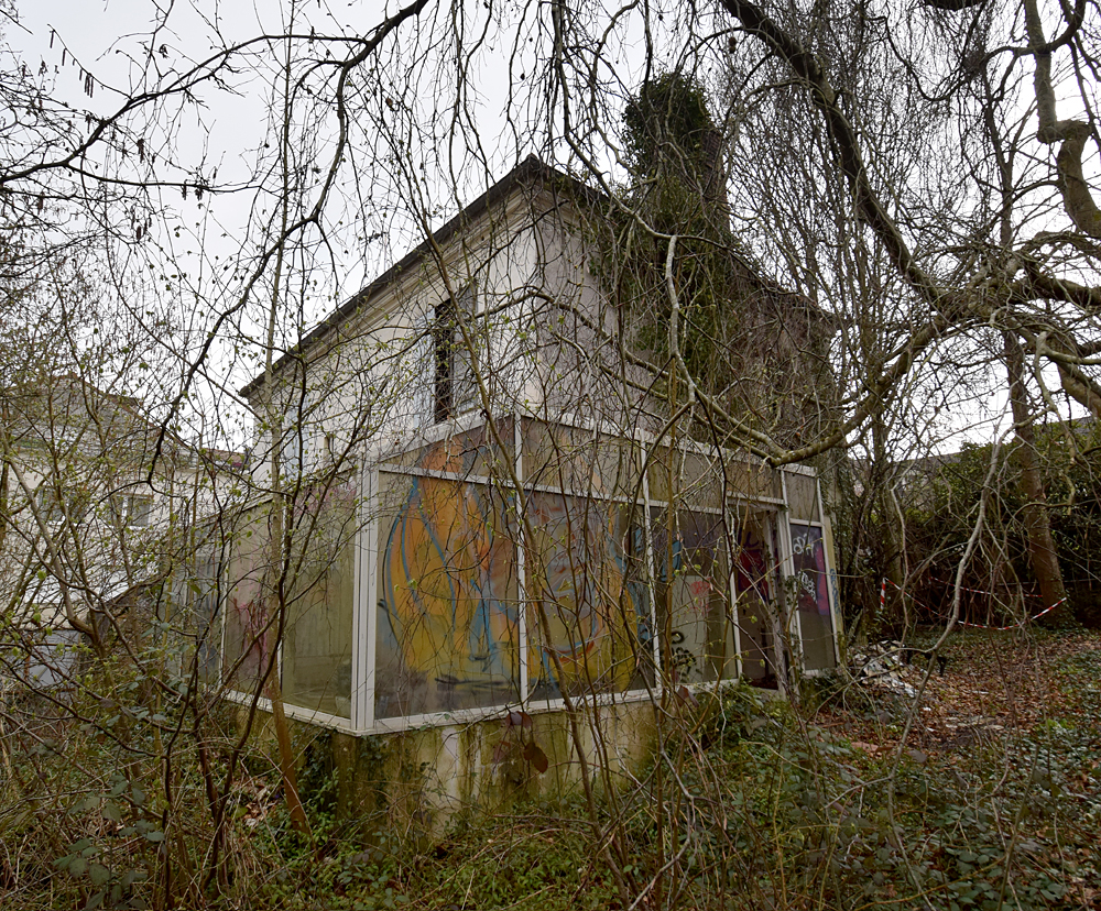 C’est par le portail entrouvert que nous entrons. A ce moment mon camarade me fait remarquer que lors de sa récente visite (celle où il prit les photos qu’il m’envoya par la suite) il était entré par un pan de mur effondré donnant sur la rue. Et effectivement, c’est plus simple que de passer par le portail ! Une fois entré dans la propriété je prends donc un cliché (première photo ci-dessous) depuis cet accès. A l’époque de cette visite nous sommes au printemps mais la végétation camoufle déjà un peu la maison. L’été elle doit être complètement invisible depuis le point de vue du mur effondré. Quelques pas plus loin, je documente la façade avant, et arrière. Des tags, des feuilles mortes, des détritus, le décor typique de l’exploration urbaine... |