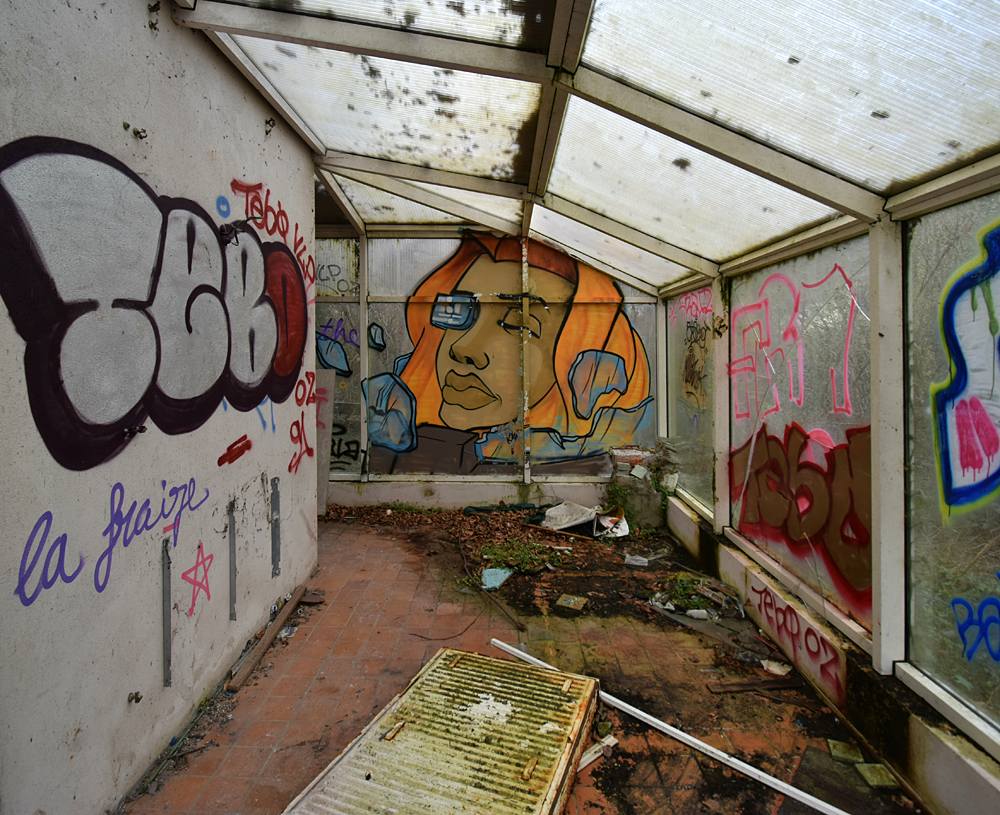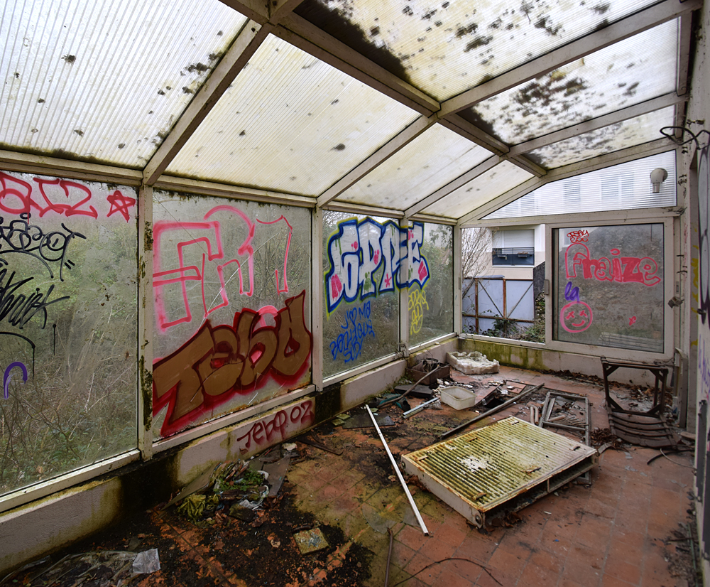 La visite débute par la véranda, datant probablement des années 80, et jurant méchamment avec le reste de la maison. Curieusement, tout a été tagué dans cette véranda, mais rien n’a été cassé. Probablement pour ne pas que les voisins (habitant juste à côté) appellent la Police. Peut-être aussi que, la maison ayant été squattée, ça n’aurait pas été très malin de briser la véranda et laisser entrer le froid… |