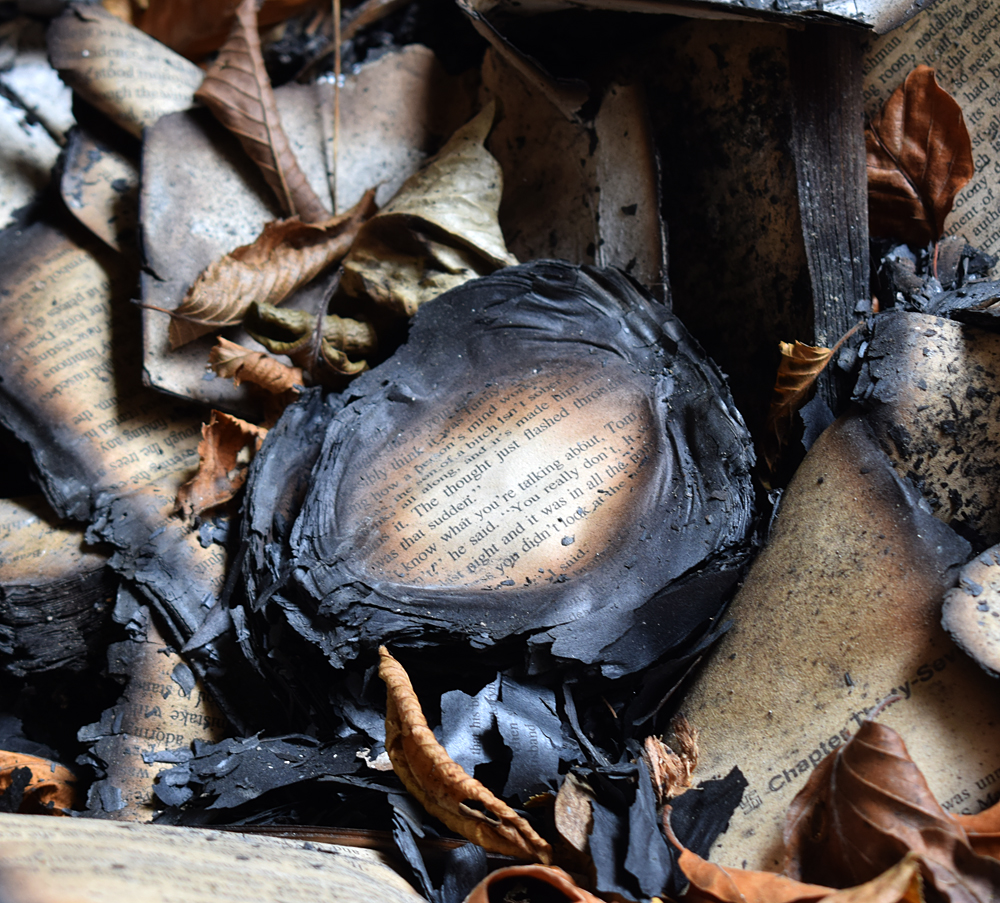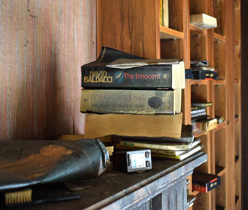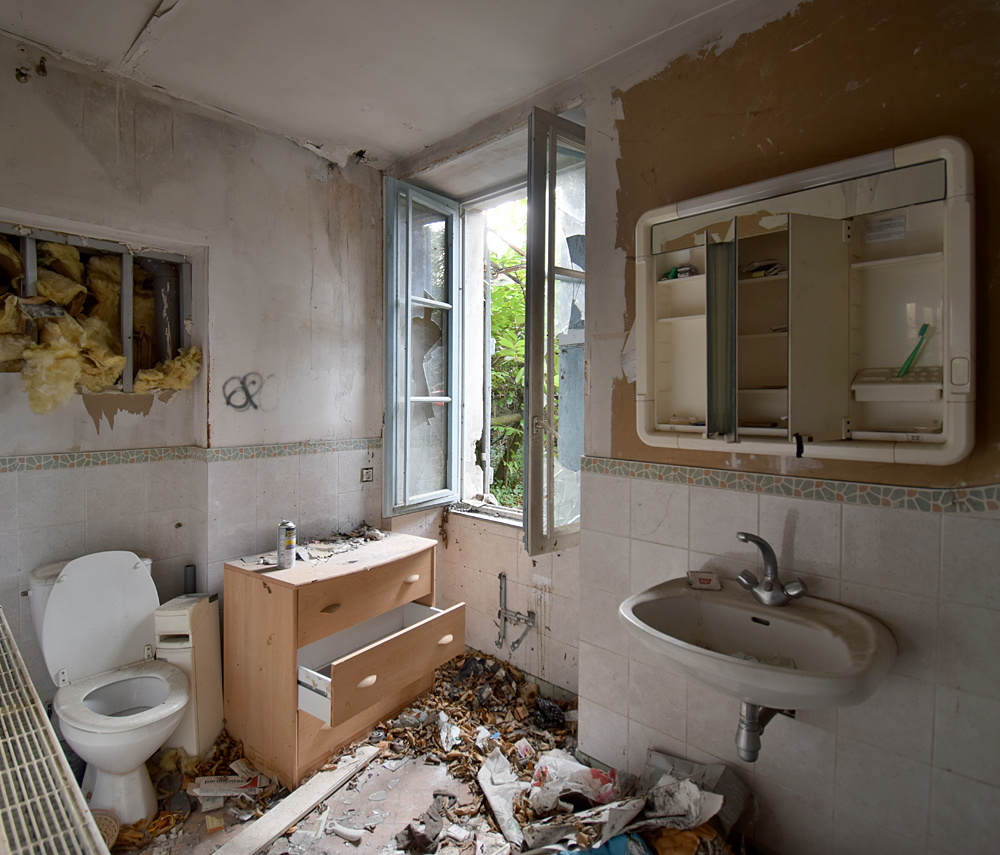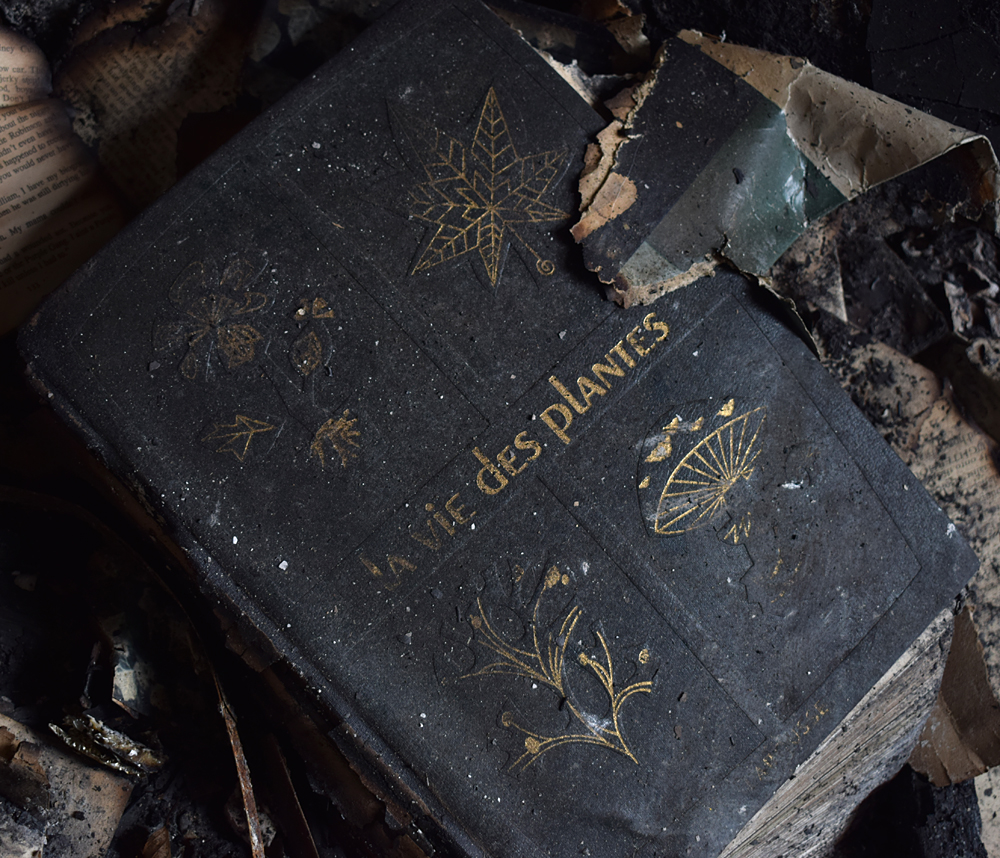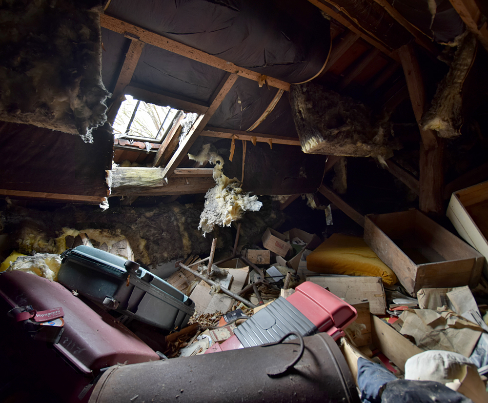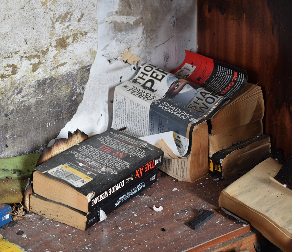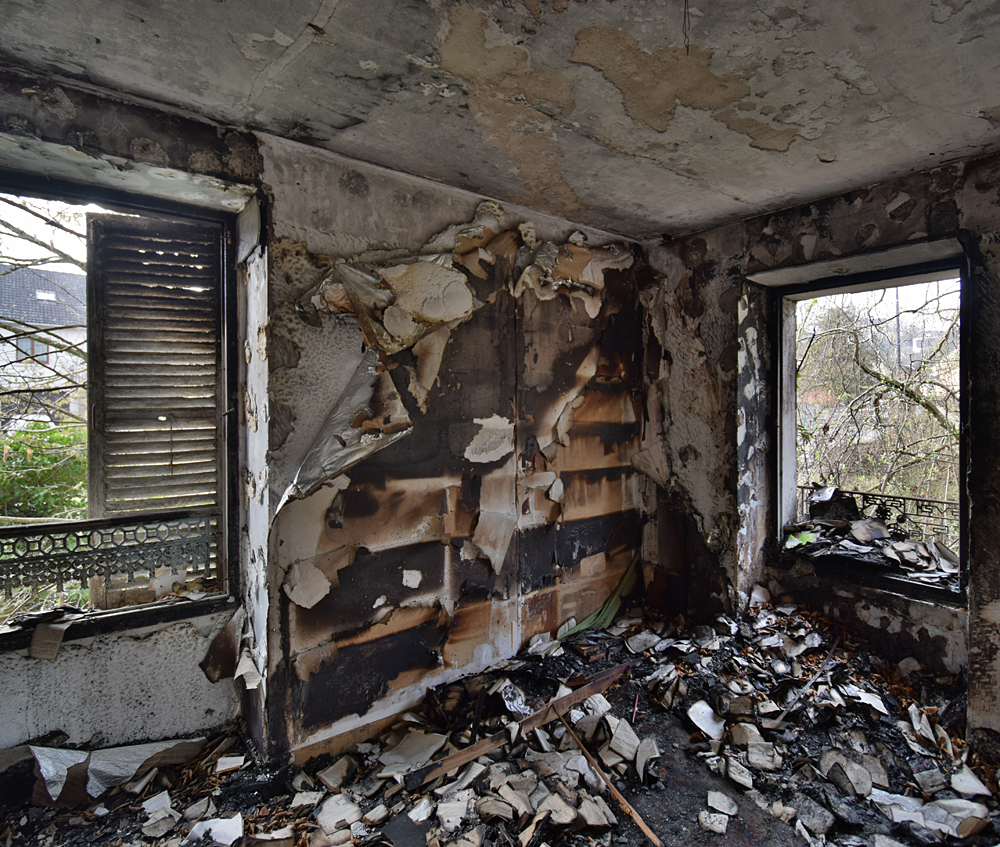 Le temps de gravir quelques marches, et me voici à l’étage. A pas lents, j’évolue dans la pièce ayant subi un grave incendie, et dont mon camarade de vélo m’avait envoyé une photo. Sentant que le plancher n’est pas très sécure, je prends quelques clichés et ne reste pas longtemps sur place… |