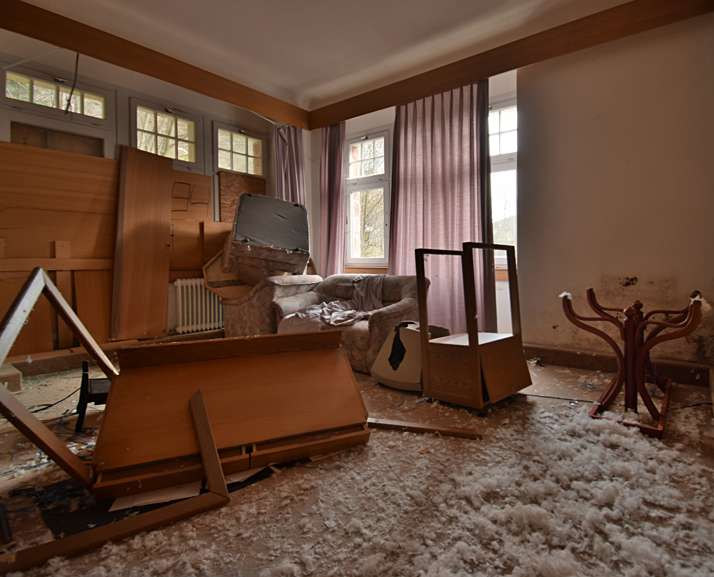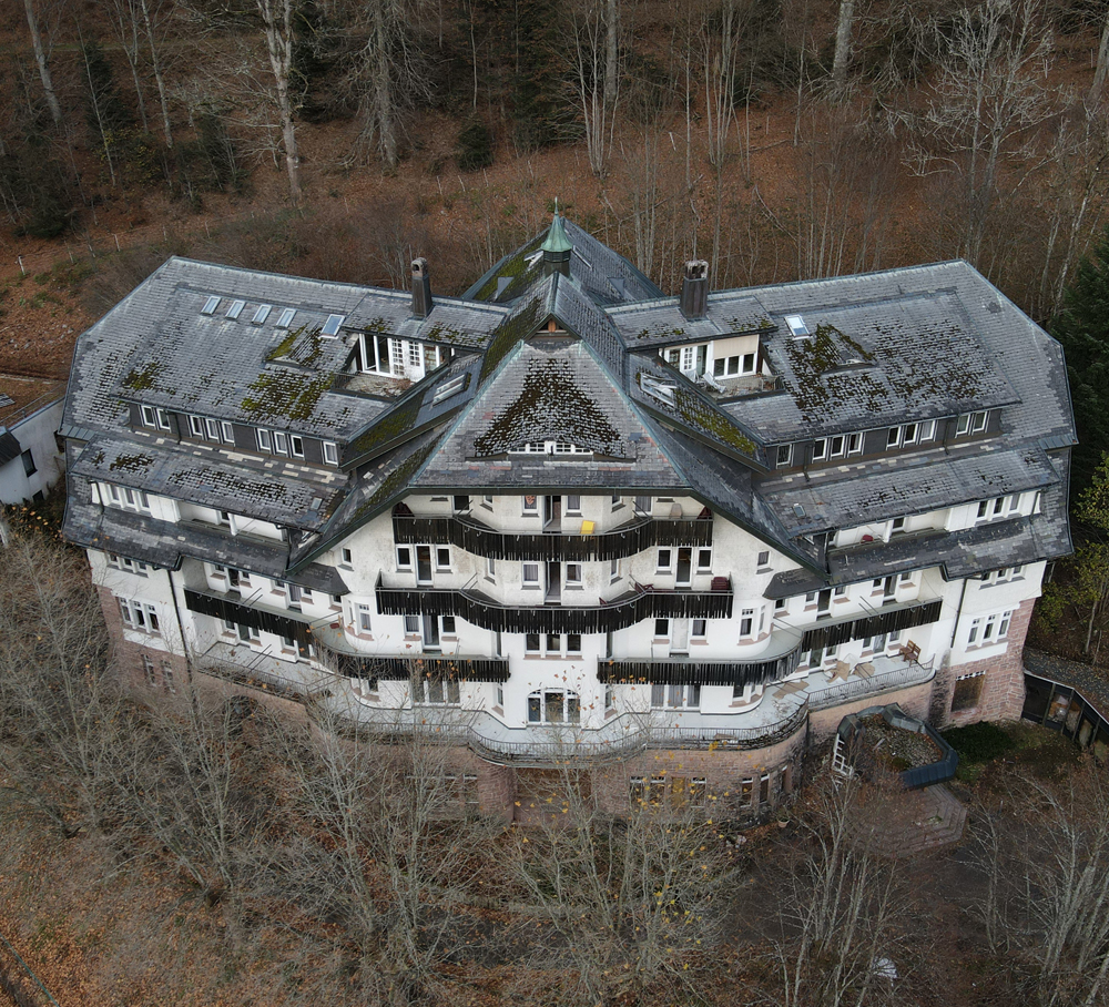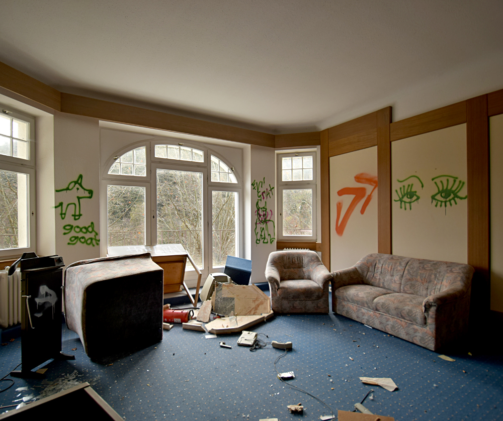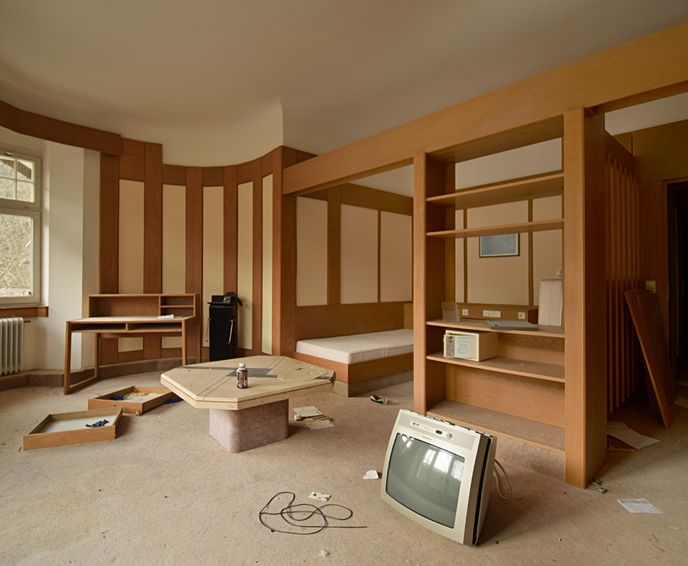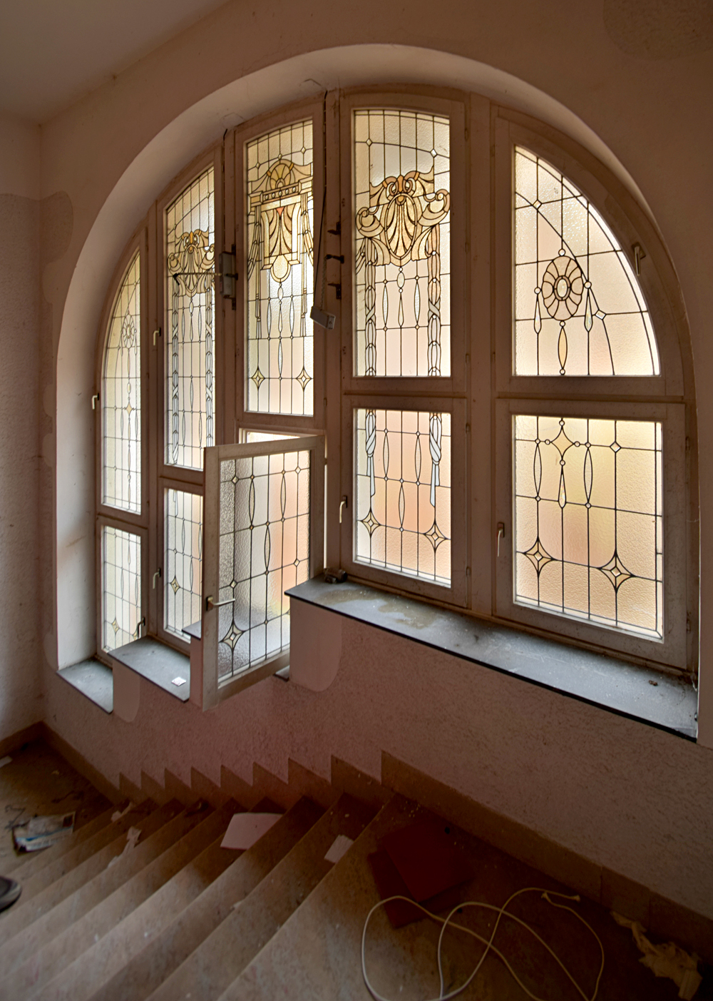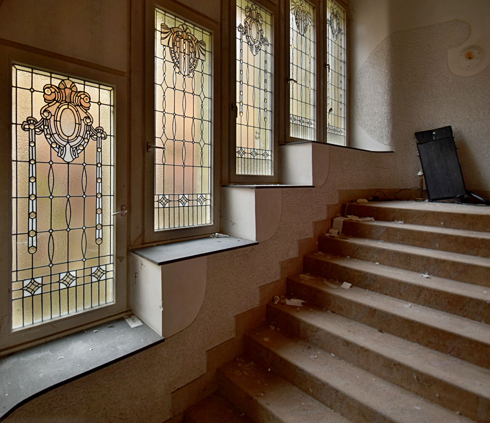 Cette visite fait suite à celle de l’Institut Tubaria situé sur la même parcelle. Le fait que les deux lieux n’aient pas été construits à la même époque et aient chacun un look distinctif fait que j’ai scindé cette grande visite (celle de l’institut, puis de la villa) en deux reportages séparés. La villa présentée sur cette page était à l’origine un bâtiment Art Nouveau fréquenté par de nombreux poètes. Construite entre 1908 et 1910, elle faisait partie d’un complexe d’établissement thermaux composé d’une dizaine de bâtiments. Aujourd’hui il n’en reste plus que deux : un toujours habité, et un autre, présenté ici. Modernisé dans les années 80 suite à l’établissement à proximité du complexe médical que j’ai nommé «Institut Tubaria», le lieu devient un sanatorium privé pour les clients les plus fortunés. C’est en fin de journée que j’ai effectué la visite de cette villa en compagnie d’Aude et Guillaume, alors que la lumière commençait à sérieusement décliner. Avançant le long d’un chemin encombré de feuilles mortes et où plus personne ne passe depuis des années, mes camarades et moi-même nous demandons si la belle villa (documentée au drone quelques instants auparavant) sera accessible. En effet, de nombreuses plaques ont été apposées sur les vitres, et la porte principale est condamnée. Pourtant, une échelle posée devant l’entrée montre un passage menant au premier étage. Cet accès étant bien trop voyant, nous contournons la villa à la recherche d’un passage derrière… Et c’est le cas ! Aussi fou que cela puisse paraitre, nous trouvons derrière le bâtiment une grande échelle posée contre le mur, et permettant d’accéder par la fenêtre à une salle de bain au deuxième étage. Ni une ni deux nous y grimpons, remontons l’échelle avec nous, la posons contre un mur de la salle de bain, et c’est ainsi que débute la visite… La lumière commençant à décliner, c’est à pas rapides que j’explore la villa, privilégiant les poses longues pour compenser la faible luminosité. Ne sachant pas trop où aller, c’et par hasard que je tombe sur le très bel escalier (qui fut un des premiers de la région à être doté d’un ascenseur) avec ses sublimes vitraux. Dire qu’il y en a à chaque étage ! Seul détail qui me chiffonne avec ces vitraux : ils sont orientés plein nord, donc la lumière y passe très peu, trop peu à mon goût. |