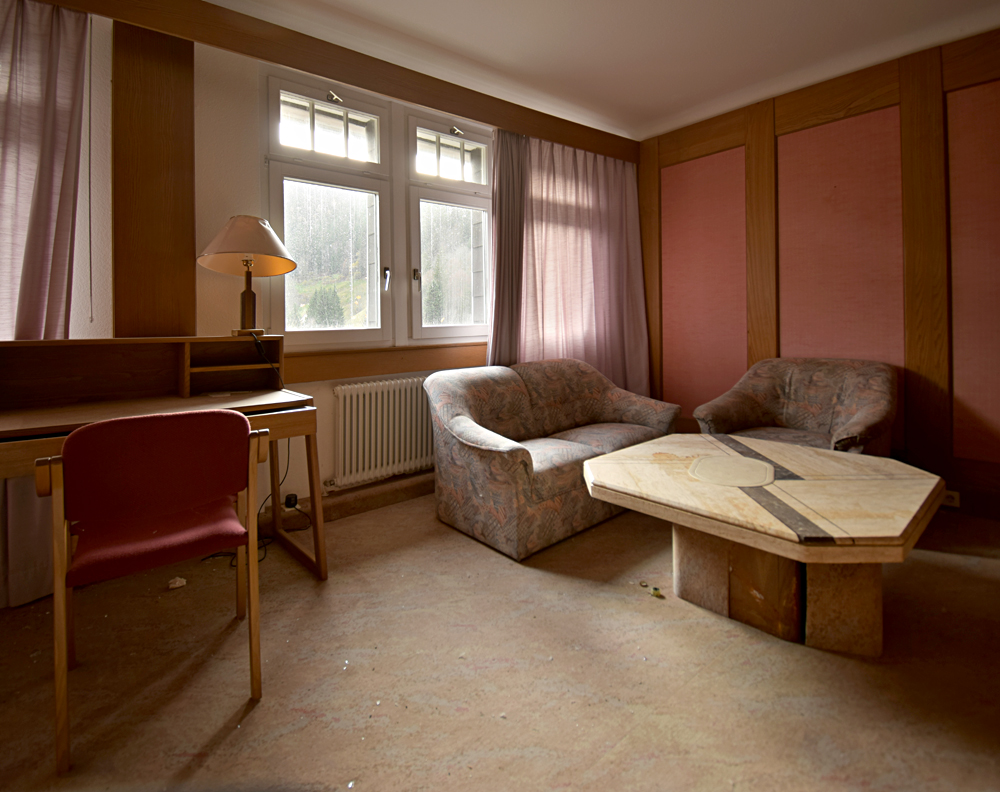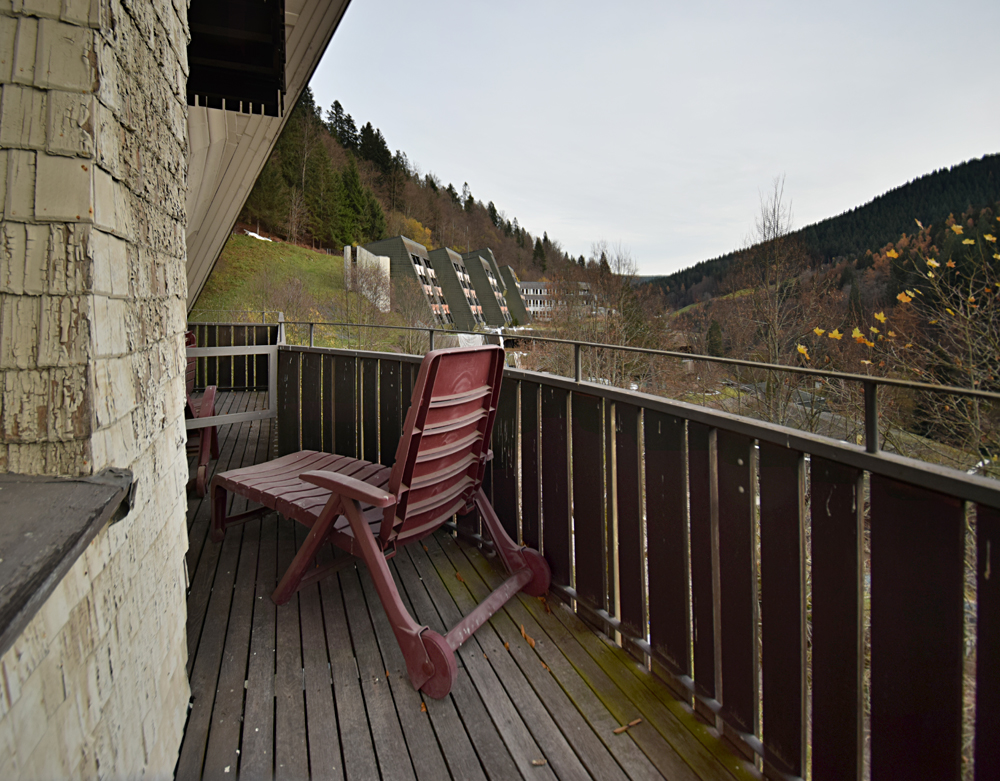 La villa étant composée à 80% de chambres, c’est cela que nous documentons. Et comme pour le complexe médical situé à proximité, nous sommes étonnés qu’il reste encore tant de mobilier et d’objets sur place. Bon, il y a aussi des tags et des dégradations, mais ce bâtiment pourrait très bien revivre un jour. Les vues depuis les balcons sont si belles, la vallée s’ouvre devant nous, reposante… Et, tournant le regarde sur la gauche, on distingue le complexe médical, dont l’architecture tranche beaucoup avec la villa. Lors de l’exploration, Guillaume nous envoie un message dans le Whatsapp commun : une photo de deux bouteilles de Fanta, neuves. Etrange ! Retenez ce détail, il aura son importance plus tard. |