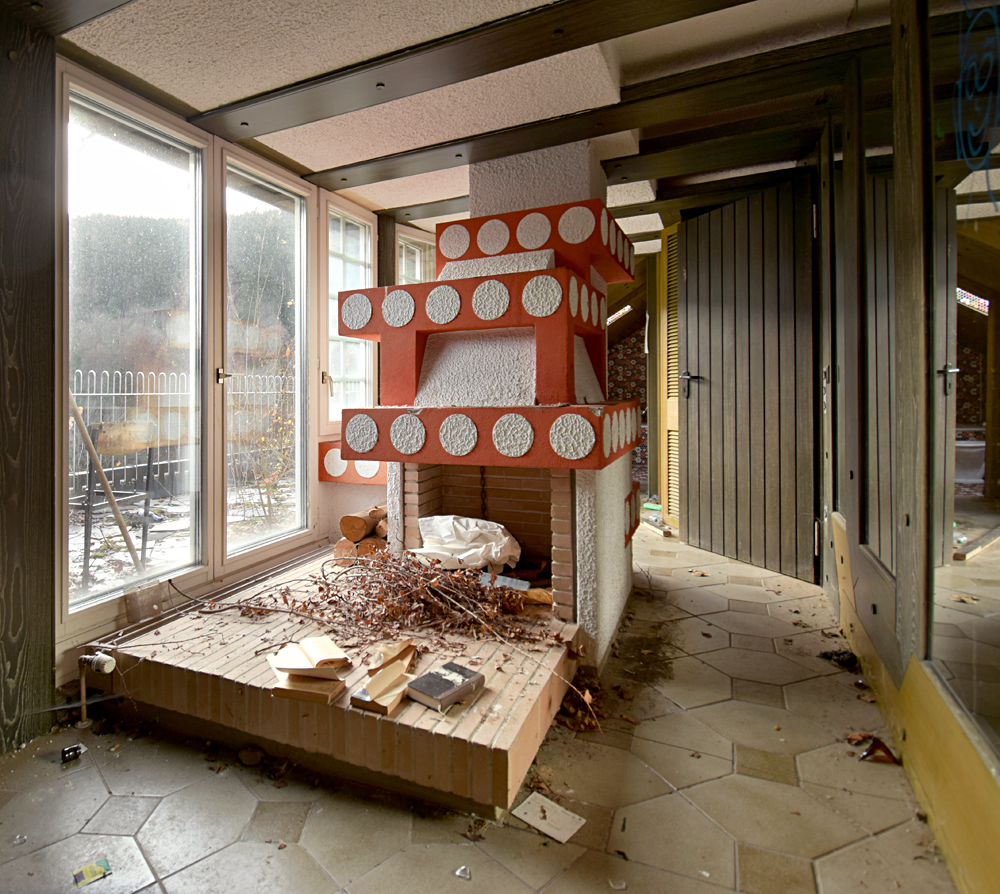 Au dernier étage de la villa, quelques chambres (plus petites) offrent un panorama encore plus beau sur la vallée. Curiosité : dans l’une d’entre elles je trouve une étrange cheminée rouge et blanche d’un goût vraiment kitch. Pourquoi cette cheminée est-elle au milieu de la pièce ? Mystère. Et ces ronds blancs en crépi, si étrange ! |
