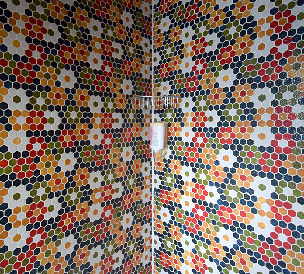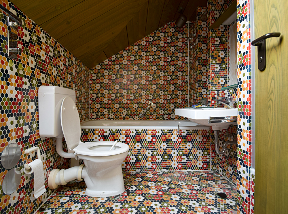 Mais le kitch n’en a pas fini : à peine deux ou trois pas derrière la cheminée, je découvre une salle de bain où le cahier des charges semble avoir été «Je veux avoir l’impression de me laver ou de faire mes besoins dans un champ de fleurs». Et ça marche à la perfection ! |