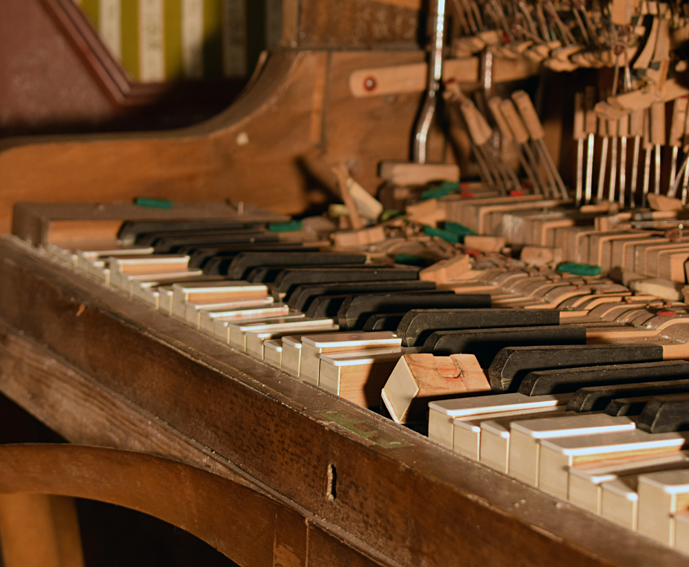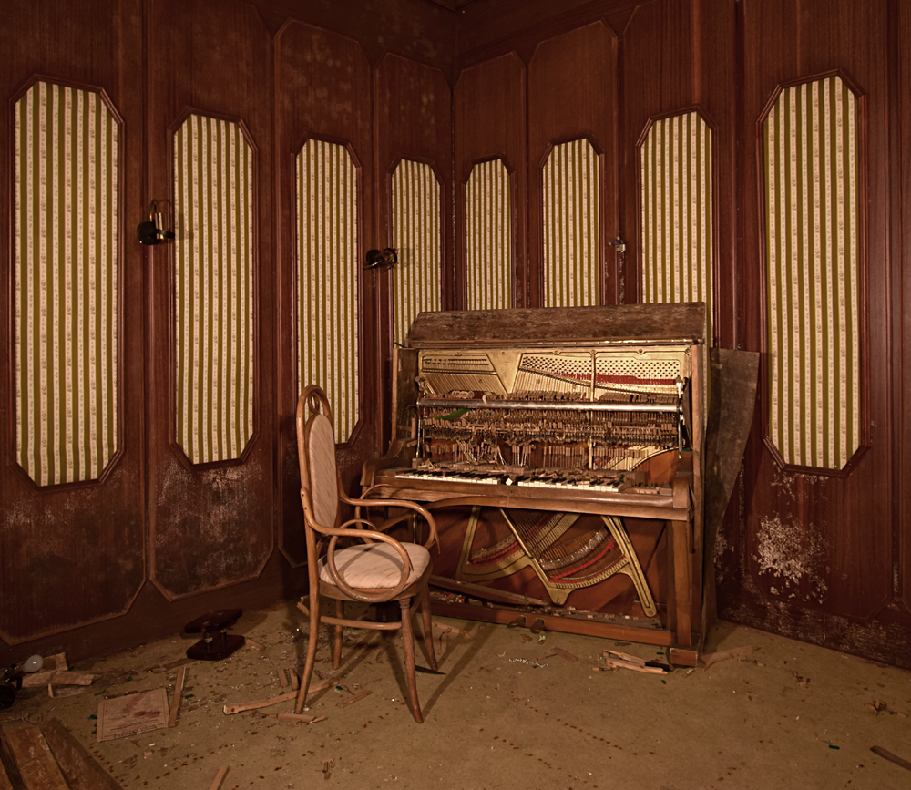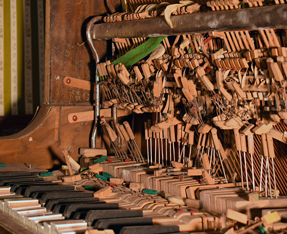 La visite est-elle terminée ? Il semble que oui, à moins que… Alors que j’ai fini de ranger mon appareil photo dans mon sac, Aude et Guillaume m’invitent à venir voir quelque chose d’intéressant : un piano dans une petite pièce non loin du bar ! Prenant la poussière depuis je ne sais combien d’années, mal en point, il n’en reste pas moins photogénique au possible, et c’est avec un grand plaisir que je ressors tout mon matériel photographique pour essayer de faire honneur à l’antique instrument. |