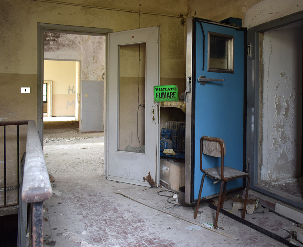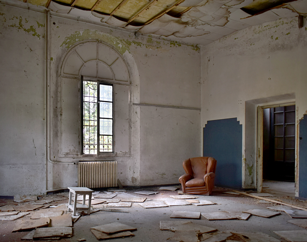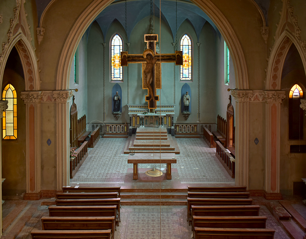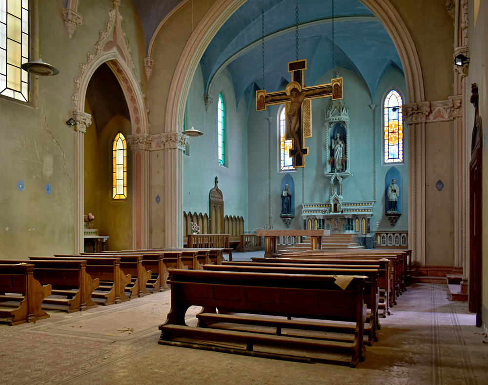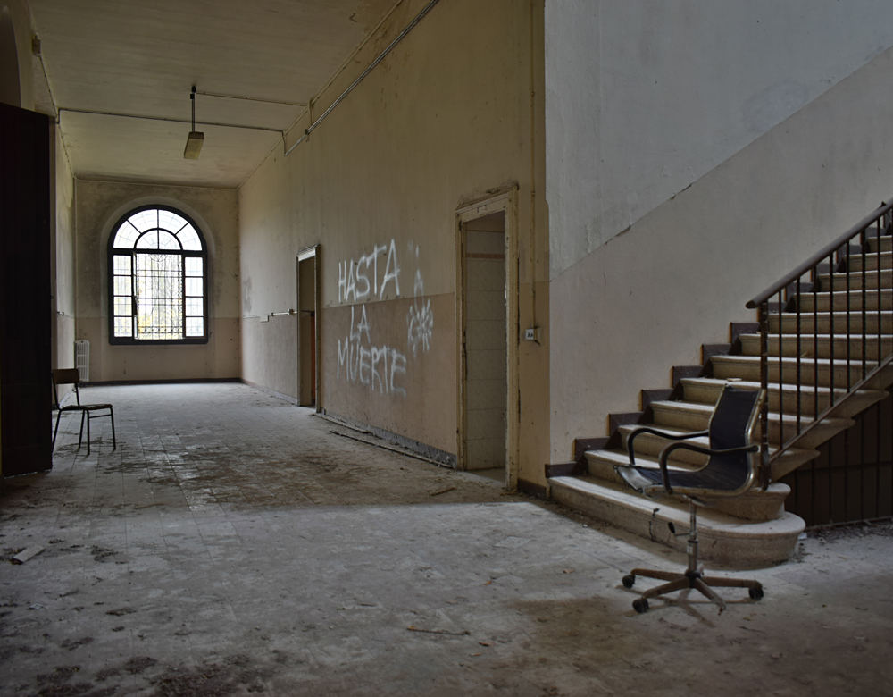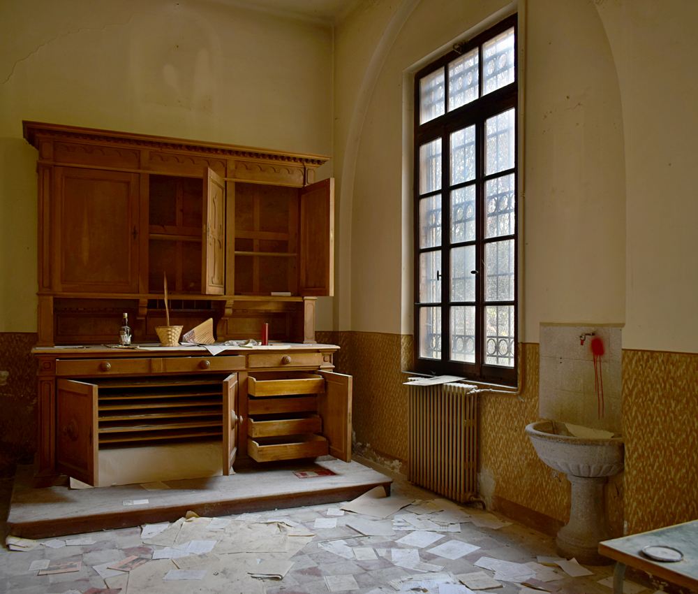 La chapelle est bien évidemment le point d’intérêt numéro un du site tant elle est impressionnante, et ce pour deux raisons : les vitraux et la peinture du chœur sont d’une sublime teinte bleutée qui confère un caractère particulièrement mystique au lieu. L’autre raison est que pour une raison qui m’échappe, cette partie du site est miraculeusement exempte de tags ou de dégradation. En termes d’exploration urbaine, un mot s’impose : miraculeux. |