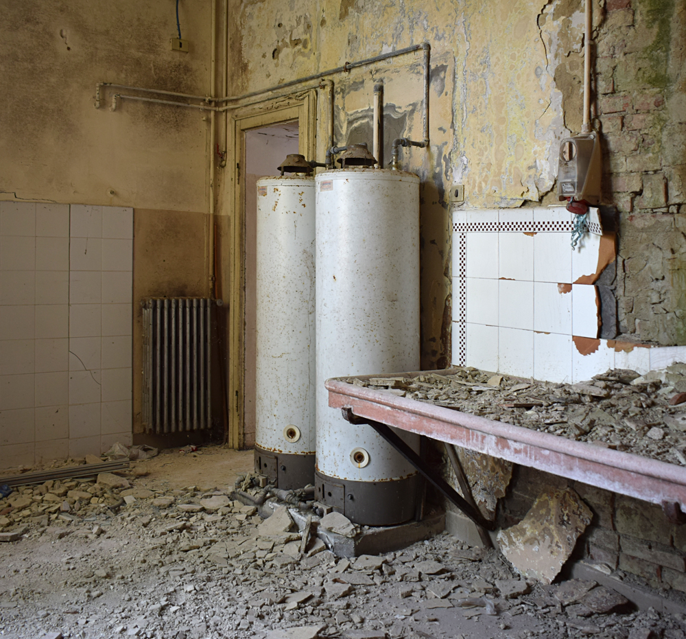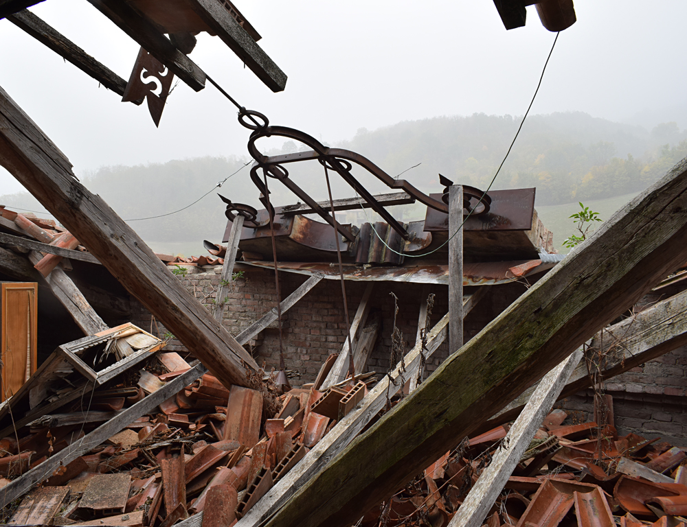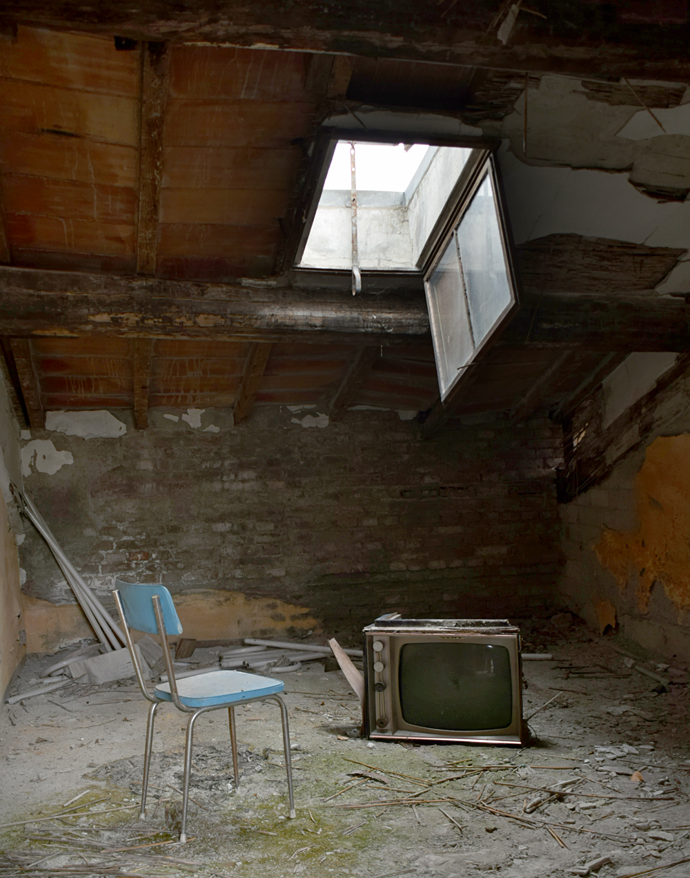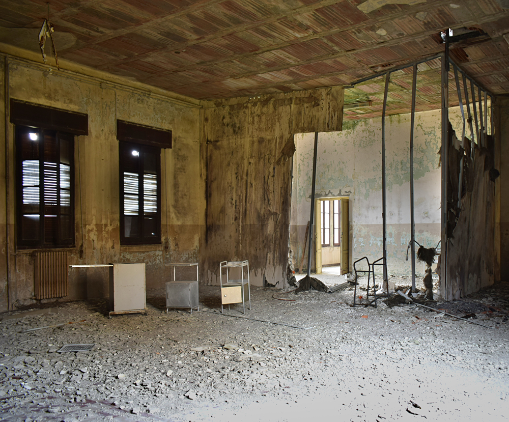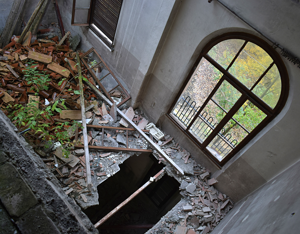Ci-dessous, des photos prises au deuxième étage du bâtiment. La toiture étant endommagée, il n’est pas rare de pousser une porte et de voir que celle-ci donne sur un trou menant à l’étage inférieur ! |