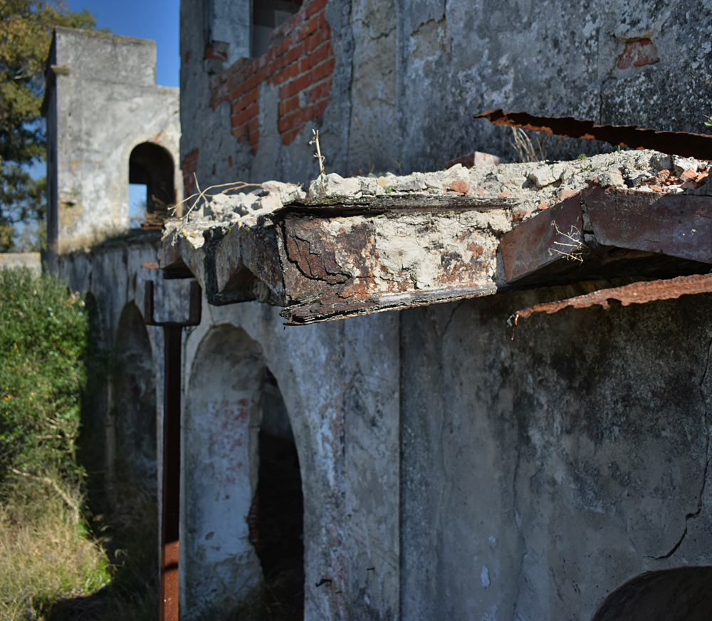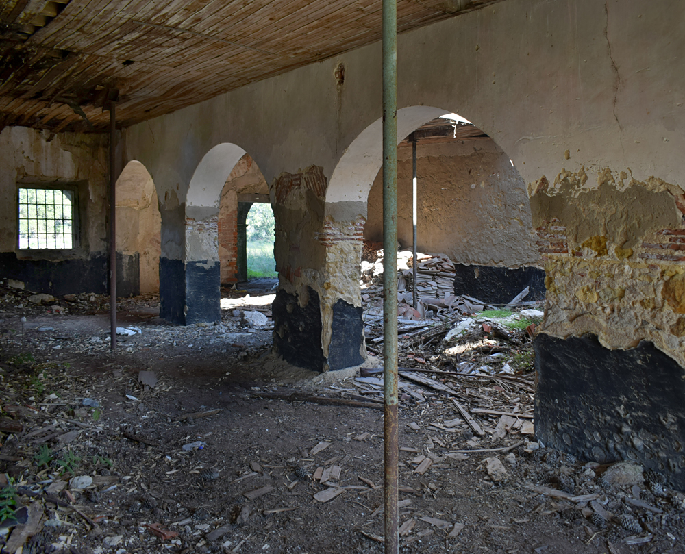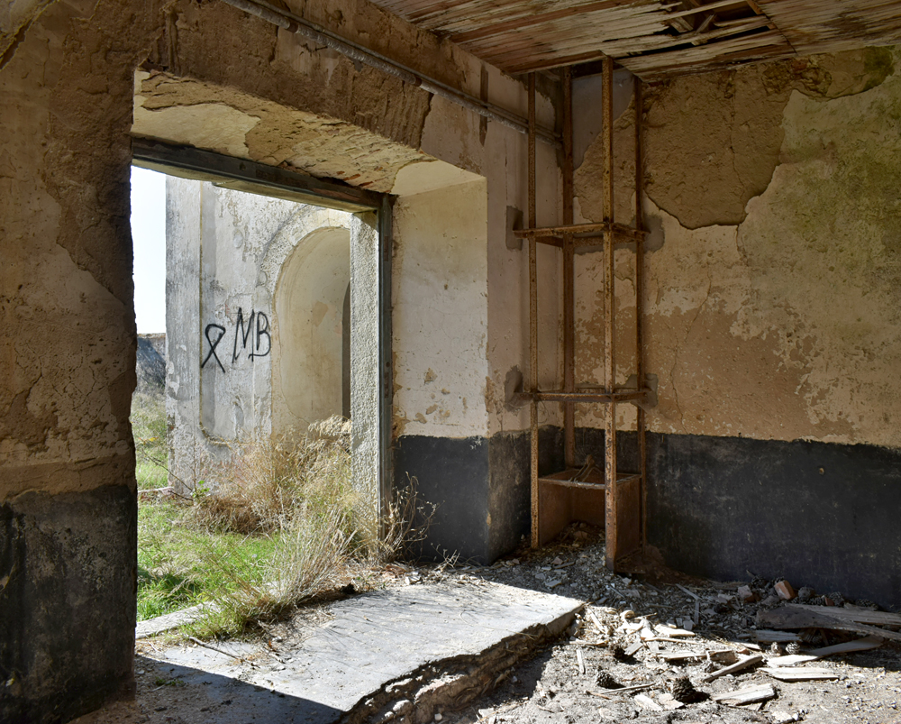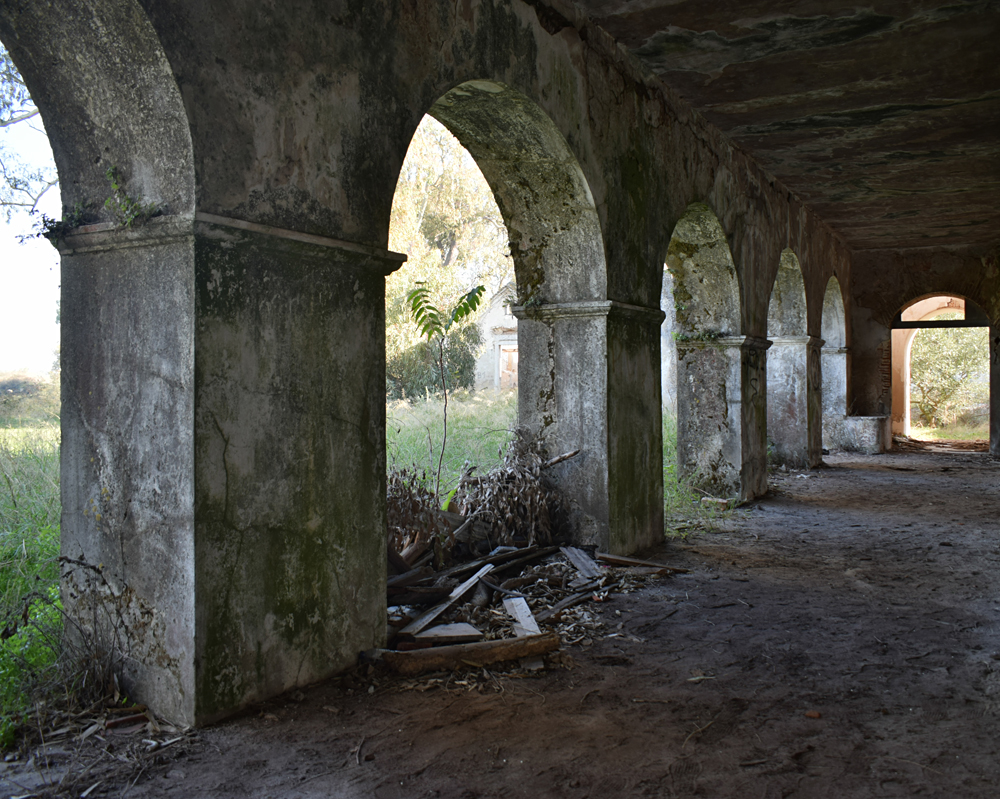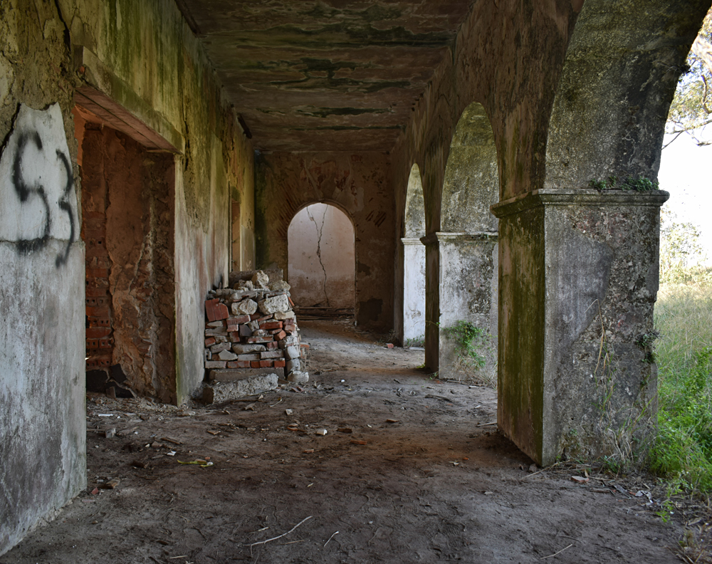 Il est temps de se diriger vers le bâtiment principal. Son état ne laisse aucun doute sur le délaissement de cette ferme qui, compte-tenu de sa taille, devait être florissante. Plusieurs bâtiments forment cet ensemble exceptionnel. Avant de me lancer dans la visite systématique des installations, j’identifie tout d’abord, la maison des propriétaires avec ses toits de tuiles. La façade est ornée d’un escalier menant à une terrasse dont la rambarde n’existe plus, qui desservait les pièces d’habitation de la maison. A l’angle, un genre de tour carrée s’élevait au-dessus du faîte. Au rez-de-chaussée, une série d’arcades donnait sur ce qui devait être un jardin intérieur. La toiture est sacrément endommagée et les fenêtres ont été enlevées. Je m’aventure à l’intérieur et comme je le pressentais, les pièces sont vides et en très mauvais état, au point que je renonce à explorer l’étage où le plancher, trop défoncé à mon goût, risquant de s’écrouler sous mon poids. J’ai tout de même un certain plaisir à admirer le volume de cette demeure qui devait être prestigieuse |