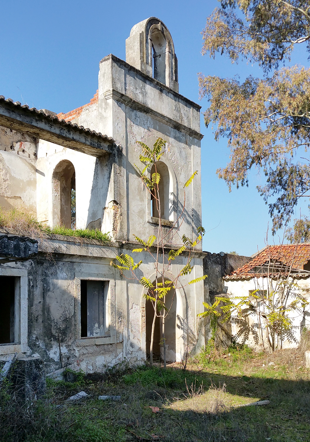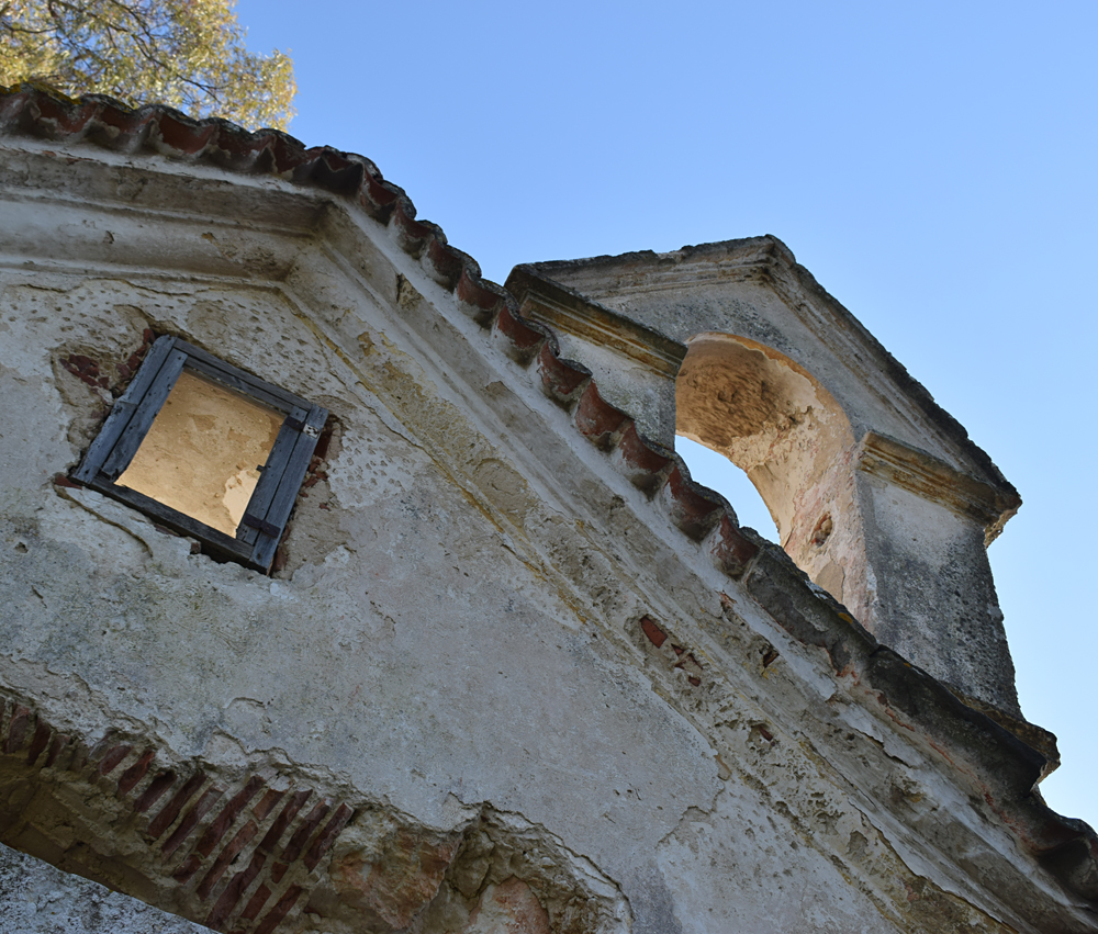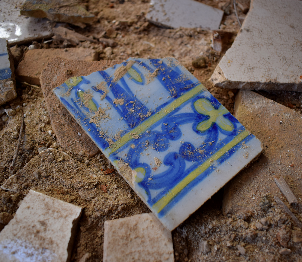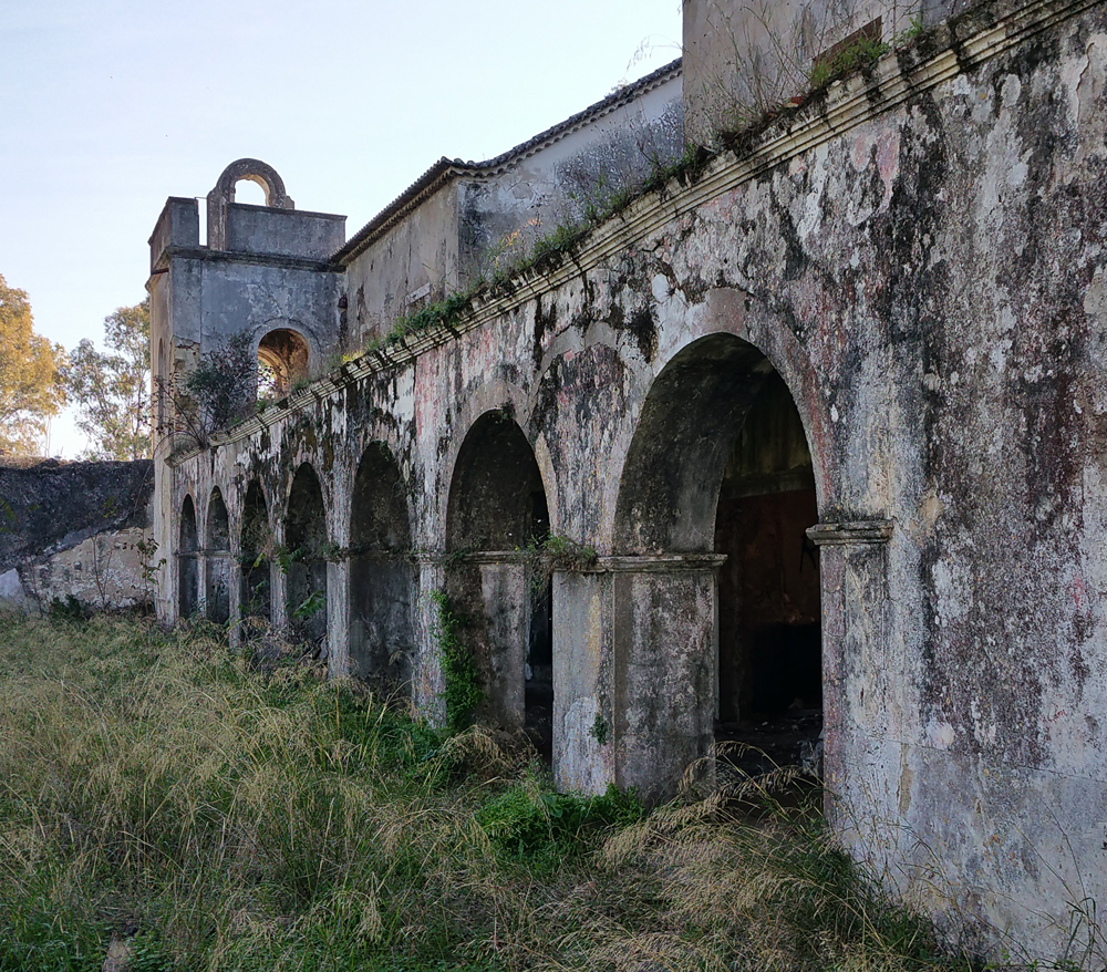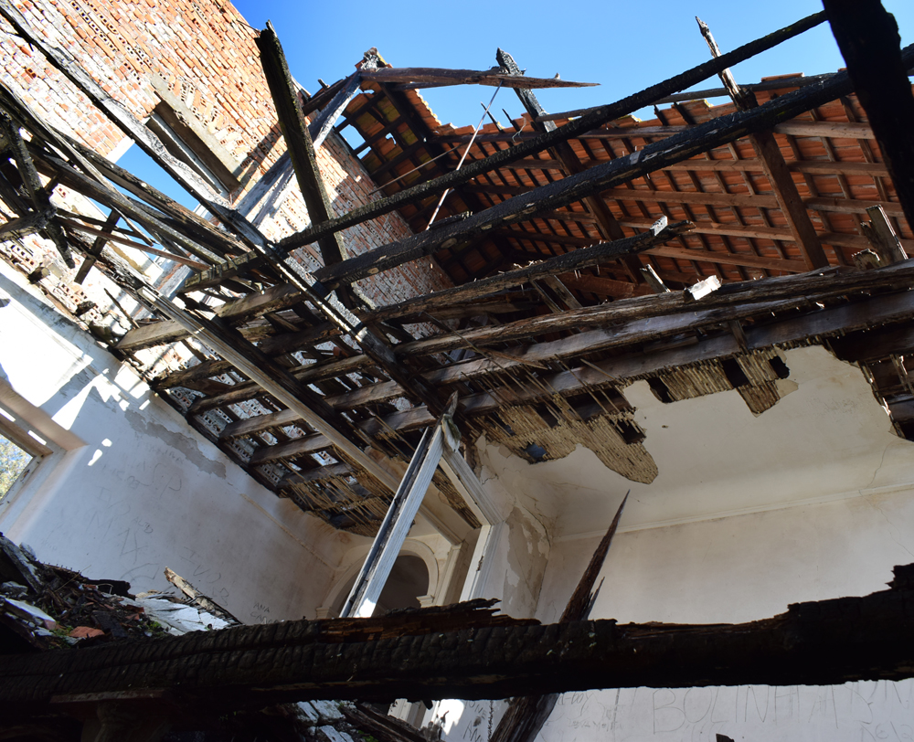 Il est temps de se diriger vers le bâtiment principal. Son état ne laisse aucun doute sur le délaissement de cette ferme qui, compte-tenu de sa taille, devait être florissante. Plusieurs bâtiments forment cet ensemble exceptionnel. Avant de me lancer dans la visite systématique des installations, j’identifie tout d’abord, la maison des propriétaires avec ses toits de tuiles. La façade est ornée d’un escalier menant à une terrasse dont la rambarde n’existe plus, qui desservait les pièces d’habitation de la maison. A l’angle, un genre de tour carrée s’élevait au-dessus du faîte. Au rez-de-chaussée, une série d’arcades donnait sur ce qui devait être un jardin intérieur. La toiture est sacrément endommagée et les fenêtres ont été enlevées. Je m’aventure à l’intérieur et comme je le pressentais, les pièces sont vides et en très mauvais état, au point que je renonce à explorer l’étage où le plancher, trop défoncé à mon goût, risquant de s’écrouler sous mon poids. J’ai tout de même un certain plaisir à admirer le volume de cette demeure qui devait être prestigieuse |