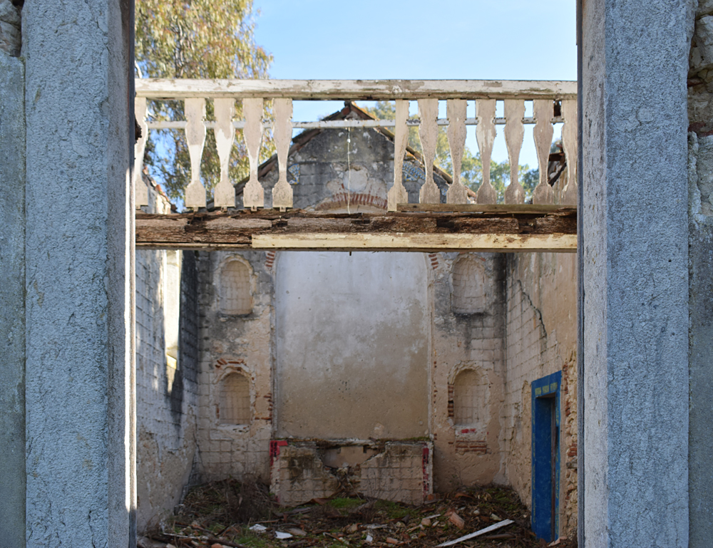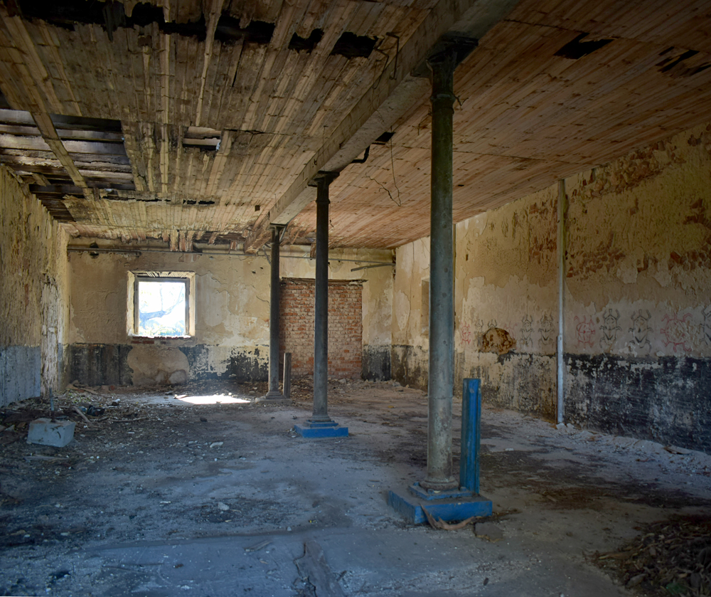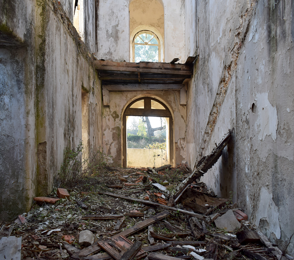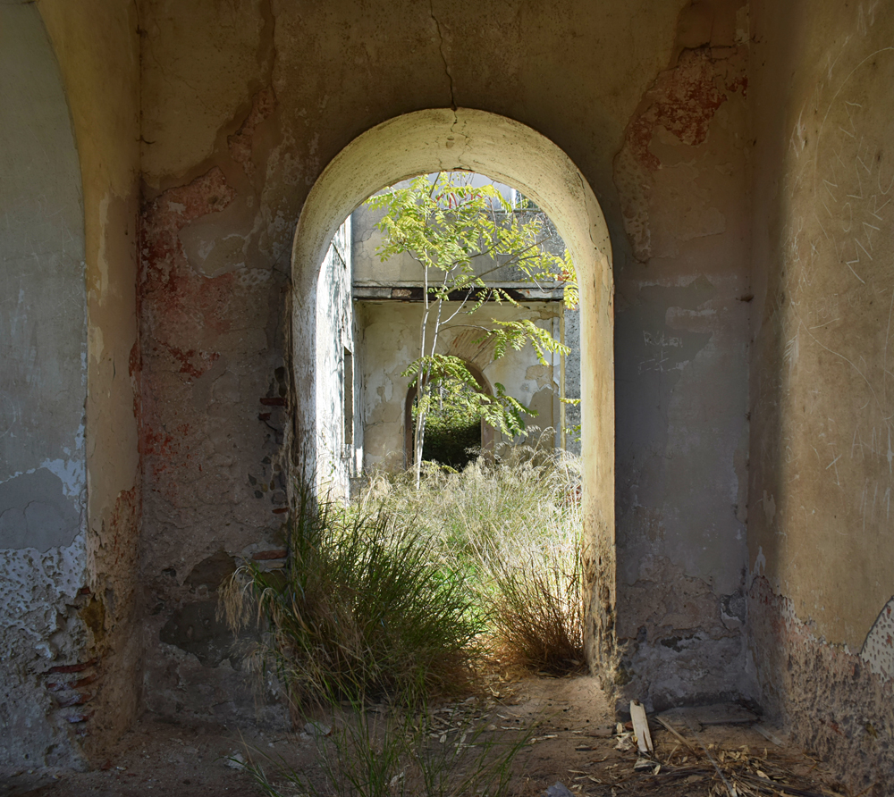 Revenant vers le bâtiment, j’explore certaines pièces oubliées lors de mon premier passage. Et, comme lors de la première visite quelques instants auparavant, il n’y a malheureusement plus grand-chose tellement le lieu s’est dégradé au fil des années. Certains points de vue sont toutefois sympathiques avec la végétation visible via certains passages. |