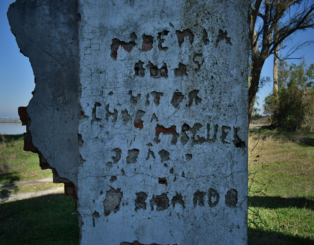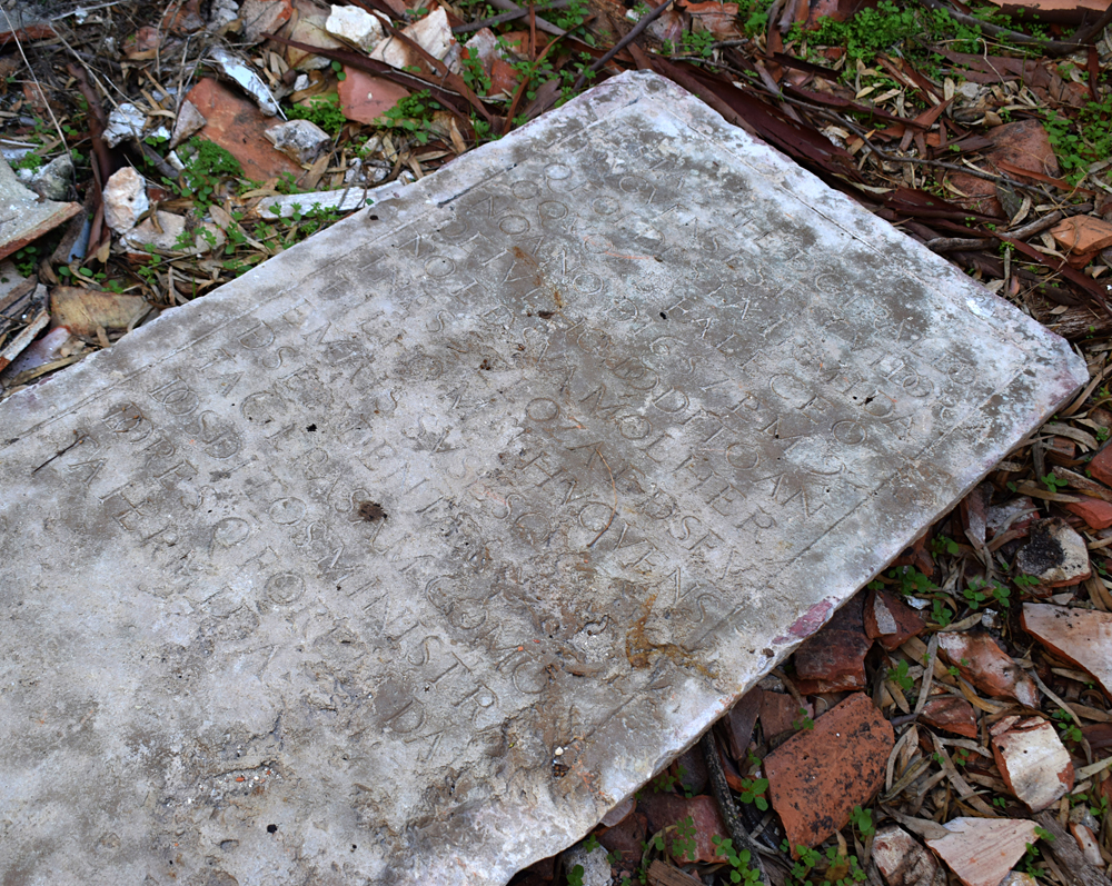 Avançant lentement, je crois deviner une chapelle. Un lieu de prière privé pour la famille comme on en trouve souvent dans ce genre de domaine. Le style architectural rappelle les églises espagnoles ou mexicaines, et malheureusement la cloche a disparu. A l’intérieur, aucune trace de l’autel ou autres objets de cultes. Au sol, un dalle est tout de même toujours là. Mes connaissances en latin ou en portugais étant limitées, je ne comprends pas ce qui est gravé, mais qui sait, peut-être que quelqu’un m’écrira un jour. Cliquez ici si vous voulez voir la photo en taille originale. |