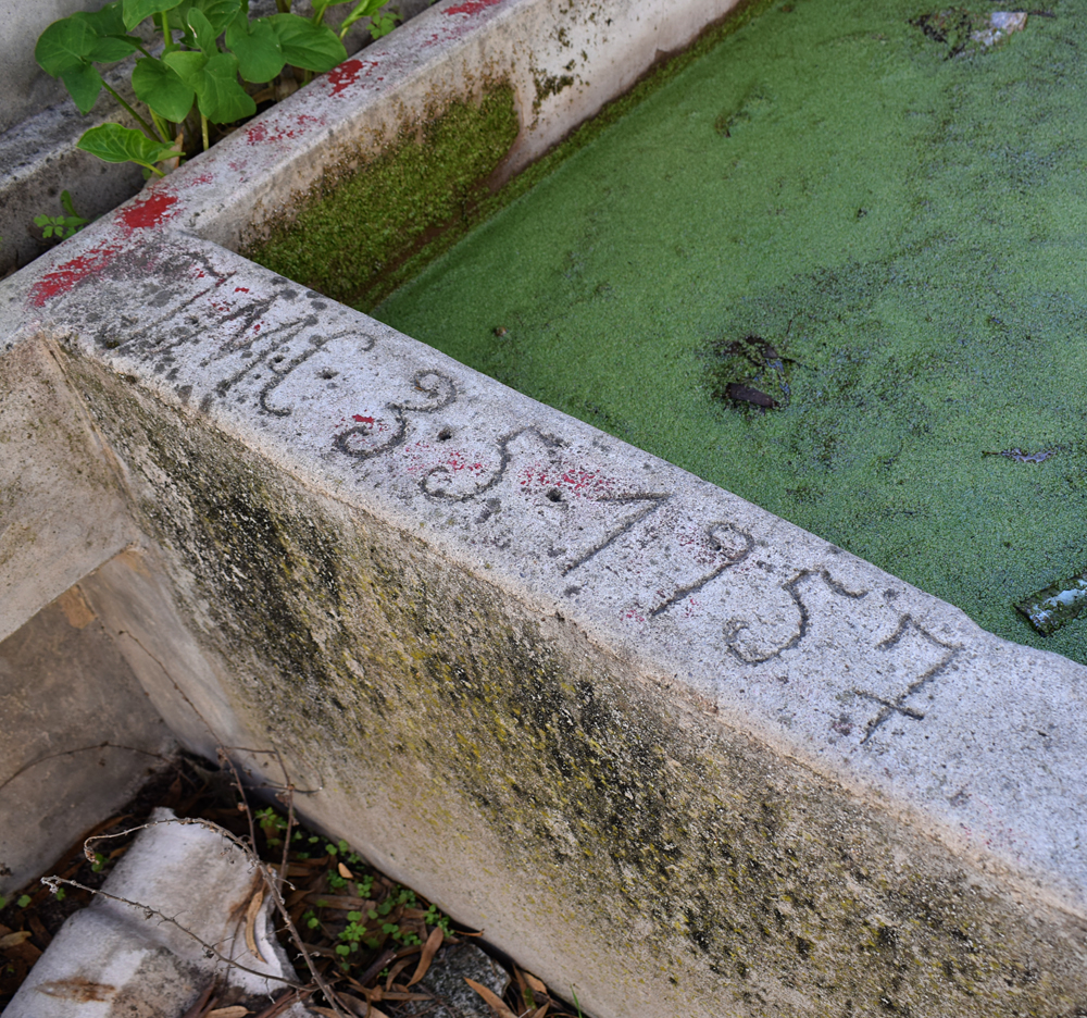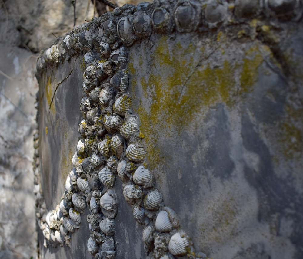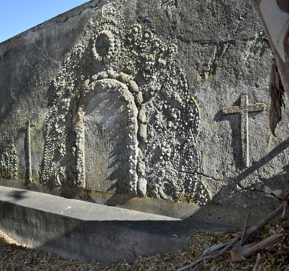Plus loin, à côté de magnifiques arches (à la fonction énigmatique) je crois voir un décor en relief. Je m’approche et en effet, je découvre un bassin orné de motifs en stuc et de guirlandes de coquillages entourés de croix chrétienne. Un décor plutôt rococo qui habille admirablement ce mur d’enceinte. Je prends le temps de profiter de ce bel endroit où je ne cesse de me repasser la musique du film «Pour une poignée de dollars», dont je ne me lasse jamais. Si je me laisse aller, je pourrais presque piquer un petit somme à l’ombre d’un palmier. |