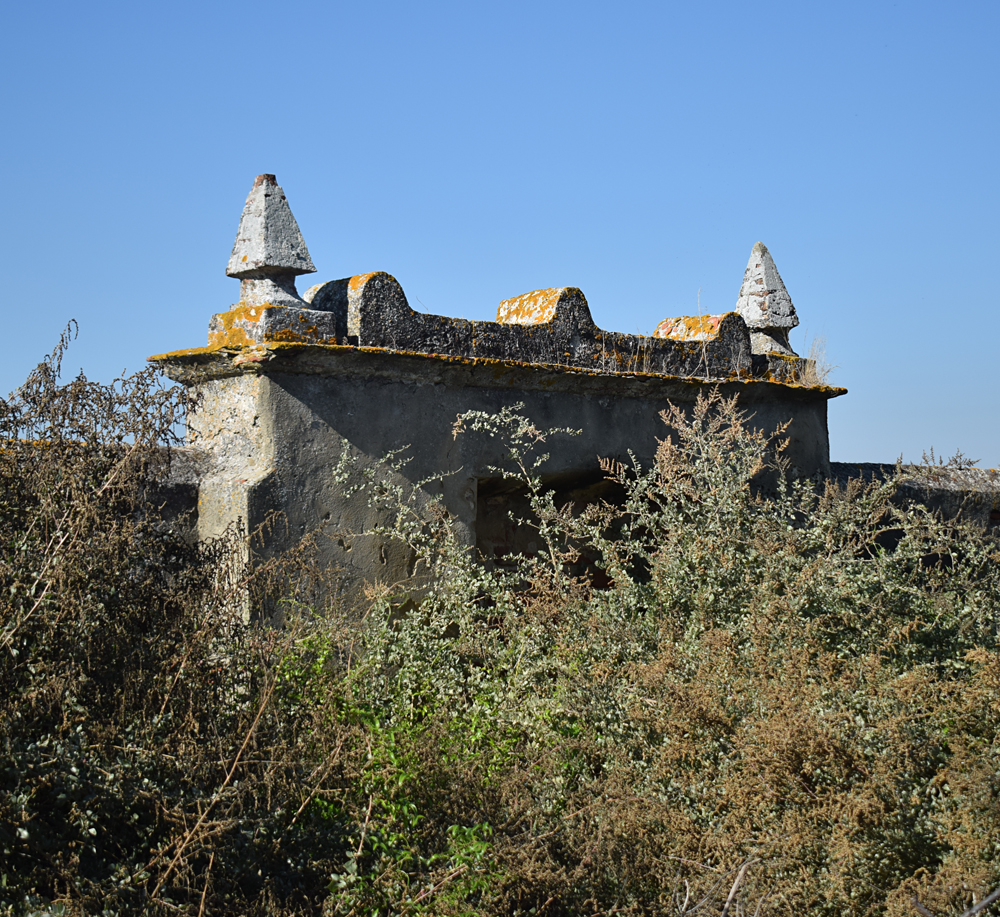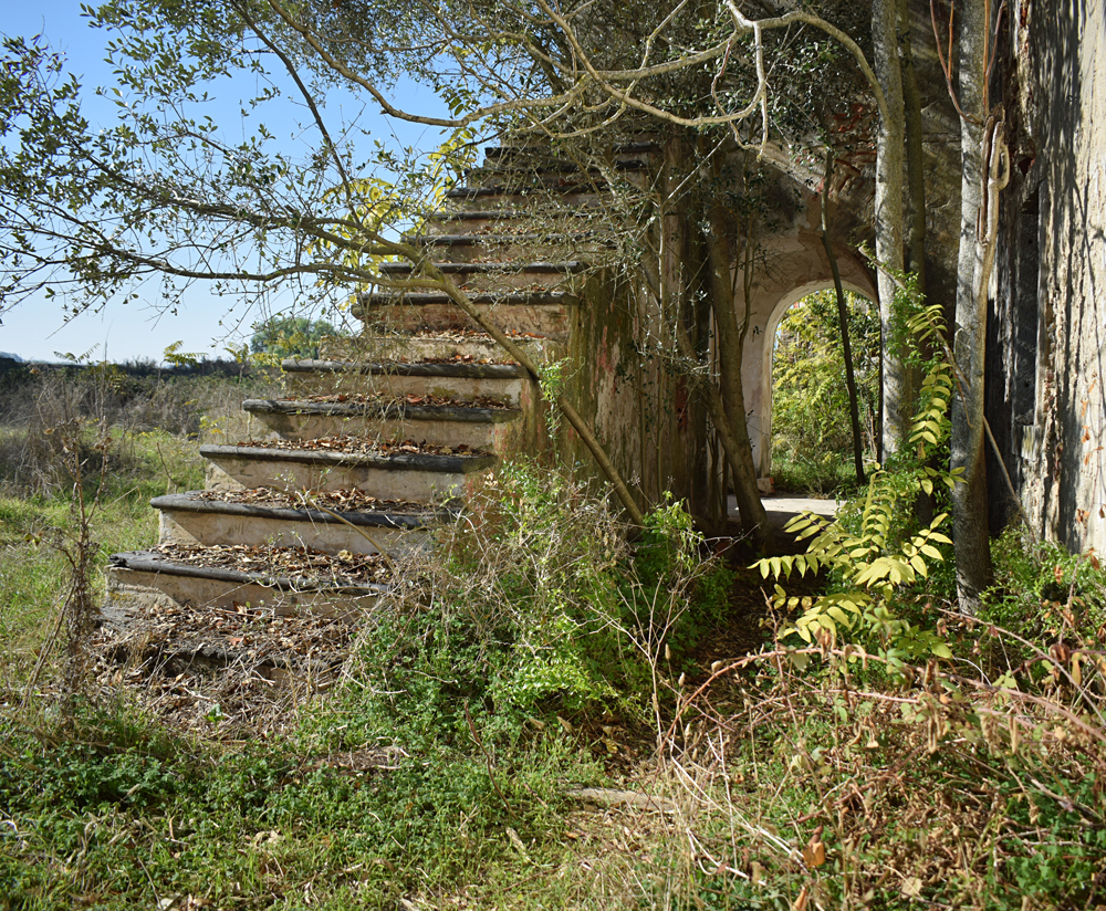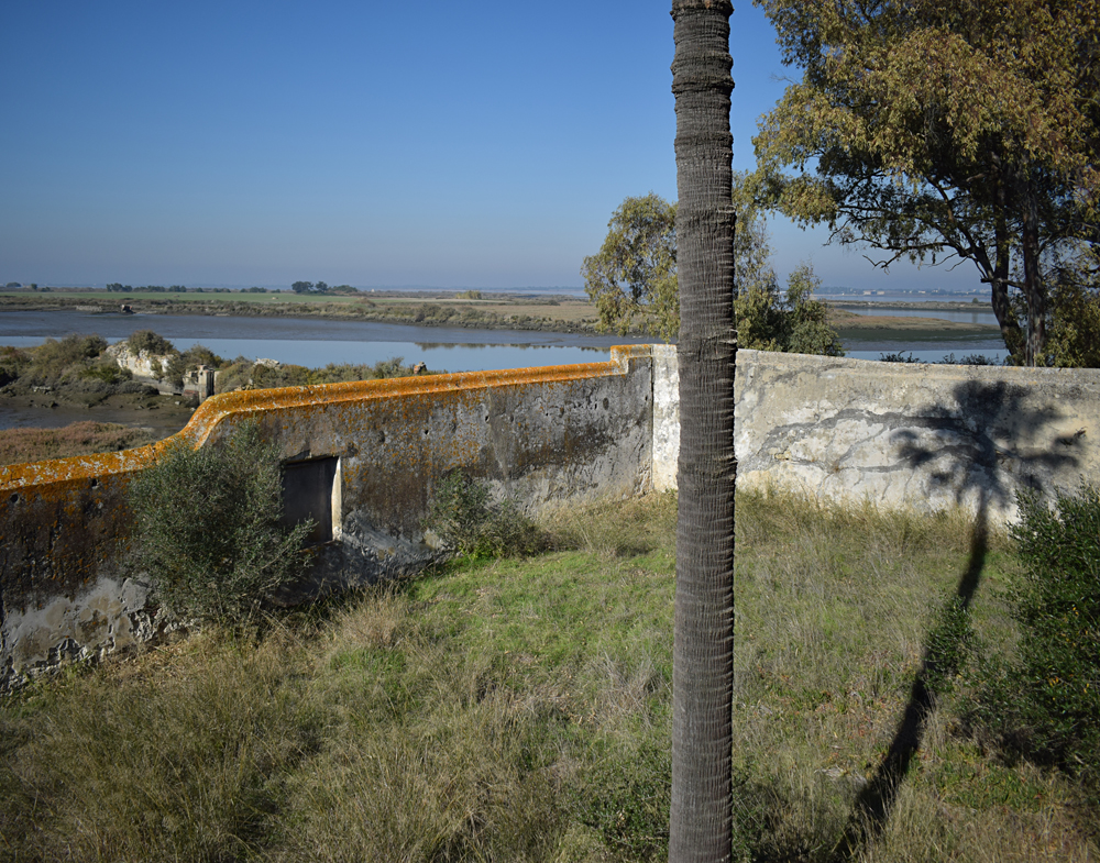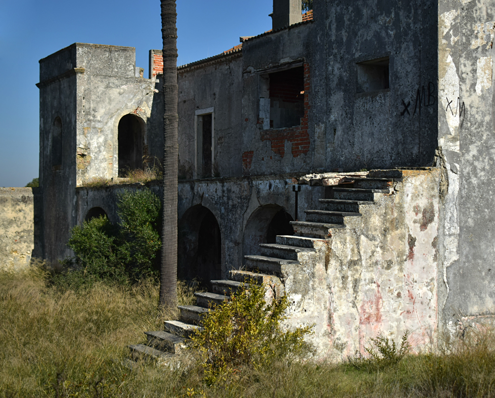 Faisant le tour du bâtiment, j’arrive à un point de vue particulièrement photogénique, avec les deux cours carrées et le palmier ayant poussé à côté. Ces éléments et l’escalier permettant d’accéder à une petite terrasse (bien trop dangereuse pour y monter) composent un tableau assez magnifique, que je suis très heureux de documenter. Chose qui fait plaisir aussi : pas un seul tag sur les murs de la bâtisse ! Montant les marches de l’escalier, j’admire le temps d’un court instant la vue sur le marais, que l’on ne voit pas du tout en temps normal à cause du mur ceinturant la quinta. |