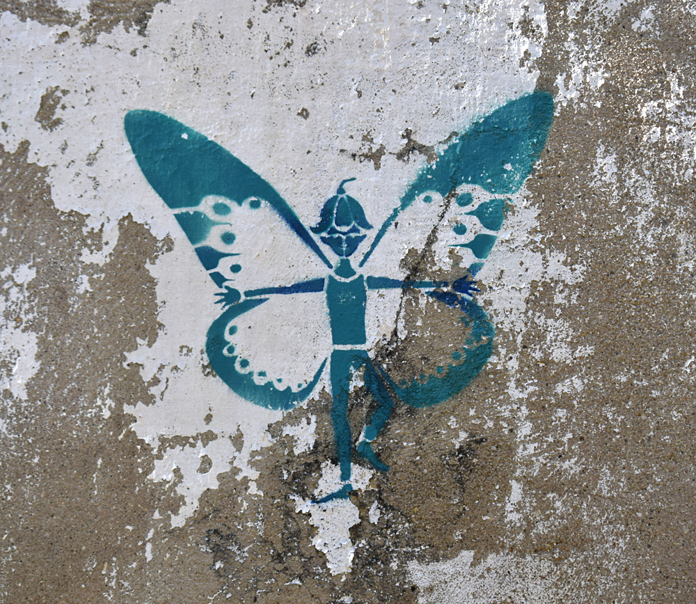 La visite est-elle terminée ? Il semble que oui. Revenant sur mes pas, je découvre un relief religieux plutôt joli non loin des arches vues auparavant. Ici aussi on a pris soin de coller des coquillages au mur. Une jolie vision qui clôt en beauté cette exploration… Mais ce n’est pas tout ! Au moment de repartir je tombe sur deux choses intéressantes : 1) un pochoir de personnage papillon vraiment réussi avec son chapeau clochette 2) des inscriptions très probablement gravées par de précédents visiteurs : je distingue «Noemia» et «Miguel». |