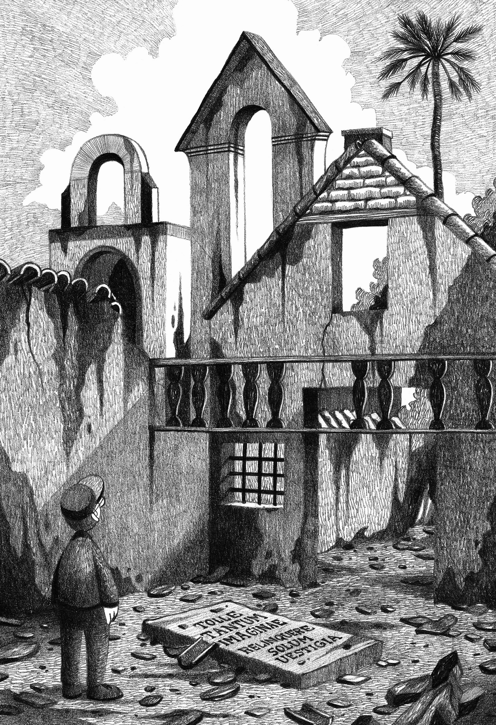 Ci-dessous le dessin réalisé pour le livre «Urbex Europe». J’ai pris la liberté d’inscrire quelque chose sur la tombe : «TOLLE TANTUM IMAGINAE / RELINQUERE SOLUM UESTIGIA» qui se traduirait par «Ne prenez que des images, ne laissez que des traces», variation sur la fameuse devise « Take Nothing But Pictures, Leave Nothing But Footprints» («Ne prenez rien d'autre que des photos, ne laissez rien d'autre que des empreintes de pas») |