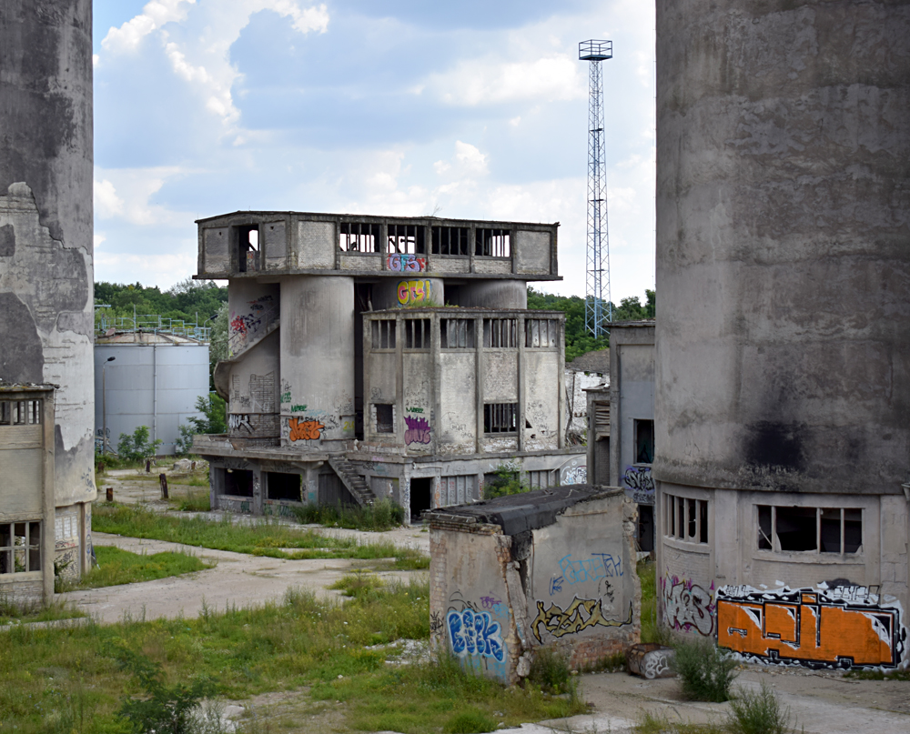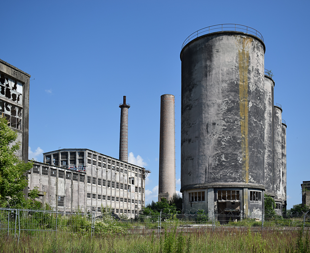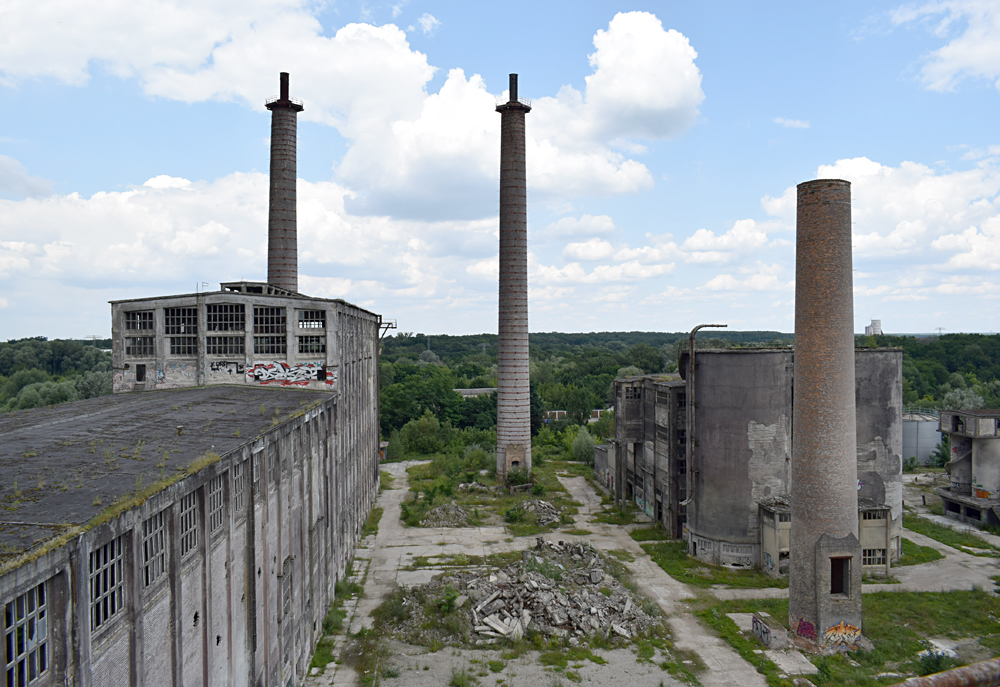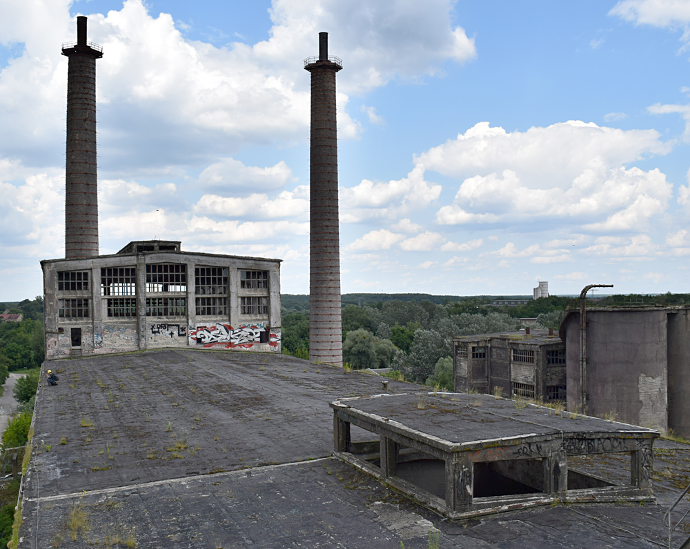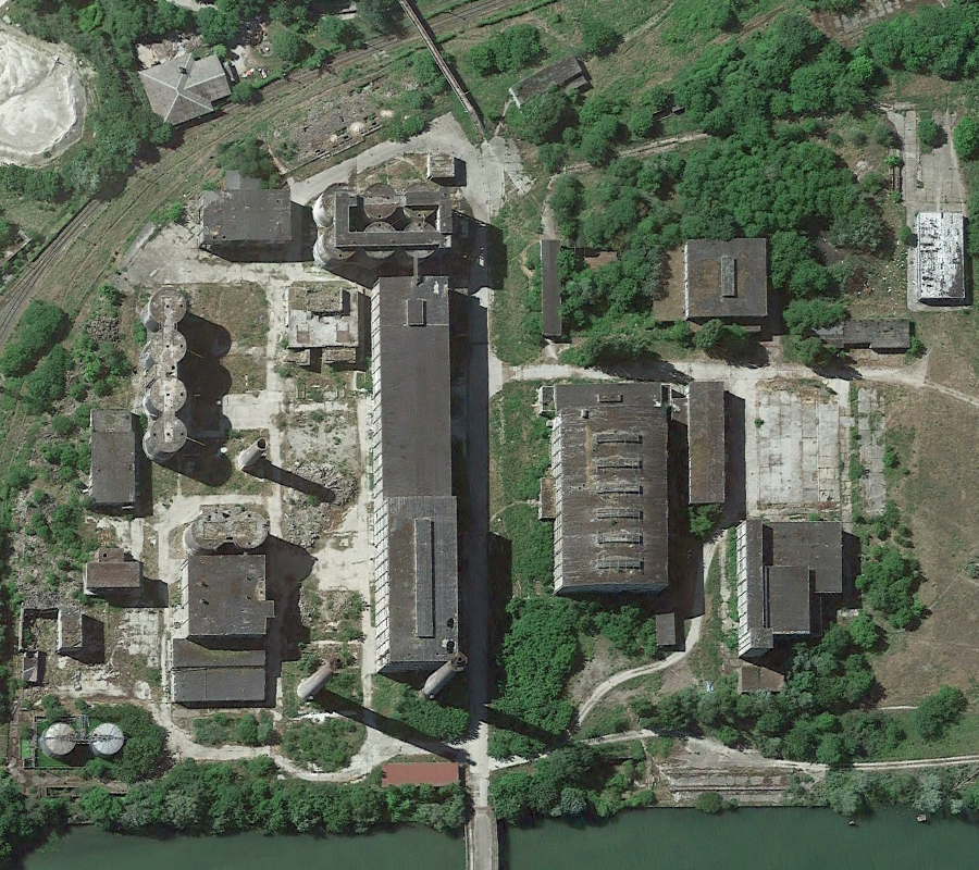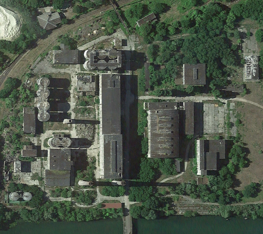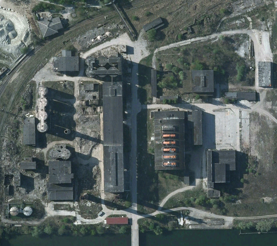 L’histoire de cette usine nous emmène au début du XXème siècle. Conçue pour produire du ciment, l’usine servit à produire de la bauxite synthétique de 1939 à 1944 lorsque les Nazis utilisèrent le lieu pour l’effort de guerre. Après l’arrivée des Russes en 1945, l’usine fut démantelée, mais dès 1950 elle reprit vie, cette fois-ci pour fabriquer des produits à base de phosphate. Au cours des 7 années qui suivirent, l’usine fut agrandie et de nouveaux bâtiments construits. La réunification sonna la fin du site, comme pour de nombreuses autres usines. Le dernier repas eut lieu en 1999. Ci-dessous des vues aériennes allant de 2001 à 2023 : |