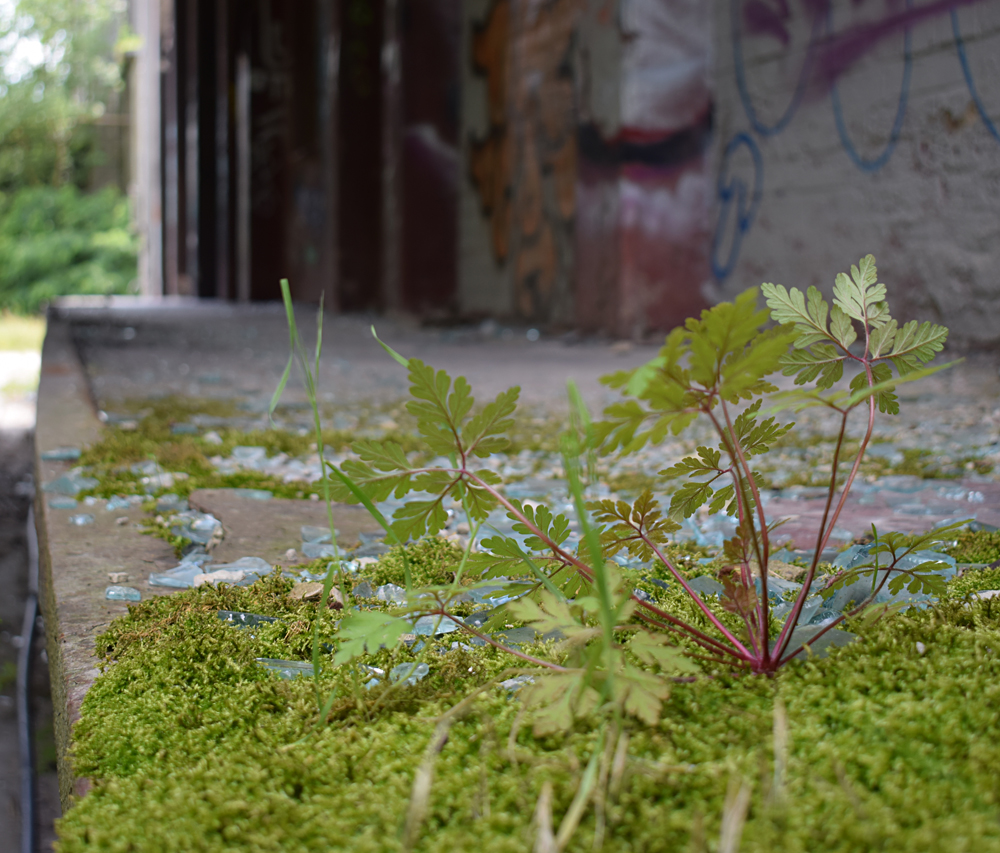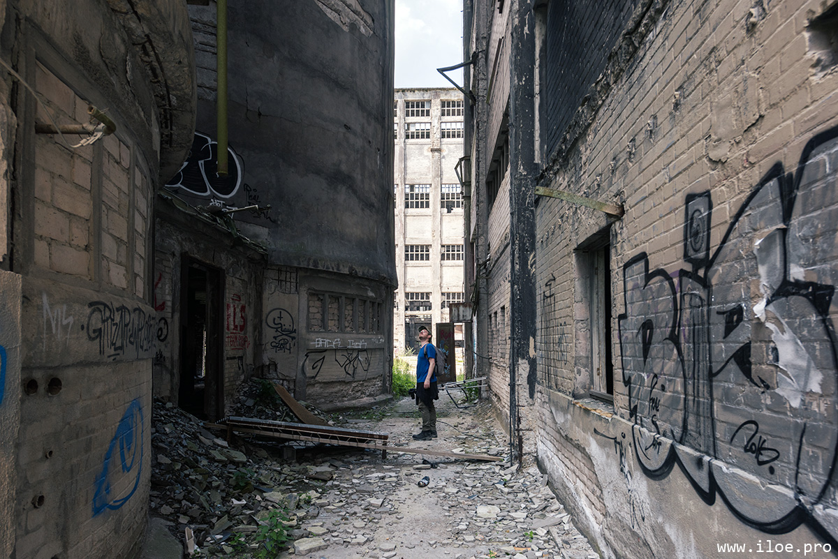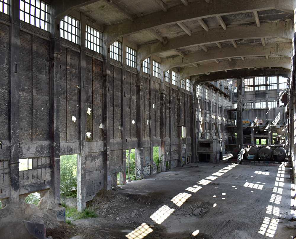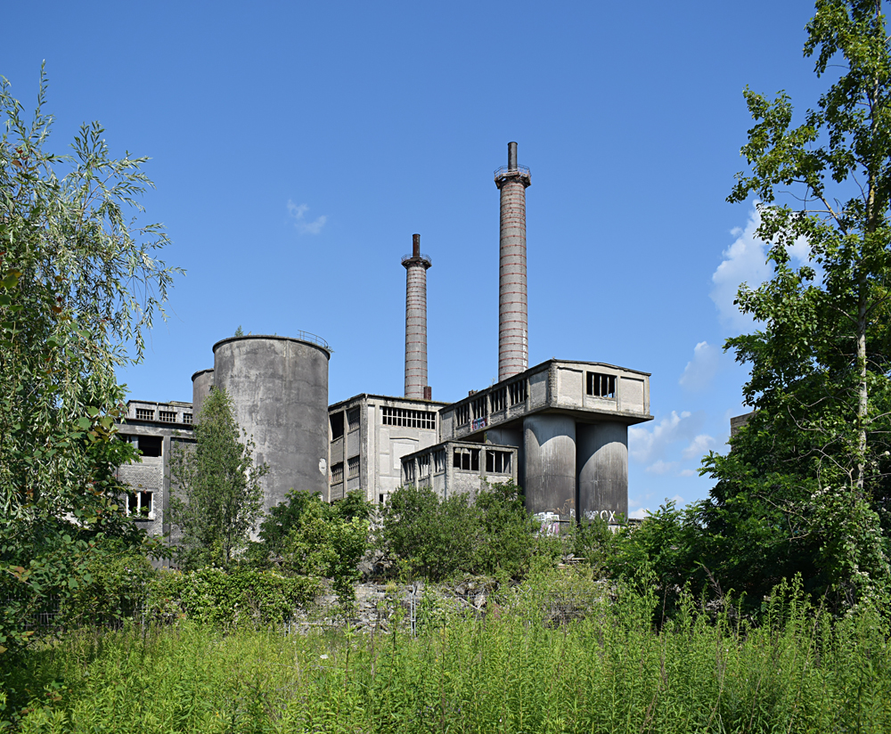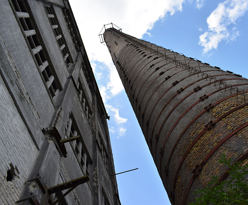 2017. L’arrivée sur place est tout simplement magnifique : traversant la rivière, nous contemplons les deux immenses cheminées que nous avions aperçus de loin avant d’arriver sur place, émergeant de la forêt telles de sombres totems. Face à l’immensité du site et sa beauté, nous redoutons que le site soit gardé, et nous longeons le grillage en croisant les doigts pour trouver un passage. Après une dizaine de minutes à marcher le long de la voie ferrée, bingo, un accès. Marchant à pas de loup dans les hautes herbes, nous jetons en permanence des coups d’yeux à droite à gauche afin de voir si le site n’est pas surveillé. Evitant les allées centrales, nous nous dirigeons vers le plus grand bâtiment : quitte à se faire attraper, autant réussir à explorer celui-là avant ! |