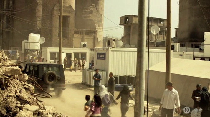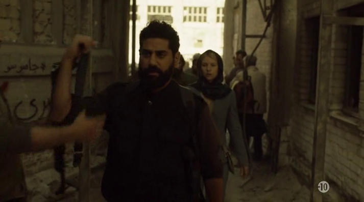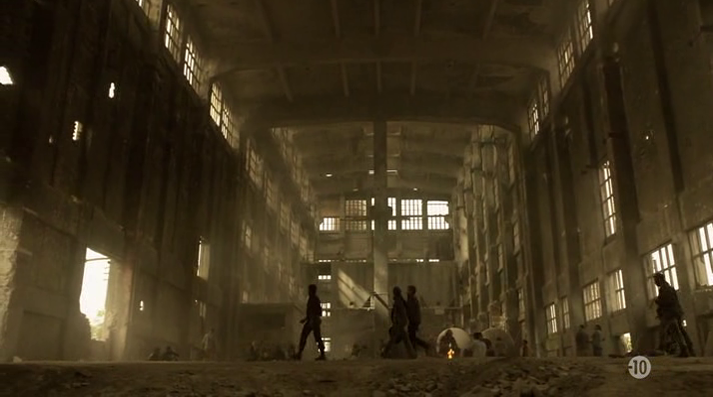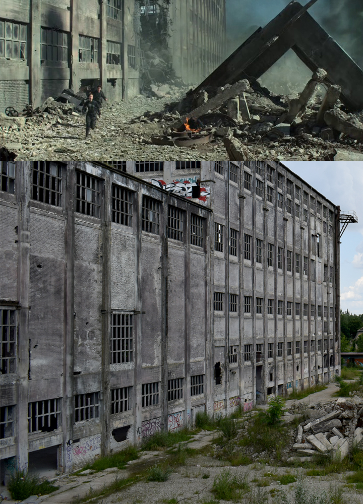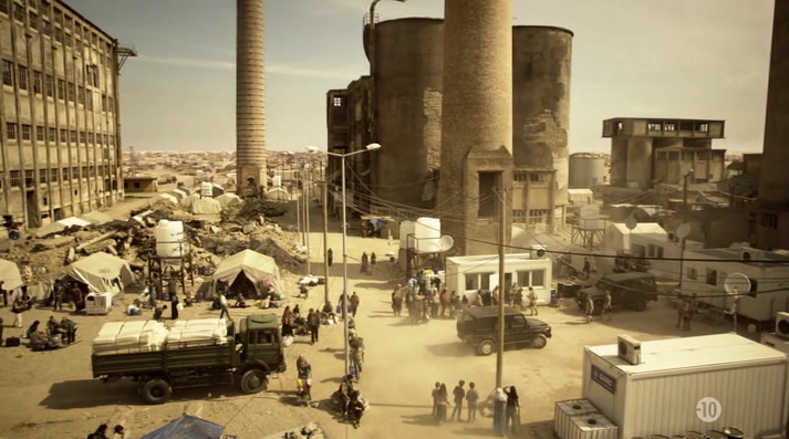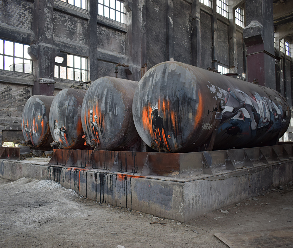 Anecdote : au cours de notre visite, nous remarquons des tags en arabe. Trouvant curieux de voir des tags dans cette langue sur un site pareil, je fais une petite recherche à propos de l’histoire de cette usine, et quelle n’est pas ma surprise de voir qu’un épisode de la série «Homeland» y a été tourné ! Un épisode dans lequel l’usine est utilisée comme décor pour figurer la Libye : cela explique donc les tags en arabe, mais aussi divers faux murs en carton-pâte aperçus sur place… J’ai également appris que parmi ces tags, certains dénonçaient le racisme de cette série, leur signification ayant échappé à la production ne vérifiant pas leur signification. Ci-dessous des captures de l’épisode de «Homeland» dans lequel on reconnait bien l’usine : |