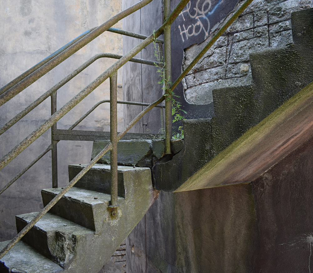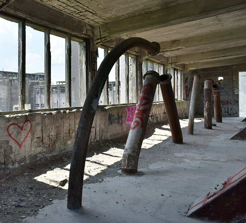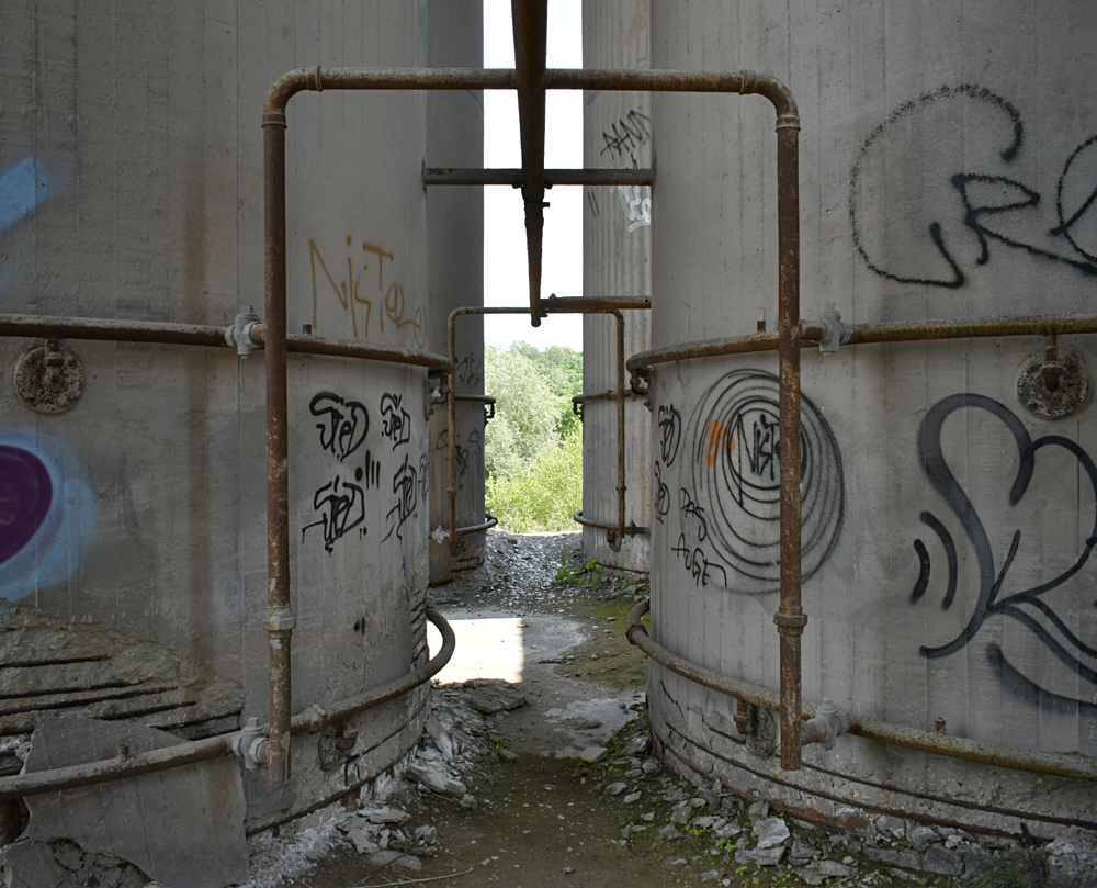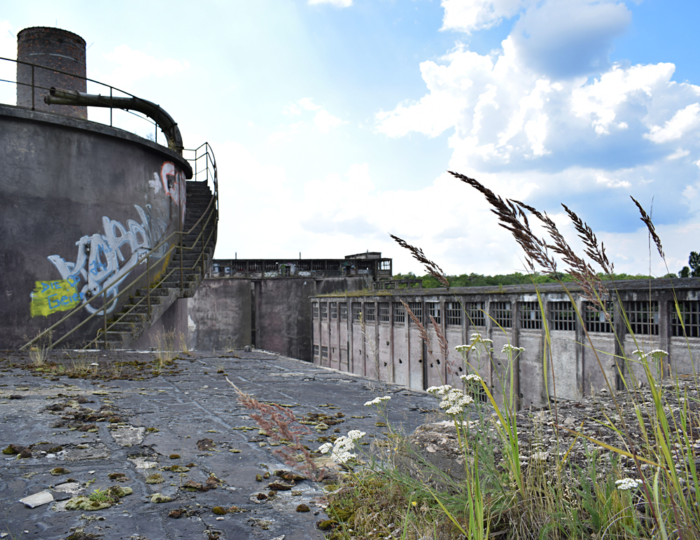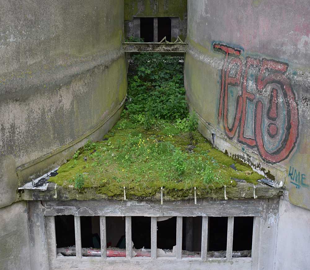 La visite continue avec d’autres bâtiments tout aussi massifs et présentant également des points de vue saisissants si l’on prend le temps de grimper à leur sommet. Immenses halls, escaliers tournant autour des silos, passerelles métalliques incertaines, toit où pousse de la végétation… |