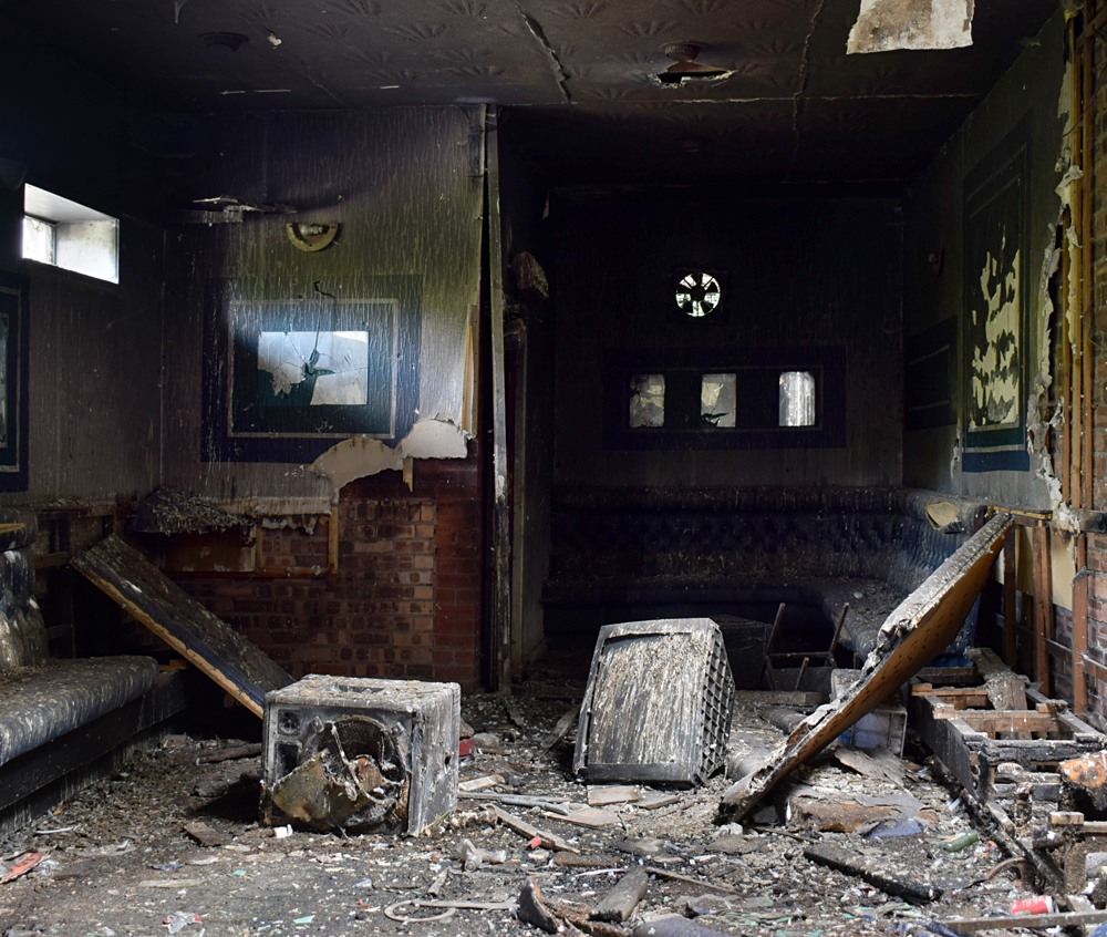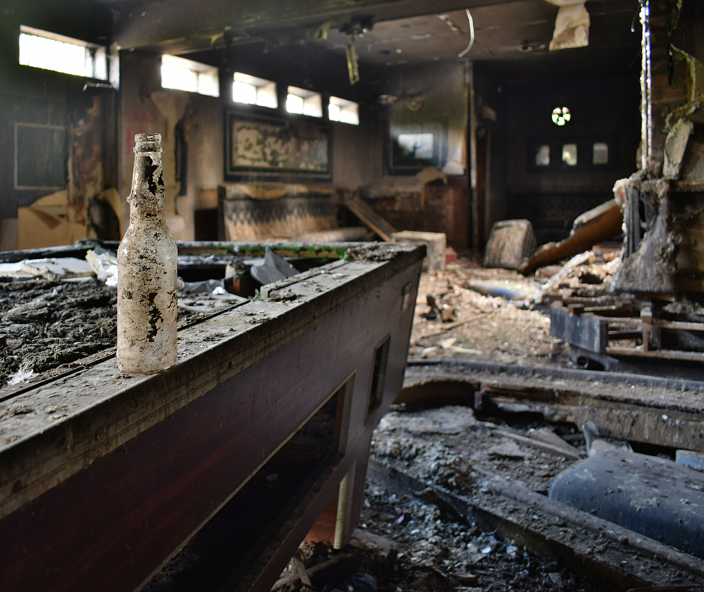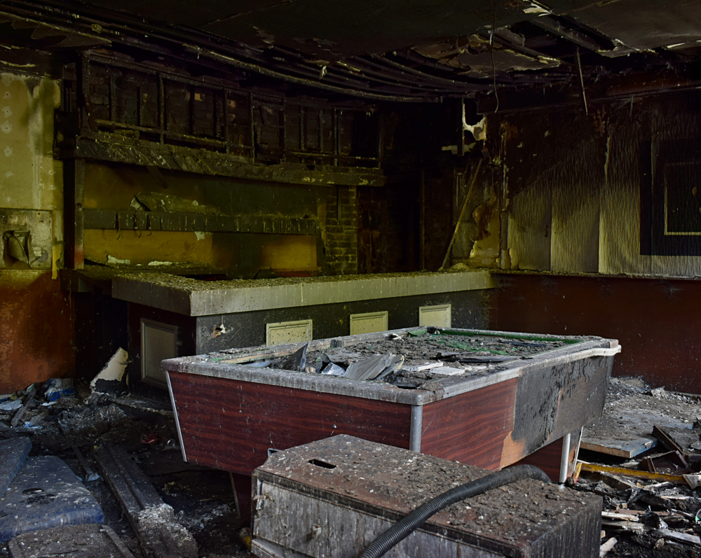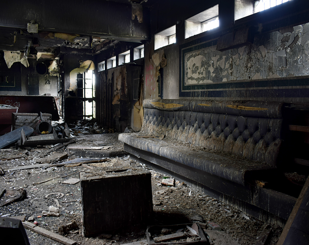 A l’intérieur, tout est détruit mais est resté en place. Le feu a dû se déclarer subitement sans que le propriétaire ne puisse sauver le mobilier. Le sol est jonché de débris, les banquettes en simili cuir ont fondu sous l’effet de la chaleur, les meubles sont en mille morceaux, les tentures et les décorations dévastées... Quel carnage ! Tandis que je fais des clichés de ce qui reste du pub, j’entends des voix, des éclats de rire, des cris, des chants à proximité. Curieux de comprendre ce qui se passe, je sors mon smartphone, ouvre Google Maps, active la géolocalisation, et découvre qu’il y a un autre pub juste à côté de celui que je visite. Les clients se seraient-ils reportés sur celui-ci après l’incendie ? L’histoire ne le dit pas, mais pour moi, c’est comme si je découvrais l’ambiance qui avait pu animer le lounge à sa bonne époque. Entendre tout ça alors que je suis dans ces ruines est une expérience particulière. |