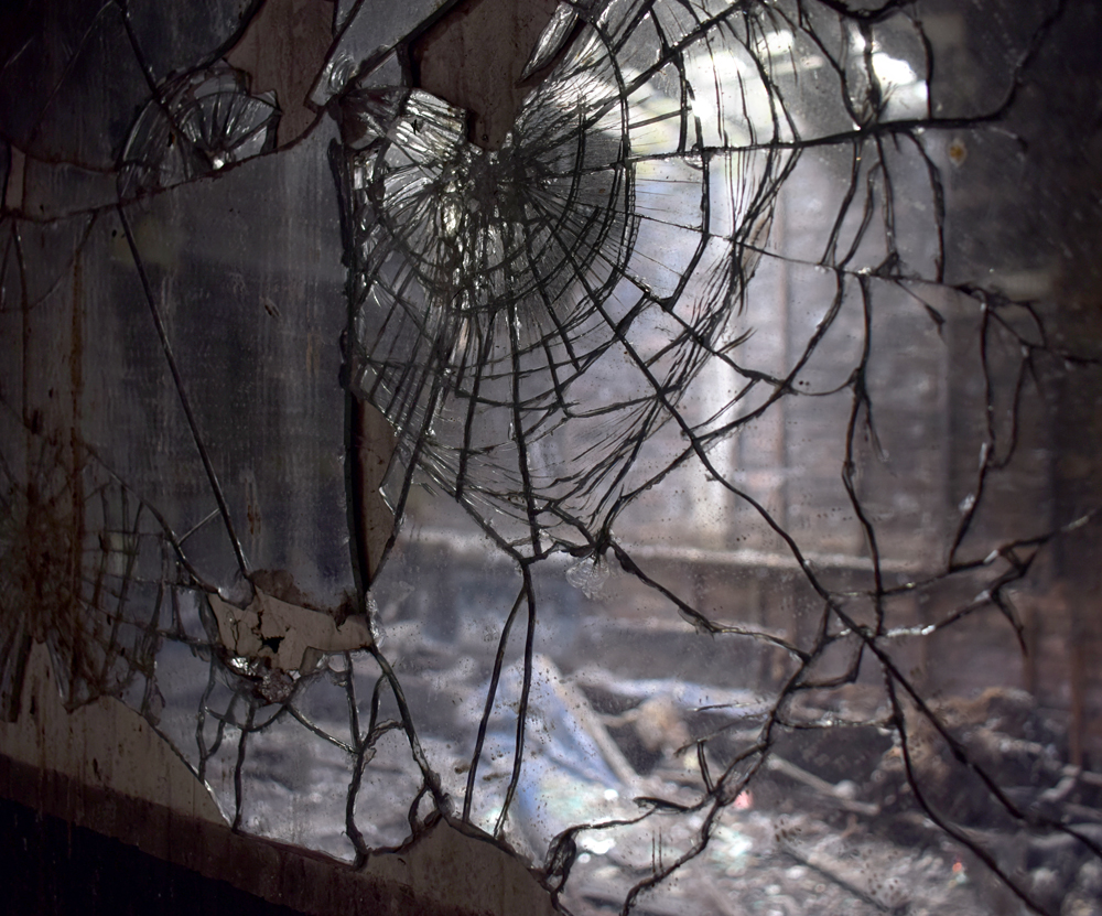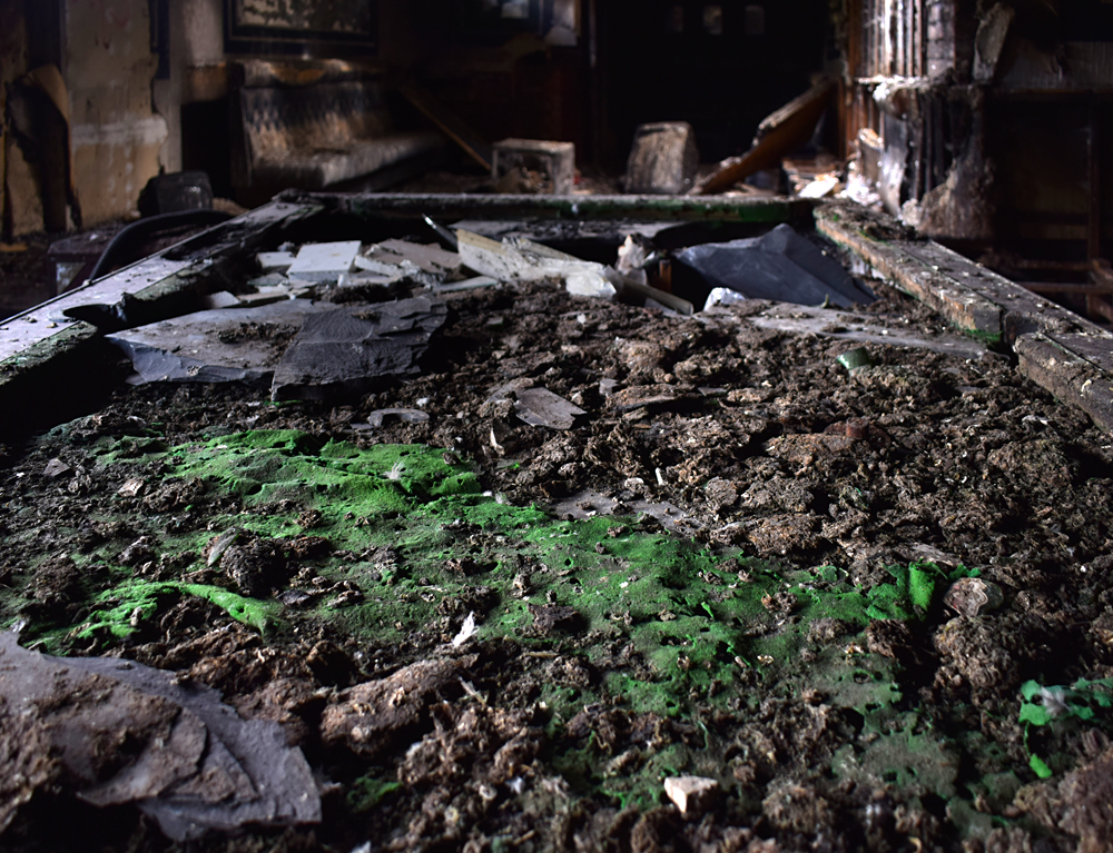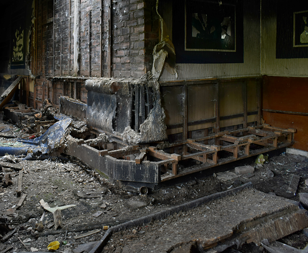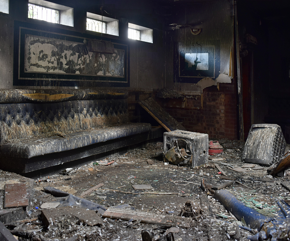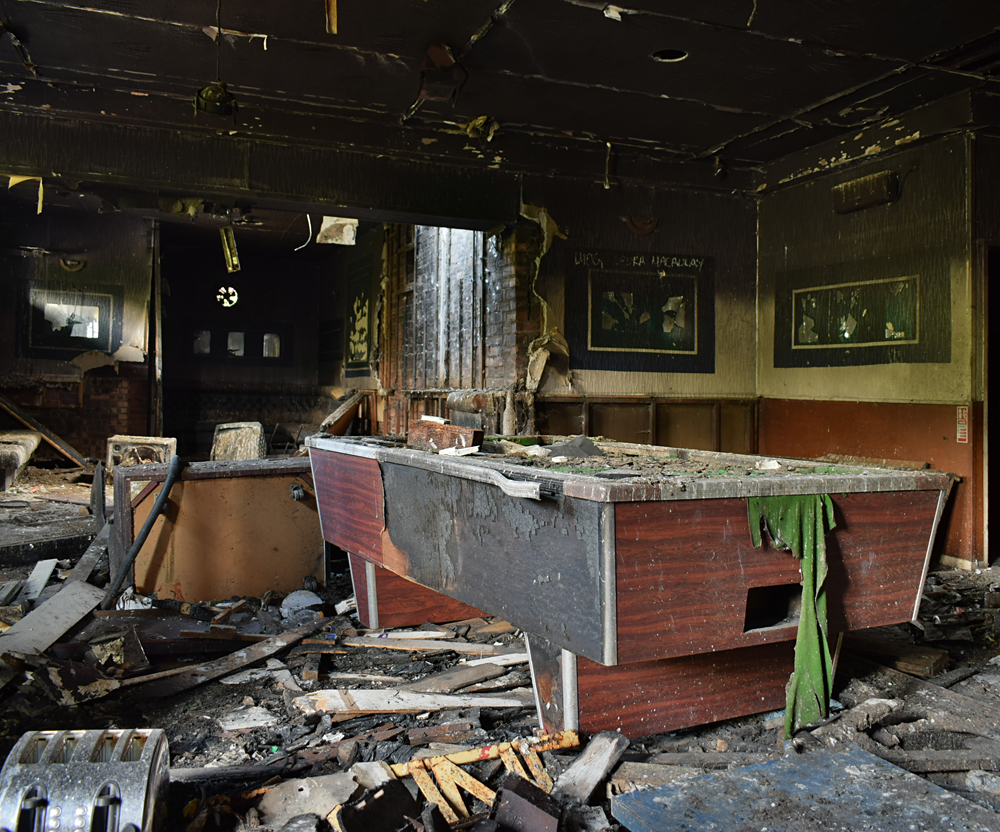 A l’intérieur, tout est détruit mais est resté en place. Le feu a dû se déclarer subitement sans que le propriétaire ne puisse sauver le mobilier. Le sol est jonché de débris, les banquettes en simili cuir ont fondu sous l’effet de la chaleur, les meubles sont en mille morceaux, les tentures et les décorations dévastées... Quel carnage ! Tandis que je fais des clichés de ce qui reste du pub, j’entends des voix, des éclats de rire, des cris, des chants à proximité. Curieux de comprendre ce qui se passe, je sors mon smartphone, ouvre Google Maps, active la géolocalisation, et découvre qu’il y a un autre pub juste à côté de celui que je visite. Les clients se seraient-ils reportés sur celui-ci après l’incendie ? L’histoire ne le dit pas, mais pour moi, c’est comme si je découvrais l’ambiance qui avait pu animer le lounge à sa bonne époque. Entendre tout ça alors que je suis dans ces ruines est une expérience particulière. |