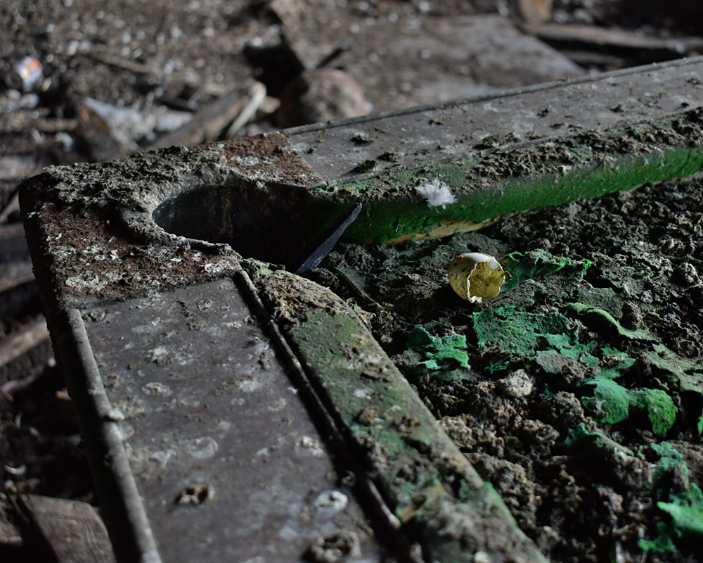 Au milieu de la pièce, le billard est toujours là. Le tapis vert ne ressemble plus à rien, le fond est percé et la boule blanche, dernière rescapée du jeu, est à moitié cramée. Une odeur pestilentielle m’oblige à me boucher le nez et à constater qu’une nouvelle clientèle a pris possession des lieux : une dizaine de pigeons, effrayés par ma présence - et moi par la leur. C’est sur cette curieuse impression d’être surveillé par les pigeons que se termine cette très courte visite. |