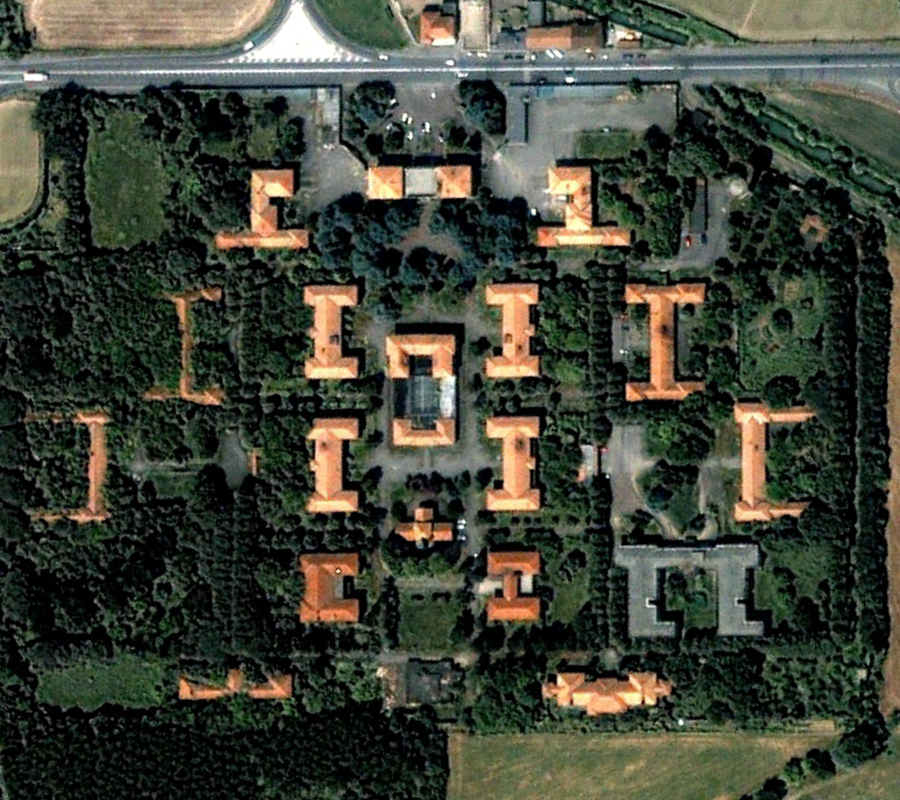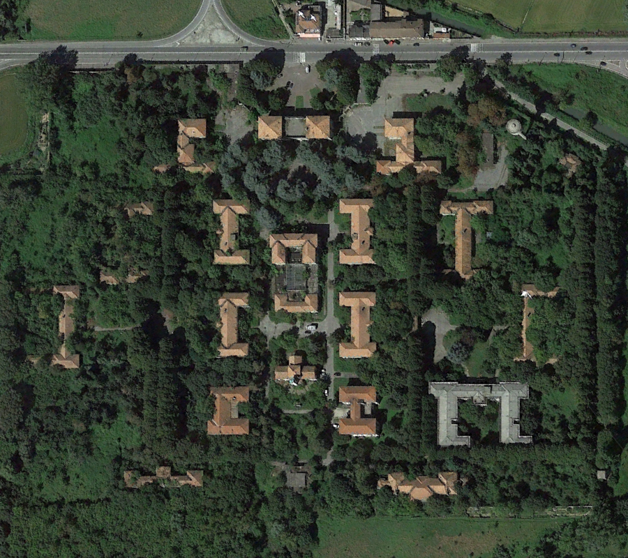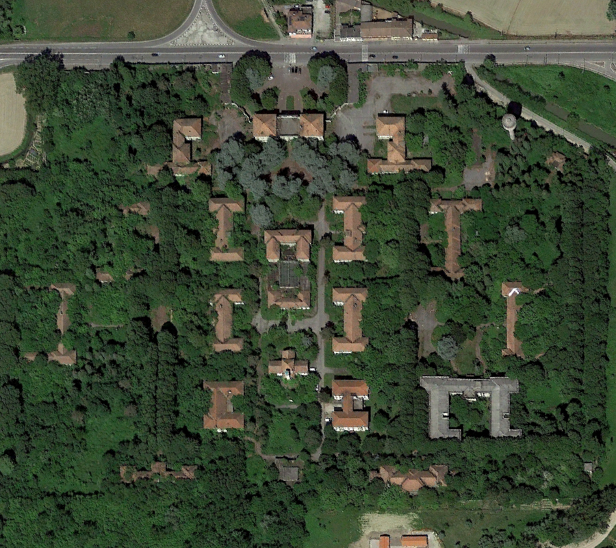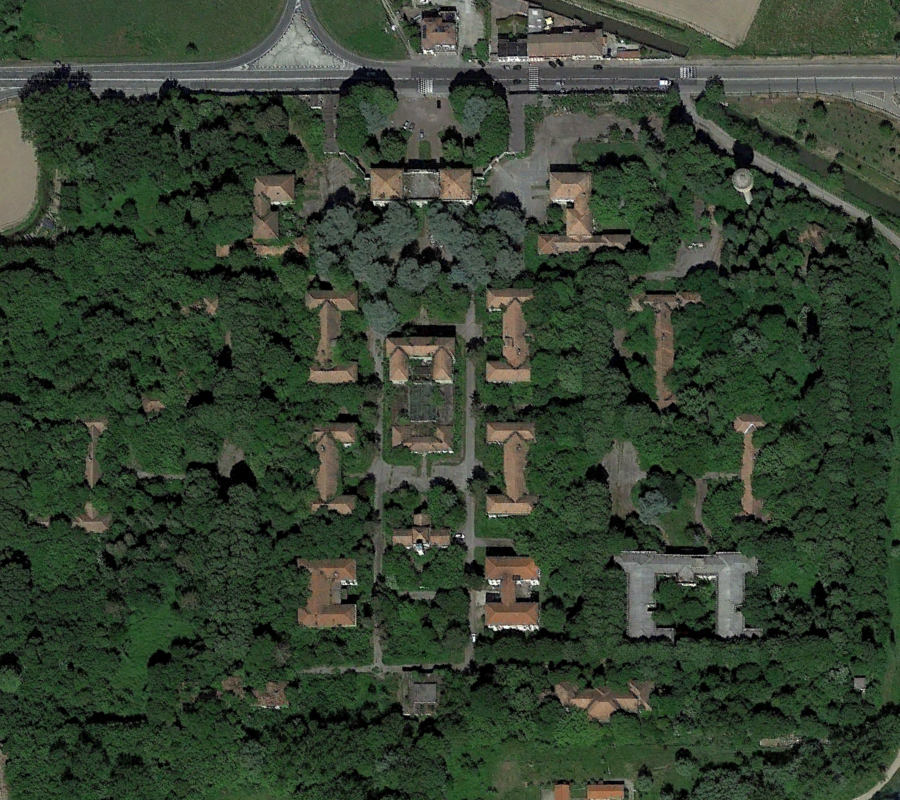 Construit au début des années 30, ce lieu fut le théâtre d’un événement particulièrement sanglant qui eut lieu la fin de la Deuxième Guerre Mondiale. Après avoir capturé des miliciens fascistes, des résistants communistes réquisitionnèrent l’hôpital psychiatrique pour les y exécuter, faisant une soixantaine de morts. Une stèle fut érigée sur place en mémoire du massacre de ces prisonniers. L’hôpital continua à fonctionner en totalité jusqu’au début des années 90, période à partir de laquelle de nombreux bâtiments furent abandonnés. Ci-dessous des vues aériennes allant de 2001 à 2023 : |