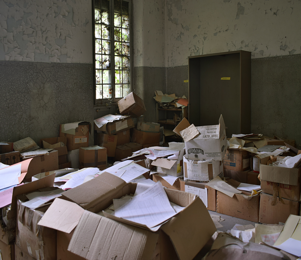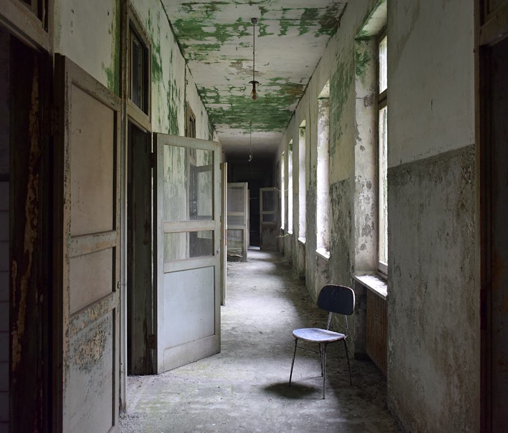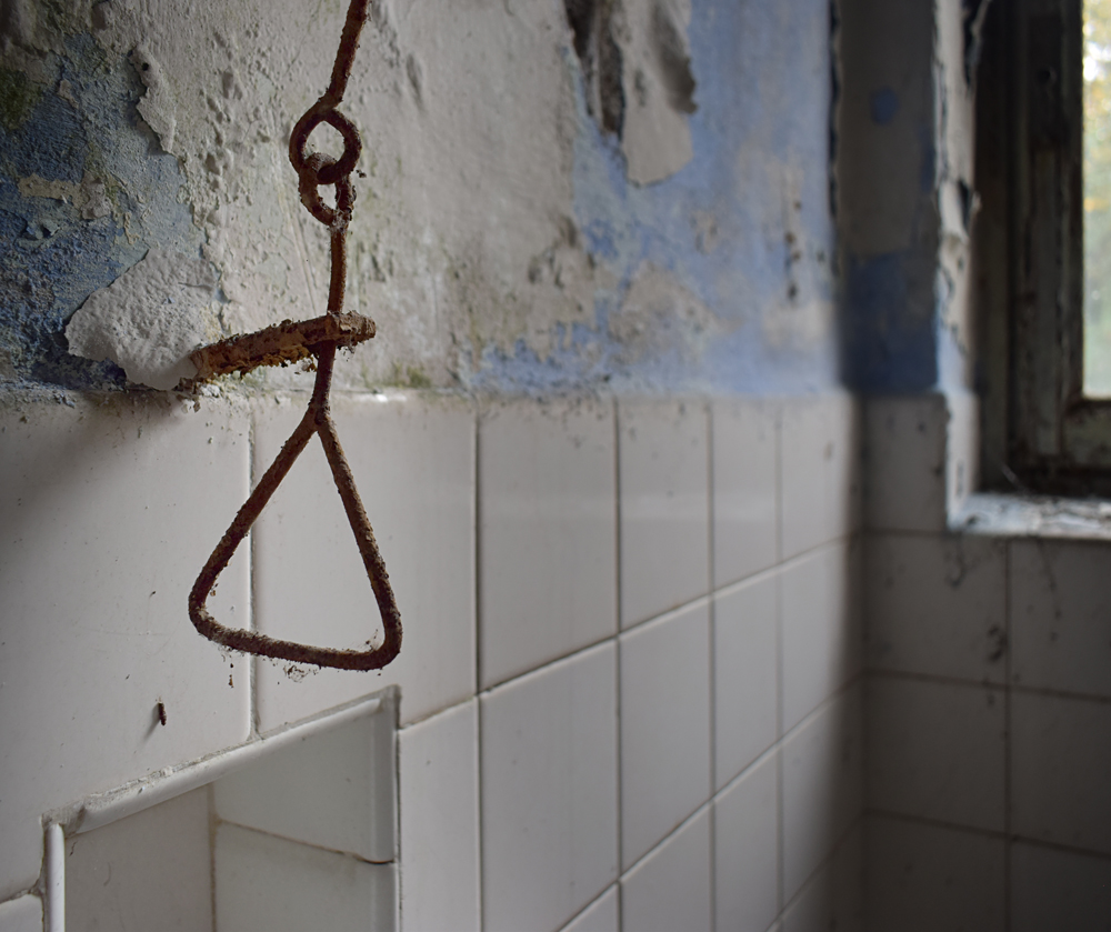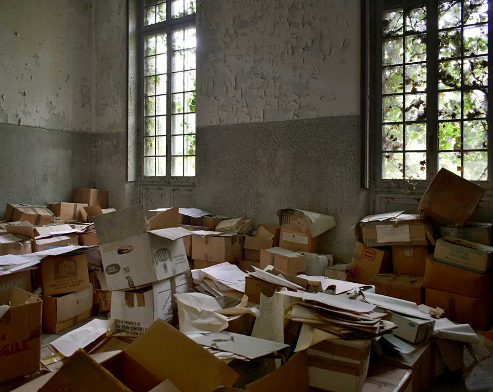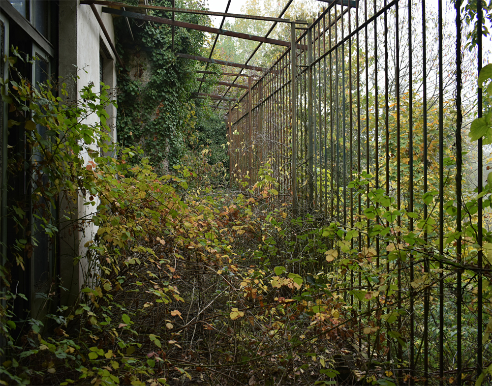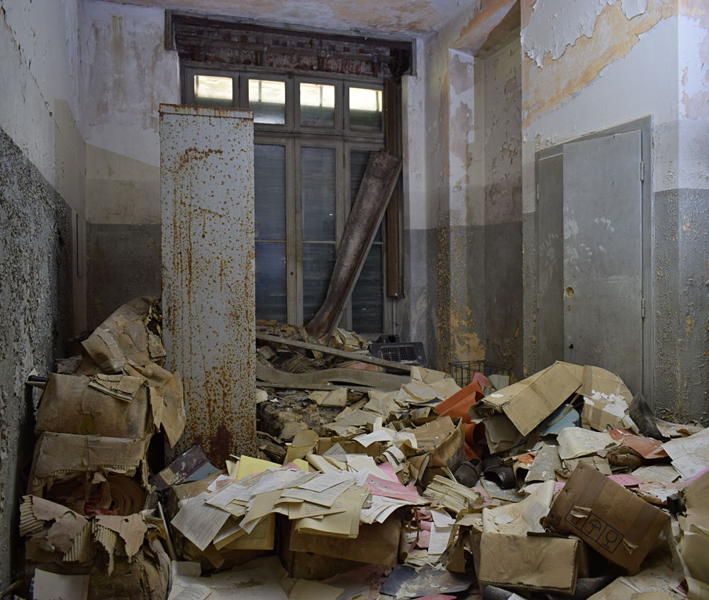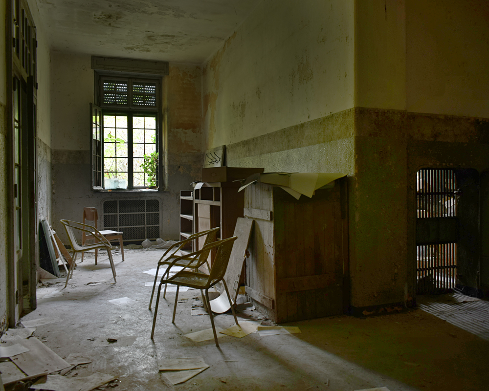 2017. En regardant la vue satellite, je remarque que le lieu est immense. Ayant appris que certains des bâtiments sont encore actifs, je me dis qu’il nous faudra être très discrets pour explorer les bâtiments abandonnés sans se faire voir par d’éventuels personnes travaillant encore sur place. Une fois sur garés à proximité, tout est en fait plus simple que prévu : bien que nous soyons en automne, la végétation est encore très présente, nous rendant presque invisibles en passant d’un bâtiment à un autre. Le fait que le site soit immense et ouvert aux quatre vents (trous dans le grillage un peu partout) est heureux : en cas de fuite, nous n’aurons pas de souci à trouver un point de fuite. Nos pas nous mènent de pavillons en pavillons, certains en très mauvais état dû à un manque d’entretien depuis trop longtemps. Toiture endommagée suite aux intempéries, humidité très présente à cause des nombreuses vitres manquantes… Je suis cependant surpris que ce que nous explorions ne soit pas si dégradé que ça compte tenu de la facilité d’accès. Le fait que le site soit un peu reculé doit évidemment beaucoup jouer, mais tout de même, visiter un lieu de ce type et trouver un seul tag dans un bâtiment comportant plus de 30 chambres, c’est très rare. Ces rares tags ici et là nous indiquent que nous ne sommes pas les premiers à venir, mais à part ça, c’est presque comme si personne ne venait sur place, ou alors très rarement. Autre fait étonnant : les archives. Il y en a encore beaucoup ! Au point que cela prendrait une journée entière pour savoir jusqu’à quand elles remontent. Cartons, dossiers, documents divers : tout est encore là, rassemblé dans des pièces très facilement accessibles. Consulter ces archives et découvrir les barreaux fixés aux barreaux aux balcons du premier étage est une expérience particulière. Je m’imagine les patients internés ici, les barreaux les empêchant de sauter : un peu glaçant. |