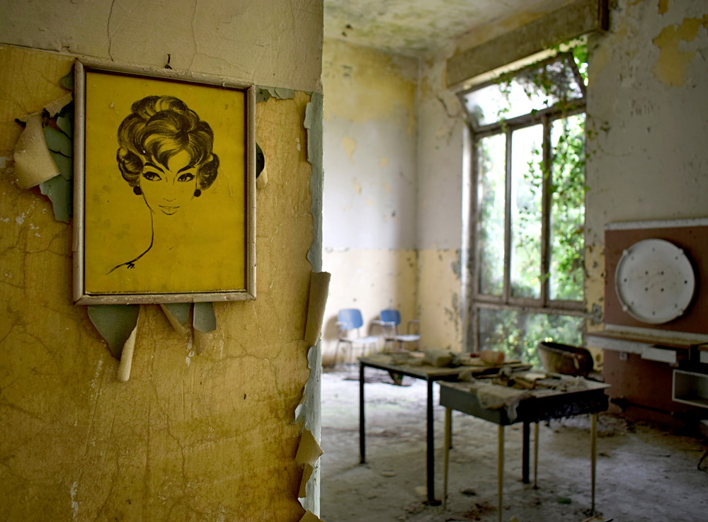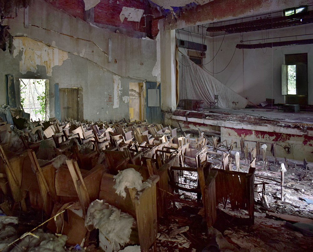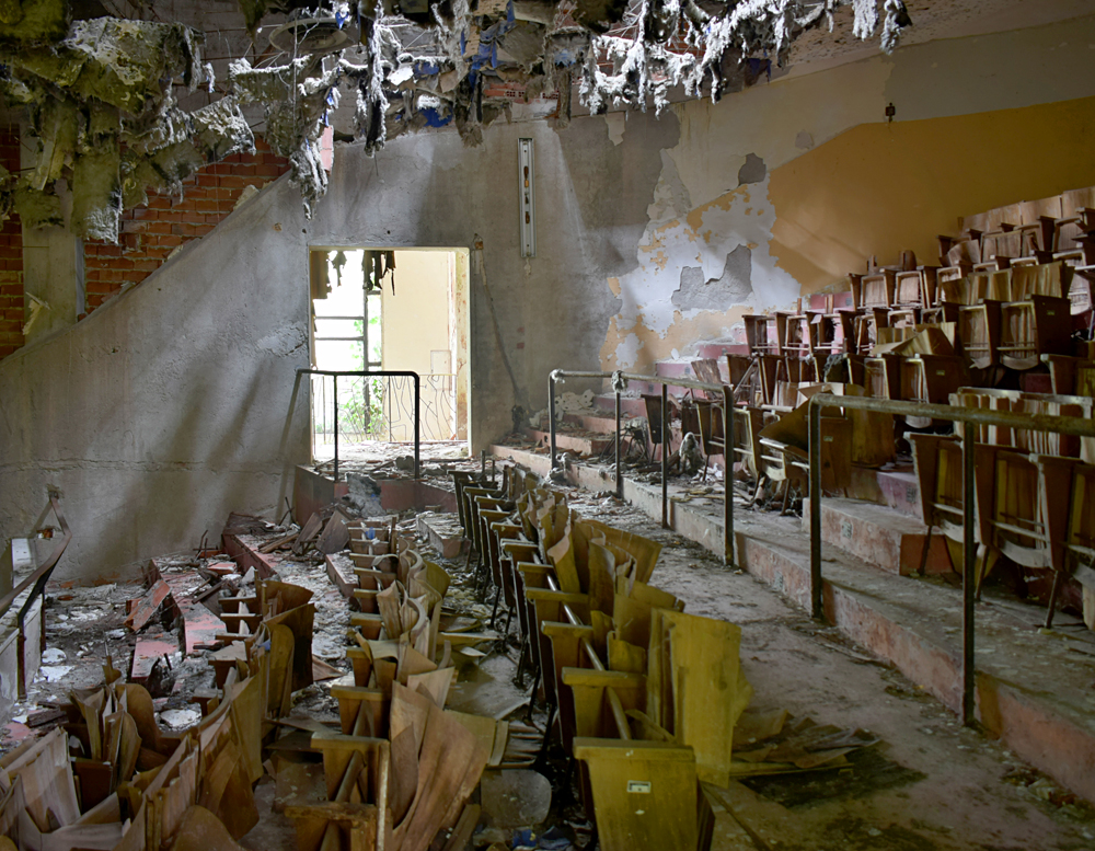 Nous arrivons au point d’intérêt majeur du site : de l’extérieur, rien n’indique que cet austère bâtiment est en fait un théâtre. Un incendie a pas mal endommagé la salle, mais le lieu a conservé toute sa prestance. Se retrouver seul ou en petit groupe dans un lieu de ce type, même abandonné et dégradé, est une chose unique. On a le sentiment que la salle est à nous, on saisit l’espace sans être cantonné à devoir s’assoir à notre place, on passe entre les sièges, on monte au balcon profiter de la vue, on se promène sur la scène en imaginant être un des acteurs qui jouait ici pour divertir les patients… Une expérience unique qui justifia le déplacement dans ce lieu particulier. |