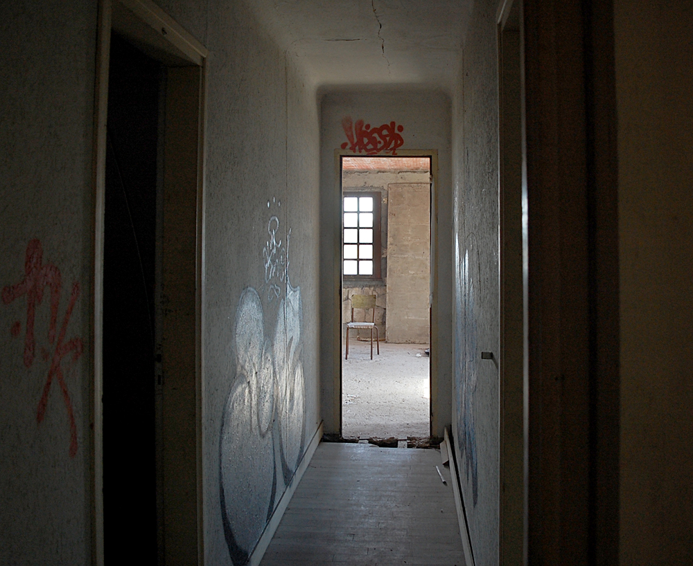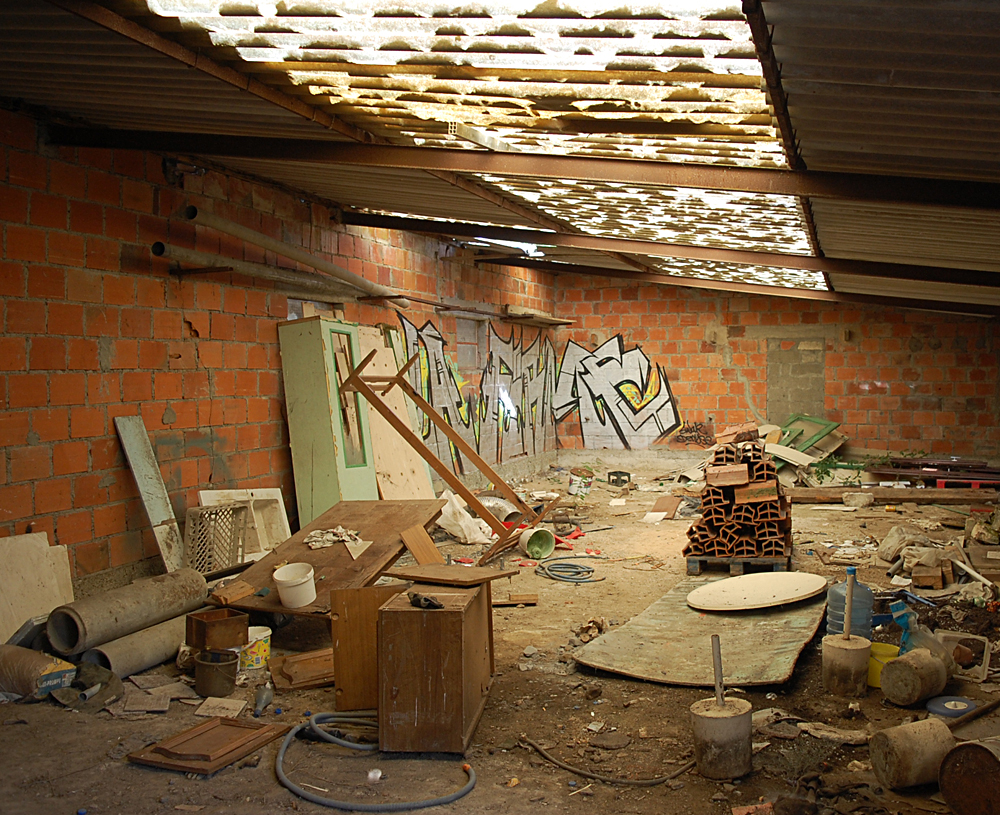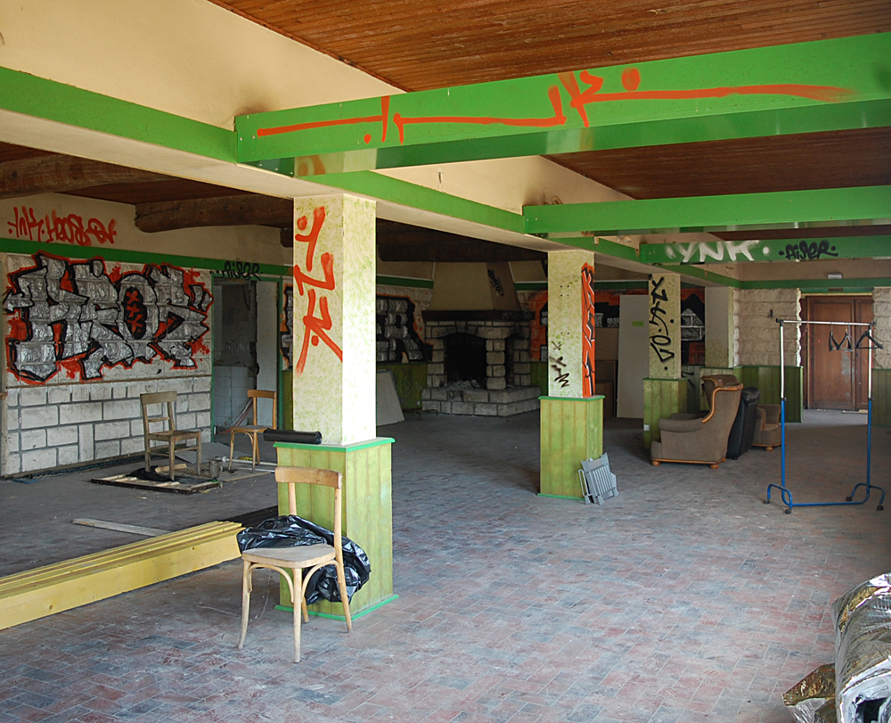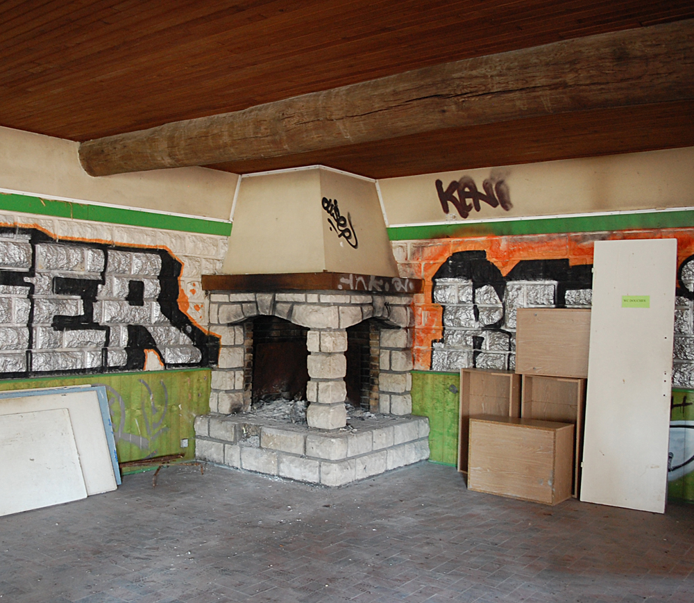 A notre grande surprise, même si le lieu comportait des tags et un peu de dégradations, il restait encore quelques objets et traces de vie sur place, nous permettant de mieux saisir la fonction du lieu lorsqu’il était en activité. Entrés via l’ancienne chambre froide, nous découvrons l’accueil, la salle de restaurant, la réception… C’est étonnant que tant de choses soient encore là pour un lieu aussi en vue. Le lieu est-il un squat pour les jeunes du coin ? Possible. Ici et là, quelques accessoires filent un coup de nostalgie : tasses soucoupes permettent bien de s’imaginer les clients s’arrêtant ici le temps d’un café, d’un repas ou d’une nuit de repos. Par endroits, quelques indices permettent d’imaginer qu’une réhabilitation fut envisagée (et même tentée) avant de s’arrêter. Dans une pièce, les carreaux colorés me font penser à un tableau de Mondrian, d’où le nom fictif donné à ce lieu. |