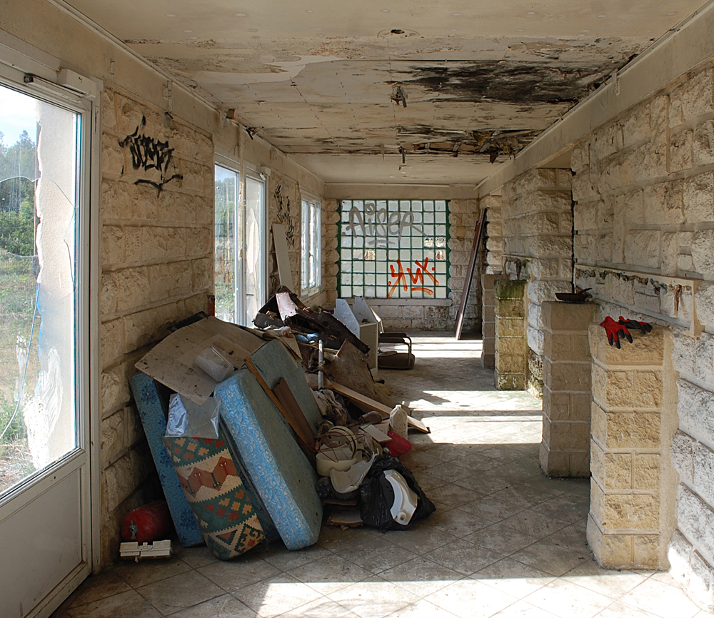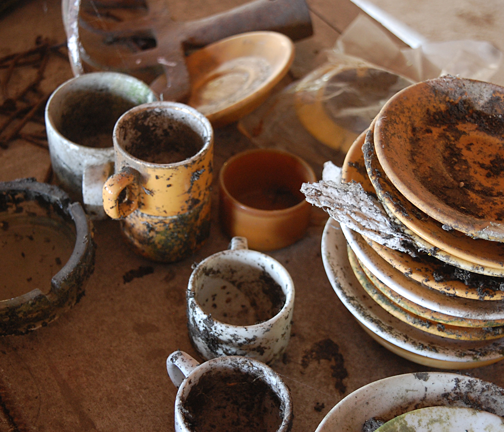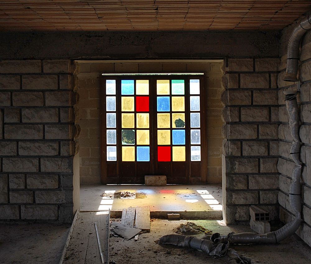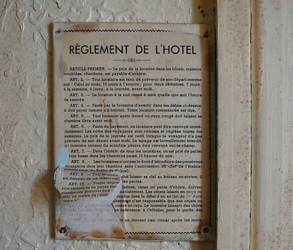 A notre grande surprise, même si le lieu comportait des tags et un peu de dégradations, il restait encore quelques objets et traces de vie sur place, nous permettant de mieux saisir la fonction du lieu lorsqu’il était en activité. Entrés via l’ancienne chambre froide, nous découvrons l’accueil, la salle de restaurant, la réception… C’est étonnant que tant de choses soient encore là pour un lieu aussi en vue. Le lieu est-il un squat pour les jeunes du coin ? Possible. Ici et là, quelques accessoires filent un coup de nostalgie : tasses soucoupes permettent bien de s’imaginer les clients s’arrêtant ici le temps d’un café, d’un repas ou d’une nuit de repos. Par endroits, quelques indices permettent d’imaginer qu’une réhabilitation fut envisagée (et même tentée) avant de s’arrêter. Dans une pièce, les carreaux colorés me font penser à un tableau de Mondrian, d’où le nom fictif donné à ce lieu. |