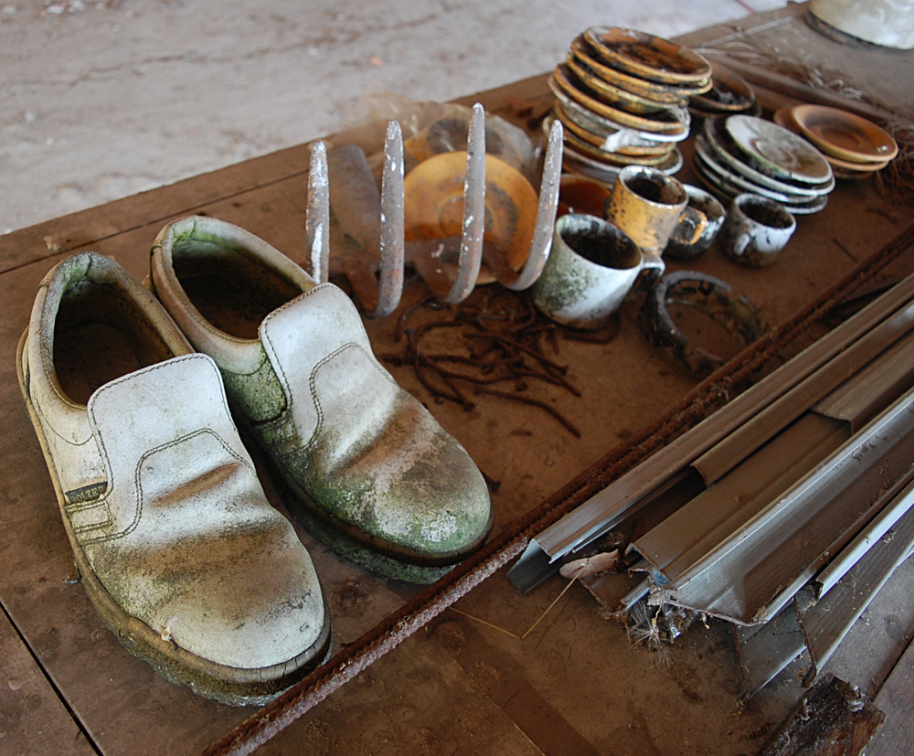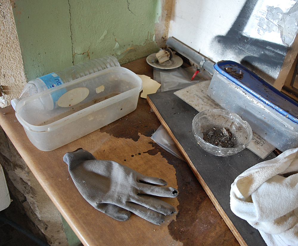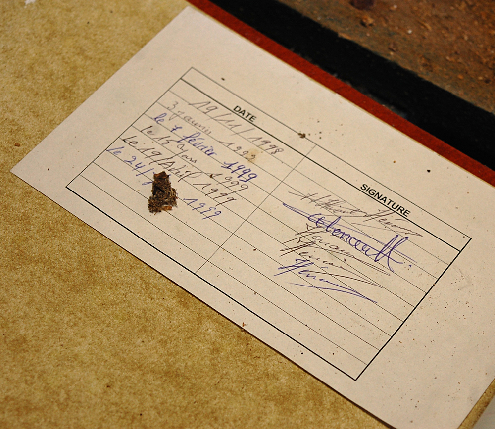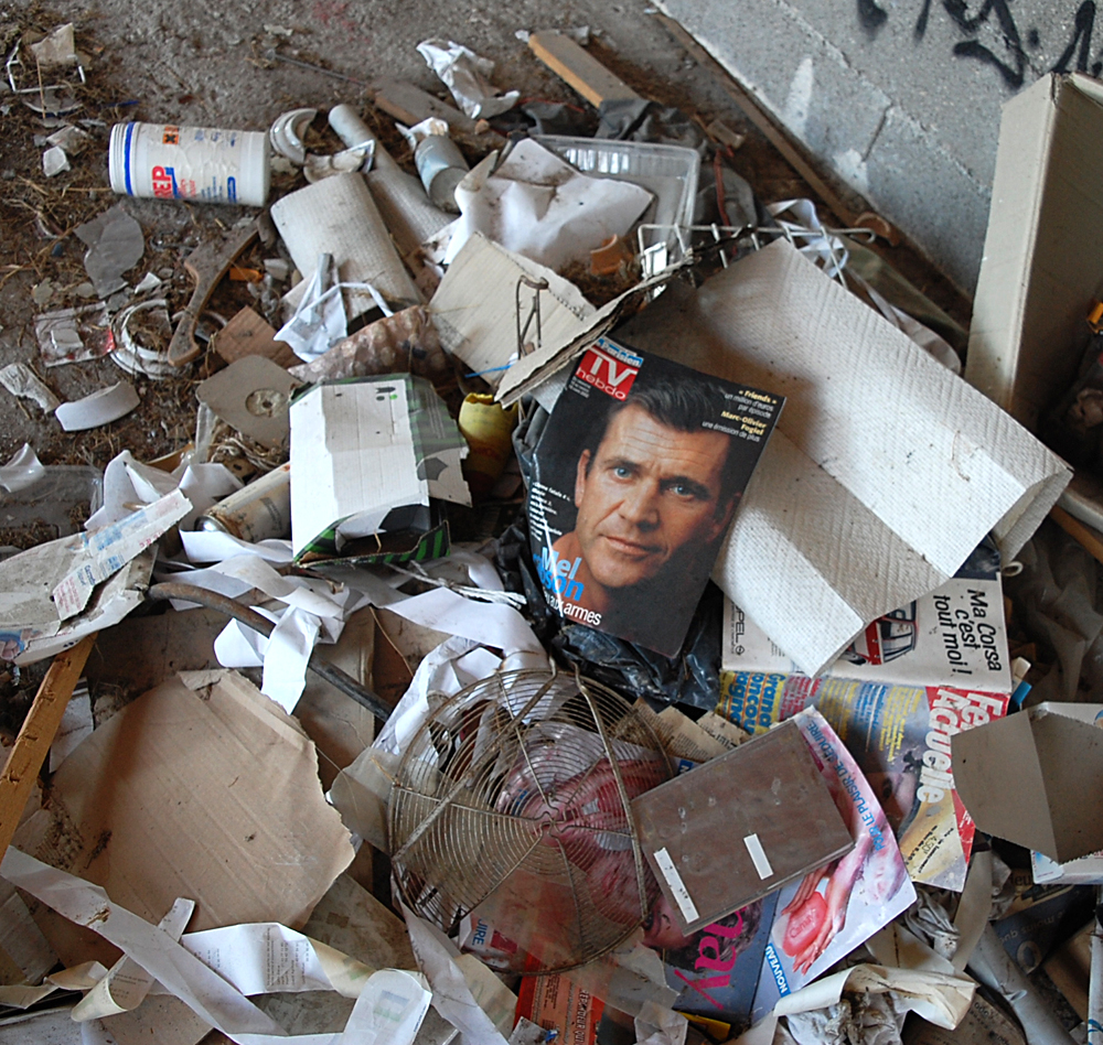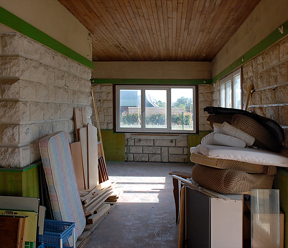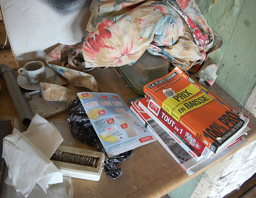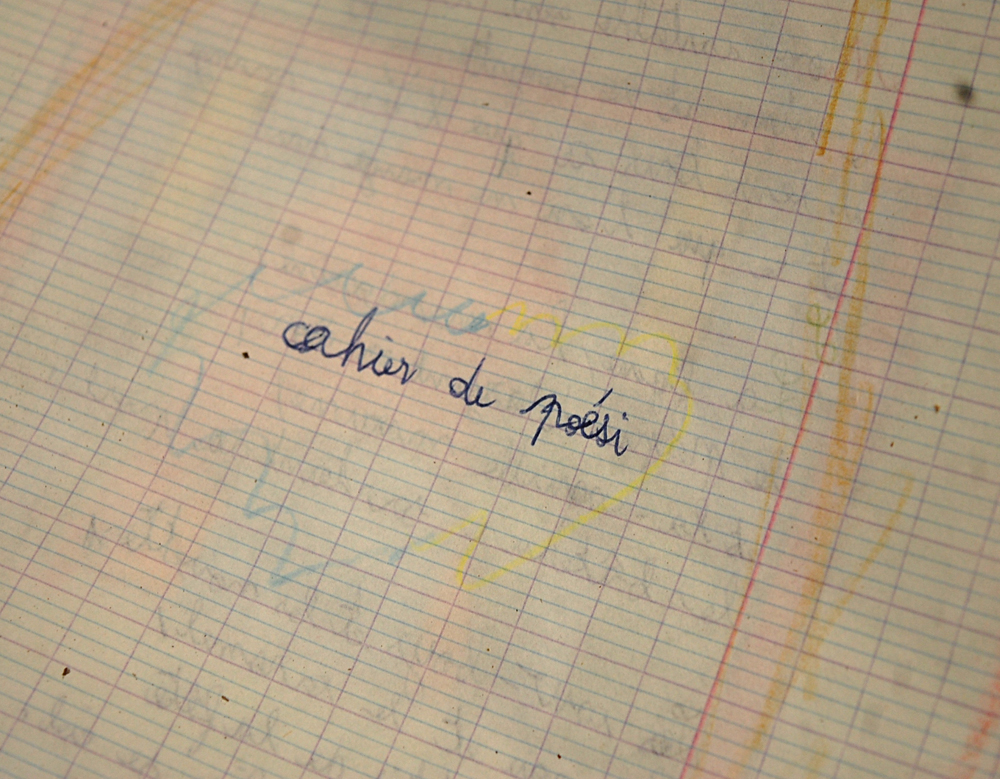 Après avoir terminé notre visite, nous nous demandons s’il reste d’autres choses à voir, et un petit hangar situé derrière l’auberge nous interpelle. Ne nous attendant pas à trouver mille choses, nous poussons la porte (ouverte) de celui-ci et découvrons de nombreux objets. Pneus, cartons, boites, mobiliers divers... Par terre je tombe sur une pile de cahiers d’école ayant visiblement appartenu au fils de l’aubergiste. Les dates remontent aux années 80 puis à la fin des années 90, et c’est avec une petite émotion que je découvre un cahier de «poési». Devant ce genre de découverte je me demande à chaque fois si je dois retrouver et recontacter les gens à qui ça appartient, car peut-être ils seraient heureux de retomber dessus. Mais savoir qu’un inconnu est tombé sur leur passé les gênerait sûrement, donc je ne saute pas le pas... |