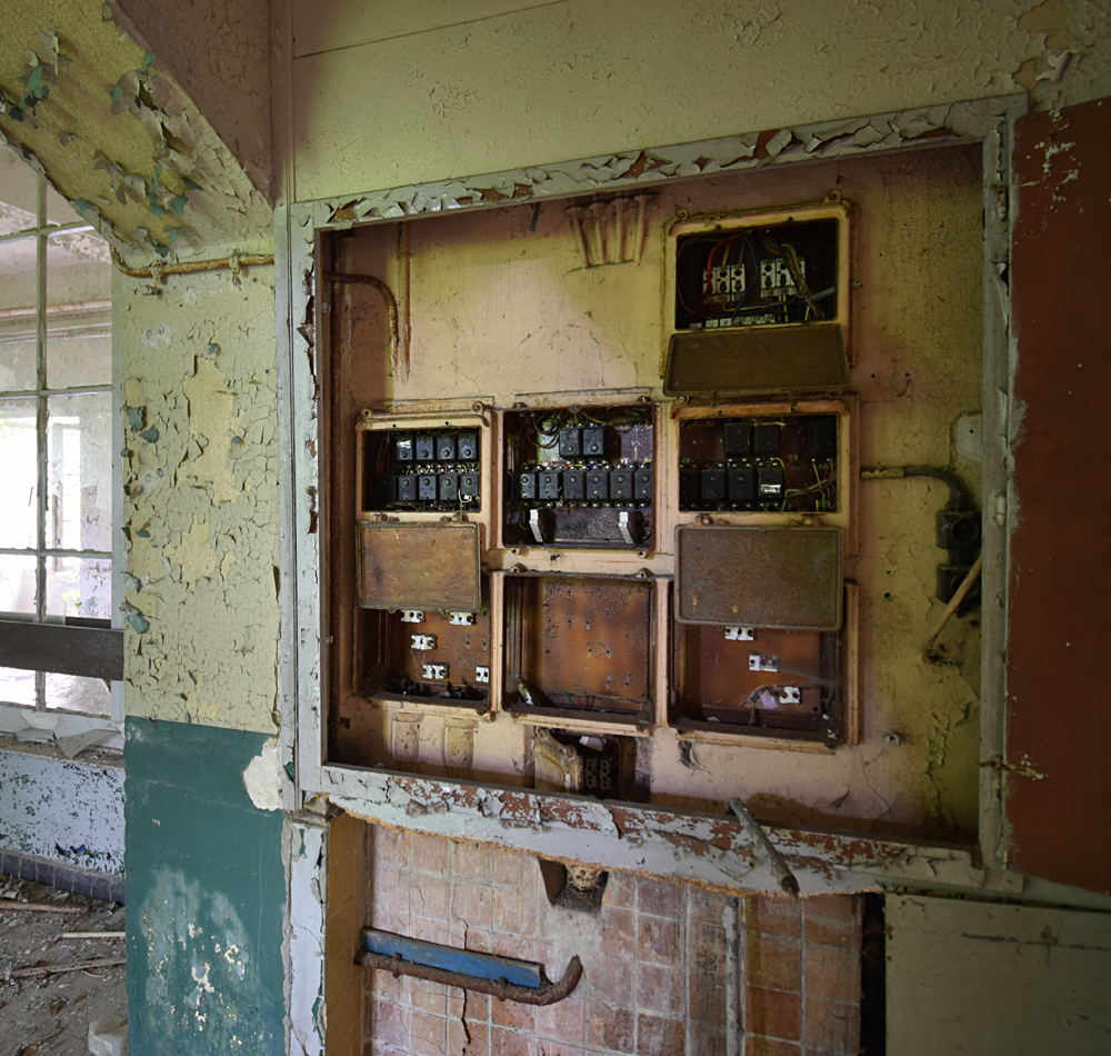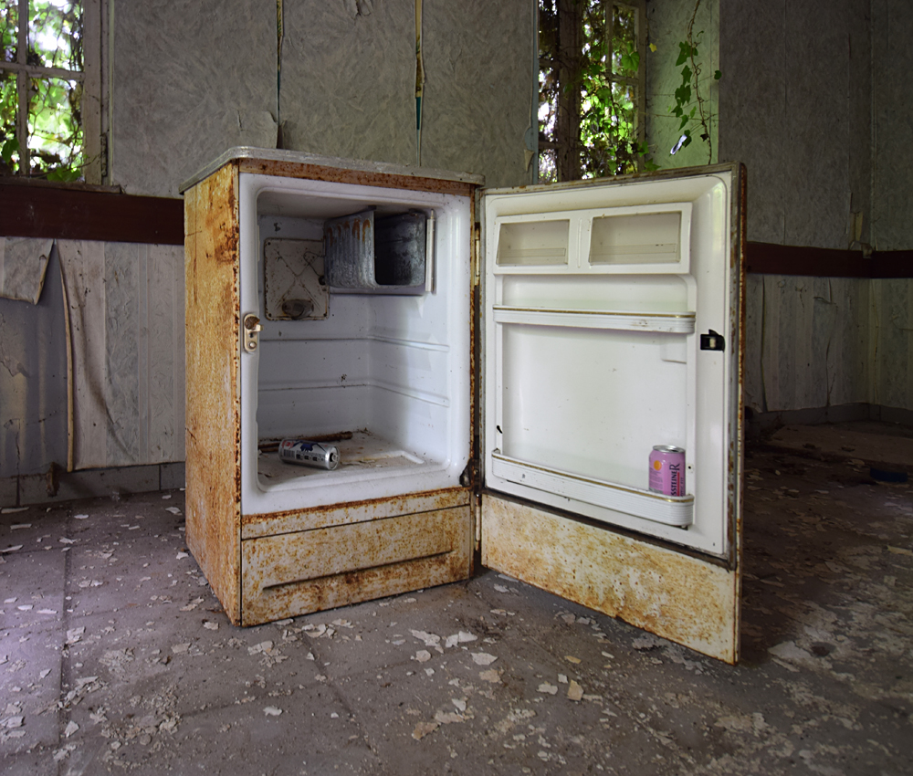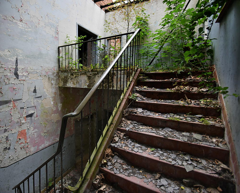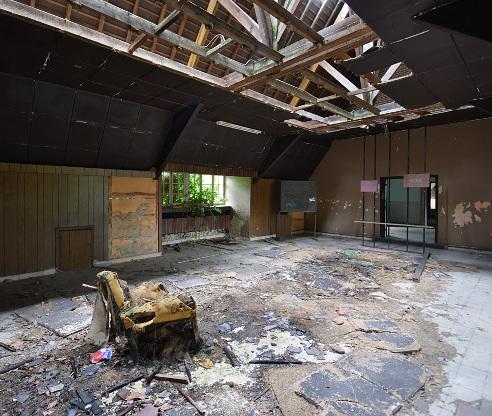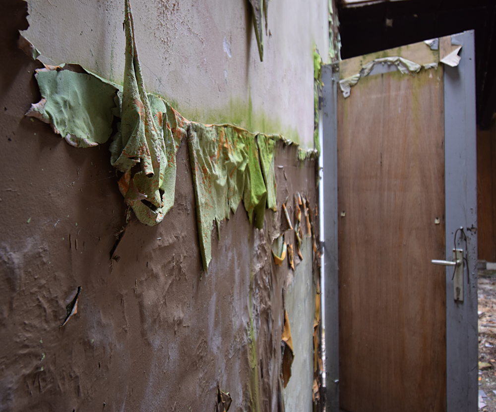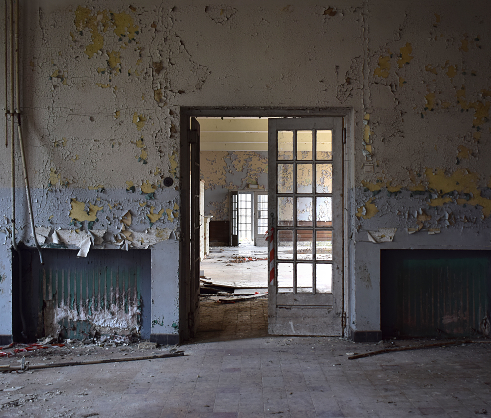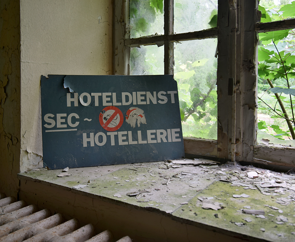 Si le premier bâtiment rencontré n’est pas extraordinaire avec son toit effondré, la suite est plus sympathique. Par chance, tout est ouvert. Aucune clôture ne barre l’accès, il me suffit juste de pousser les portes pour entrer... Petit à petit que je commence à me faire une idée de la fonction du lieu : ici, un hall de réception, là une salle qui fit diablement penser à un réfectoire (avec cuisines et chambres froides derrière) et un peu partout de grandes pièces qui sont très probablement des salles de classe. Je serais dans une ancienne école ? On le dirait bien. Et vu les autocollants à l’étage, une école liée à l’aviation militaire. Ci-dessous, les photos prises lors de cette première visite en 2018 : |