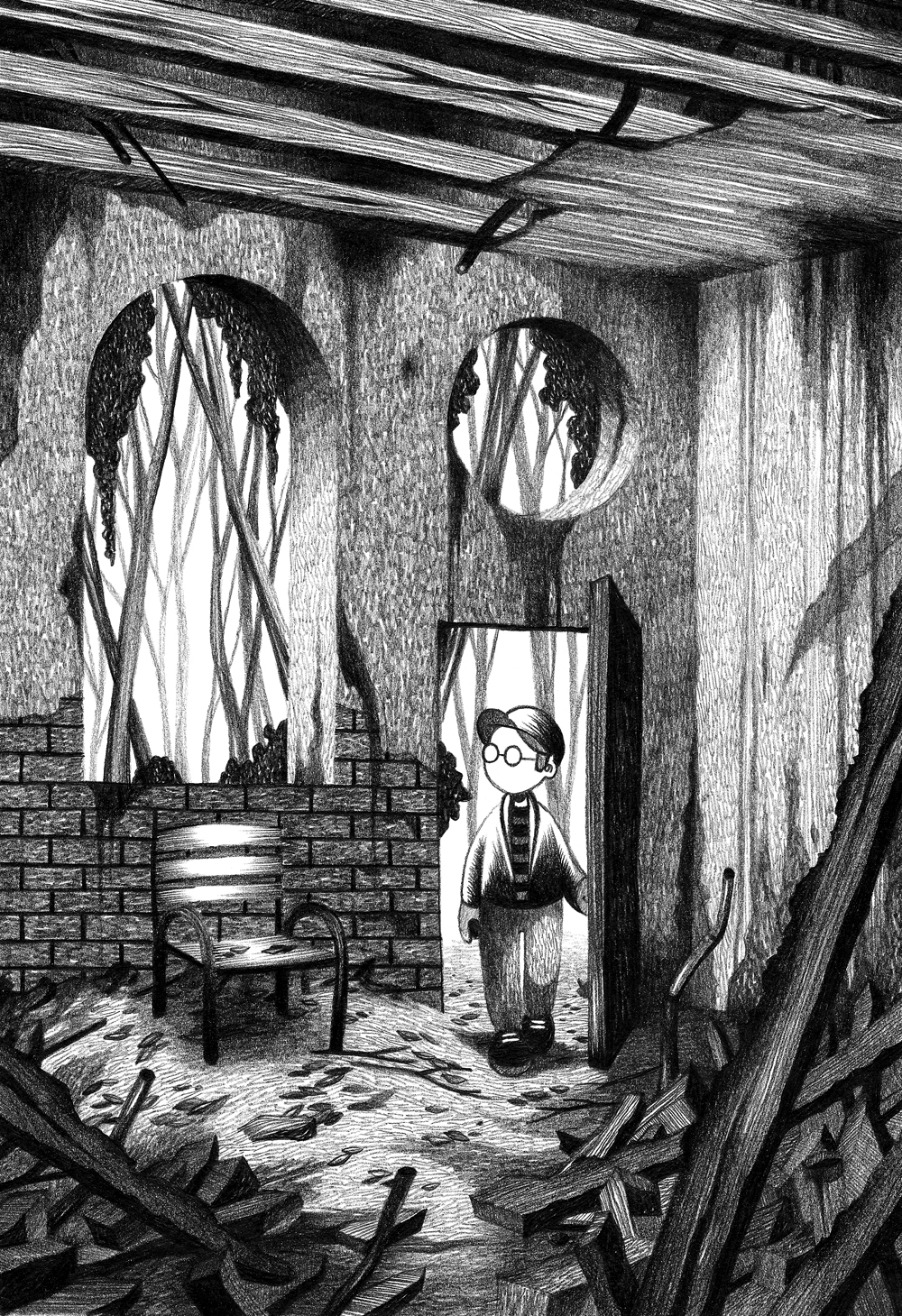 Un peu plus d’une heure s’est écoulée, et me voilà ravi : c’est si chouette de tomber sur des lieux abandonnés par hasard, de les parcourir et de se demander où l’on a mis les pieds... La magie du hasard ! Si au début j’étais un peu sur mes gardes en découvrant que ce site avait un passé militaire, le calme absolu régnant sur place me calma : il n’y avait personne ici, et ce depuis longtemps. Combien exactement ? Il me faudrait faire quelques recherches pour le découvrir… Ci-dessous le dessin figurant dans «Urbex Europe», et me représentant en train d’entrer dans un des bâtiments situés à côté du manoir, et me menant juste après à l’école militaire. |