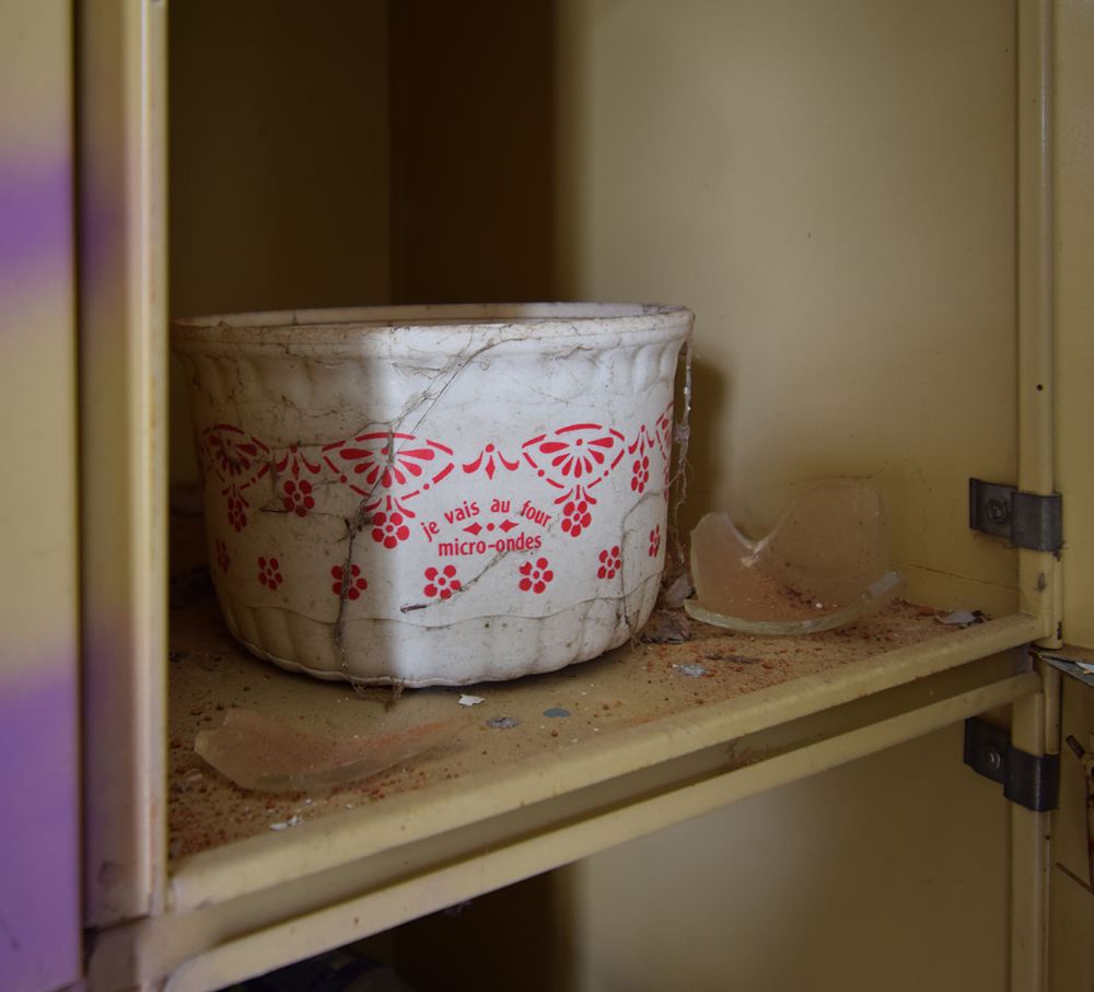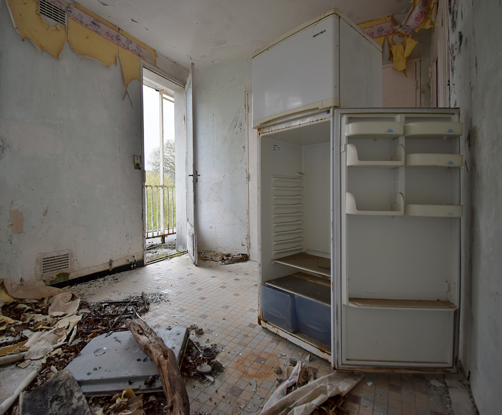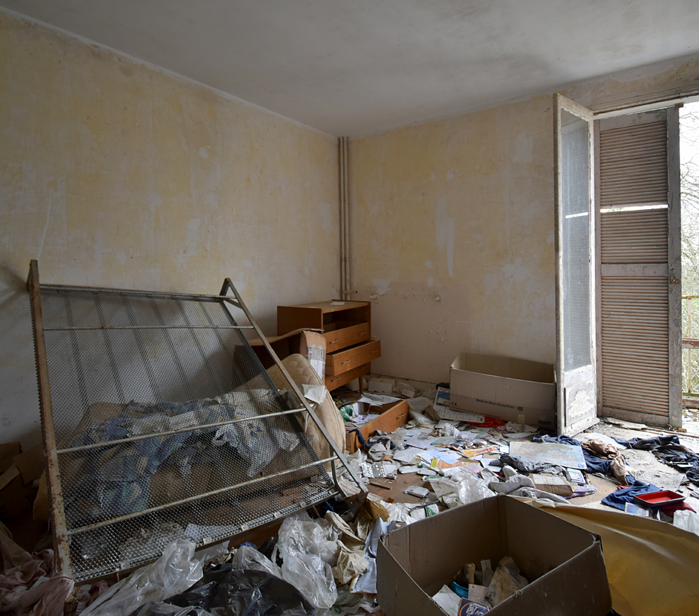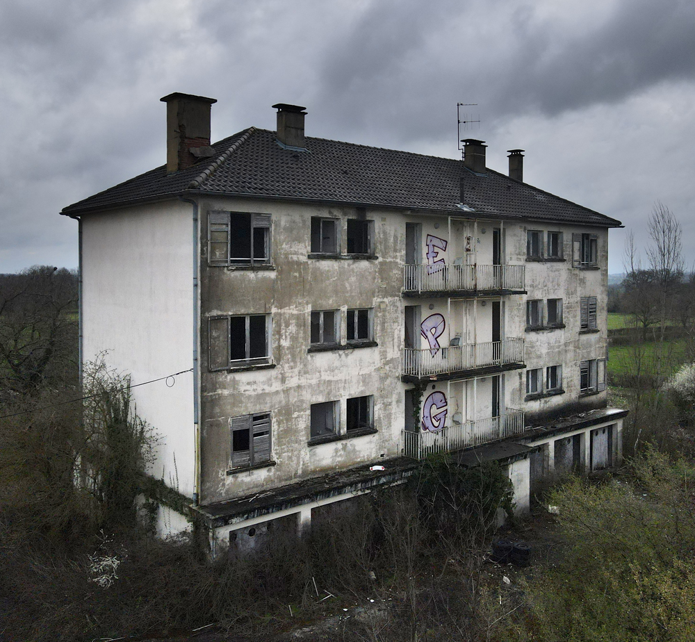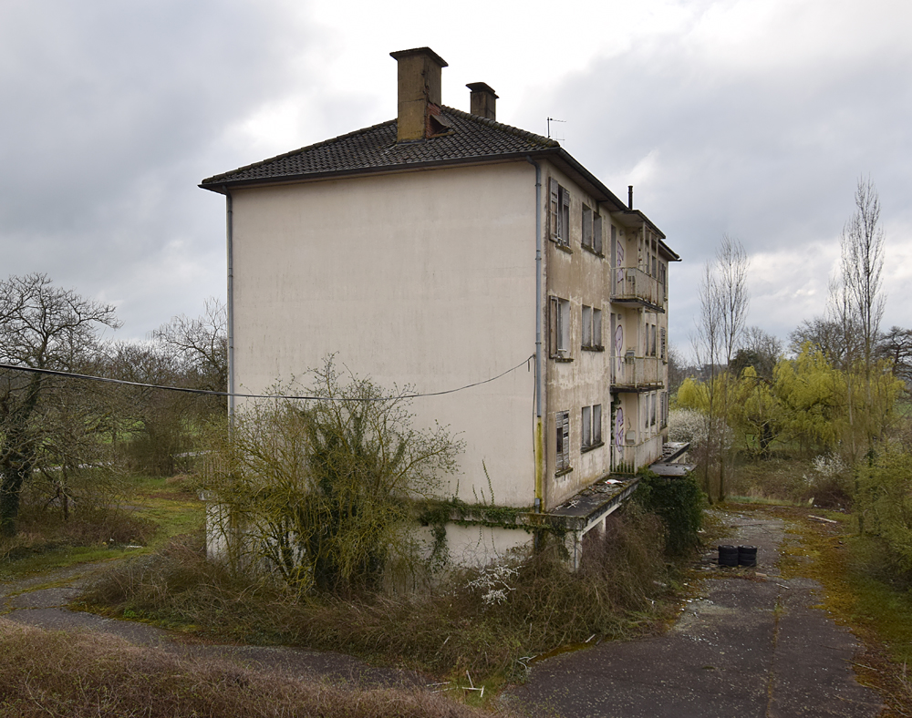 Cafarnaom avait déjà exploré cette étrange cité, mais pas en entier. Sur les trois bâtiments composant la «Cité Solitude» (telle qu’elle est nommée sur son site) il n’en avait visité qu’un seul. C’est lors d’un road trip que j’eus l’occasion de la visiter à mon tour, guidé par mon camarade d’exploration qui allait pouvoir découvrir les deux autres bâtiments qu’ils n’avait pas exploré. Si sur Google Maps le trio de bâtiments semble loin de tout, ce n’est en réalité géographiquement pas tellement le cas une fois sur place. Enfin, oui et non... Il y a un hôpital en activité à un peu plus de deux cent mètres exactement, et une petite ferme pas loin (qui a l’air abandonnée) à un plus de cent mètres. Mais ça c’est pour la géographie. Parce qu’une fois face aux trois bâtiments, il y a une réelle ambiance de solitude, de mélancolie et de fin du monde. Bon, ok, le jour de notre visite la météo pluvieuse doit jouer un peu, c’est vrai... Mais, quand même, on se pose la question : qu’est-ce qui fait que ces trois immeuble d’habitations à loyer modéré ont été construits là, à deux cent mètres d’un hôpital ? Cafarnaom m’informe qu’il a déjà fait plusieurs recherches et son constat est formel : les trois immeubles n’ont rien à voir avec l’hôpital. Il ne s’agit pas de logement de personnel. Alors qui vivait donc ici ? C’est un mystère, car hormis l’hôpital et la petite ferme, il n’y a rien d’autre à proximité de l’insolite cité. La première ville (enfin, le premier village) est à cinq kilomètres. Une fois garés sur place, derrière un des immeubles et à l’abri des regards de tout véhicule passant à côté, nous nous dirigeons vers le bâtiment situé le plus au sud… Entrer n’est pas bien compliqué, la porte du hall est grande ouverte. Et bien que l’endroit soit vraiment reculé, je suis très surpris de découvrir un lieu que le vandalisme n’a pas épargné : boites aux lettres défoncées, courrier éparpillé, tags… Voir cela au milieu de la campagne, c’est aussi triste que fascinant. Qui peut donc venir ici ? Petite curiosité dans une des boites aux lettres : quelqu’un y a déposé un mignon petit bol pouvant aller au micro-ondes. La visite commence alors, et elle n’est pas (il faut bien le reconnaitre) la plus originale du monde : escalier, premier appartement, deuxième appartement, escalier, troisième appartement etc. Pour autant, ce qu’on trouve encore dans certaines pièces est intéressant,