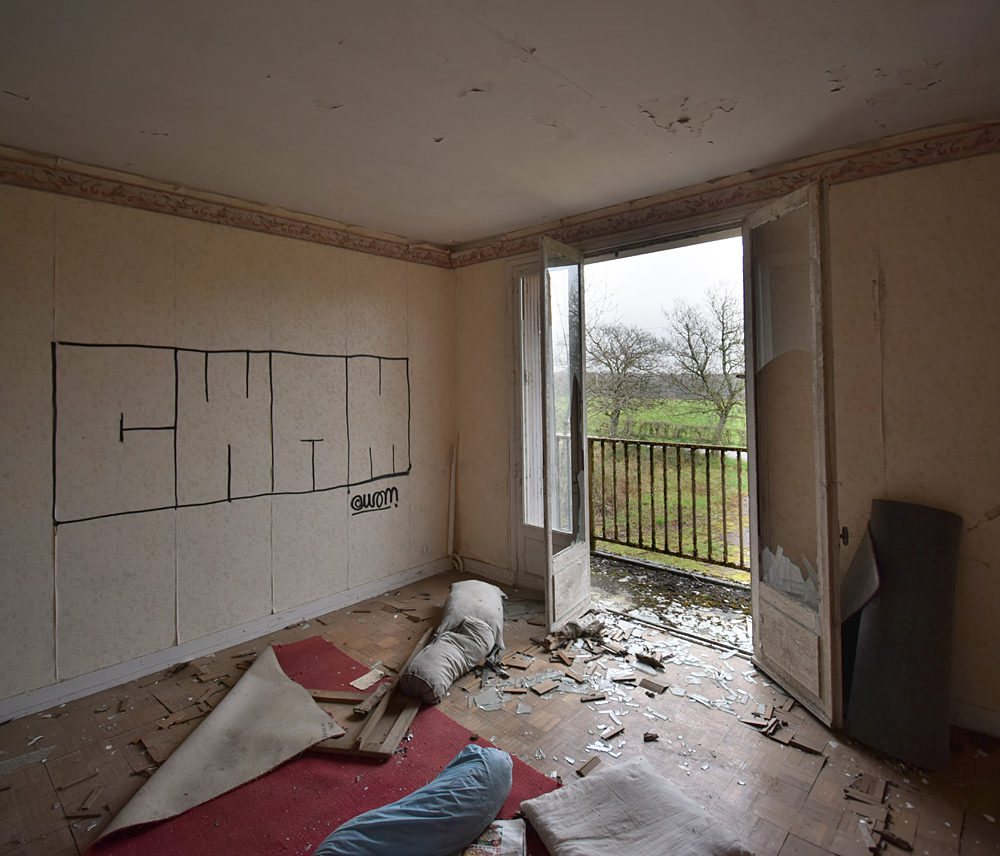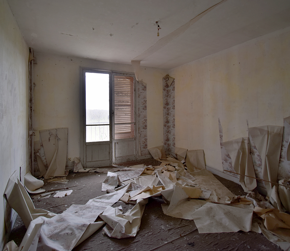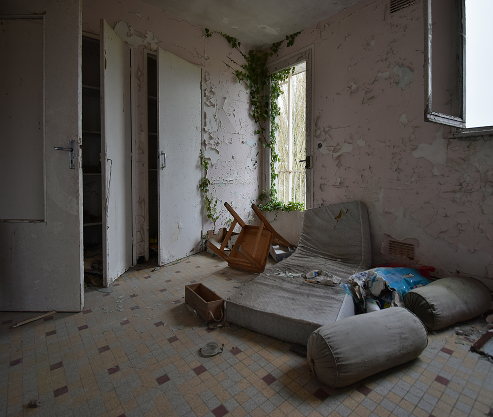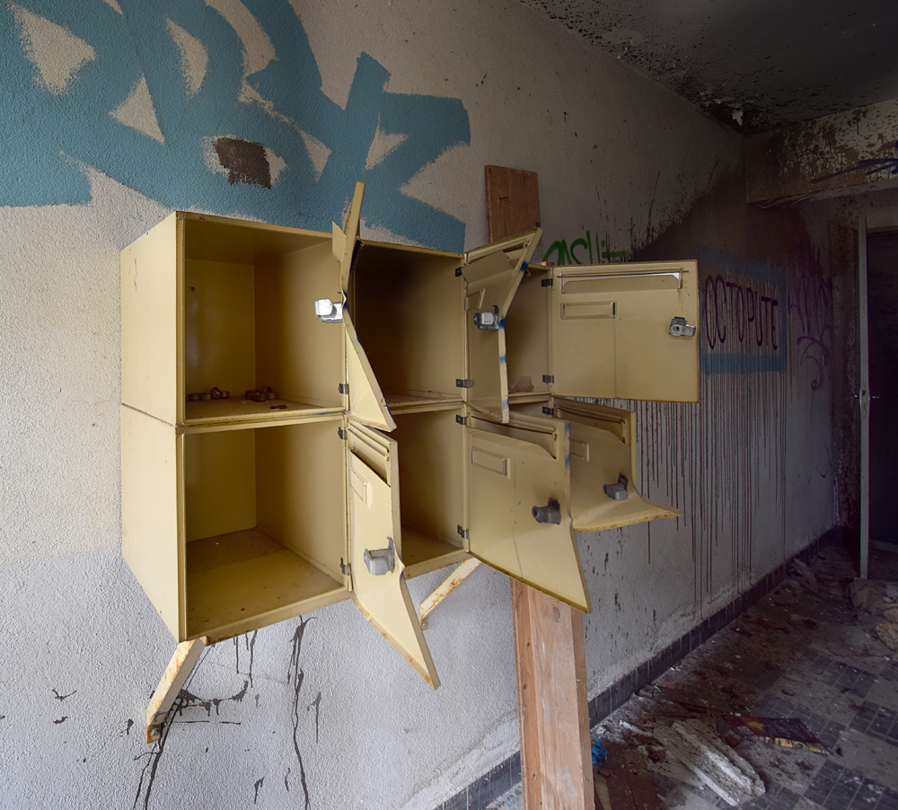 Cafarnaom avait déjà exploré cette étrange cité, mais pas en entier. Sur les trois bâtiments composant la «Cité Solitude» (telle qu’elle est nommée sur son site) il n’en avait visité qu’un seul. C’est lors d’un road trip que j’eus l’occasion de la visiter à mon tour, guidé par mon camarade d’exploration qui allait pouvoir découvrir les deux autres bâtiments qu’ils n’avait pas exploré. Si sur Google Maps le trio de bâtiments semble loin de tout, ce n’est en réalité géographiquement pas tellement le cas une fois sur place. Enfin, oui et non... Il y a un hôpital en activité à un peu plus de deux cent mètres exactement, et une petite ferme pas loin (qui a l’air abandonnée) à un plus de cent mètres. Mais ça c’est pour la géographie. Parce qu’une fois face aux trois bâtiments, il y a une réelle ambiance de solitude, de mélancolie et de fin du monde. Bon, ok, le jour de notre visite la météo pluvieuse doit jouer un peu, c’est vrai... Mais, quand même, on se pose la question : qu’est-ce qui fait que ces trois immeuble d’habitations à loyer modéré ont été construits là, à deux cent mètres d’un hôpital ? Cafarnaom m’informe qu’il a déjà fait plusieurs recherches et son constat est formel : les trois immeubles n’ont rien à voir avec l’hôpital. Il ne s’agit pas de logement de personnel. Alors qui vivait donc ici ? C’est un mystère, car hormis l’hôpital et la petite ferme, il n’y a rien d’autre à proximité de l’insolite cité. La première ville (enfin, le premier village) est à cinq kilomètres. Une fois garés sur place, derrière un des immeubles et à l’abri des regards de tout véhicule passant à côté, nous nous dirigeons vers le bâtiment situé le plus au sud… Entrer n’est pas bien compliqué, la porte du hall est grande ouverte. Et bien que l’endroit soit vraiment reculé, je suis très surpris de découvrir un lieu que le vandalisme n’a pas épargné : boites aux lettres défoncées, courrier éparpillé, tags… Voir cela au milieu de la campagne, c’est aussi triste que fascinant. Qui peut donc venir ici ? Petite curiosité dans une des boites aux lettres : quelqu’un y a déposé un mignon petit bol pouvant aller au micro-ondes. La visite commence alors, et elle n’est pas (il faut bien le reconnaitre) la plus originale du monde : escalier, premier appartement, deuxième appartement, escalier, troisième appartement etc. Pour autant, ce qu’on trouve encore dans certaines pièces est intéressant,