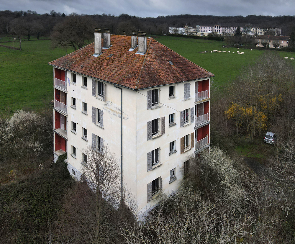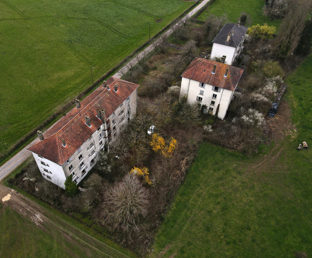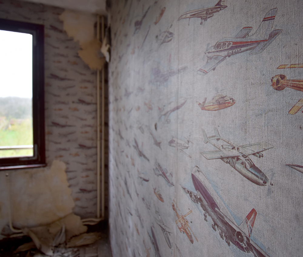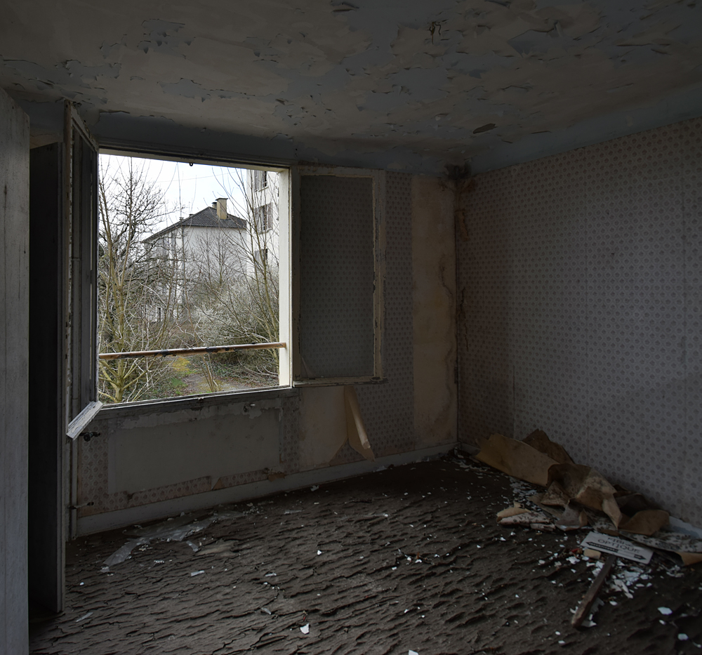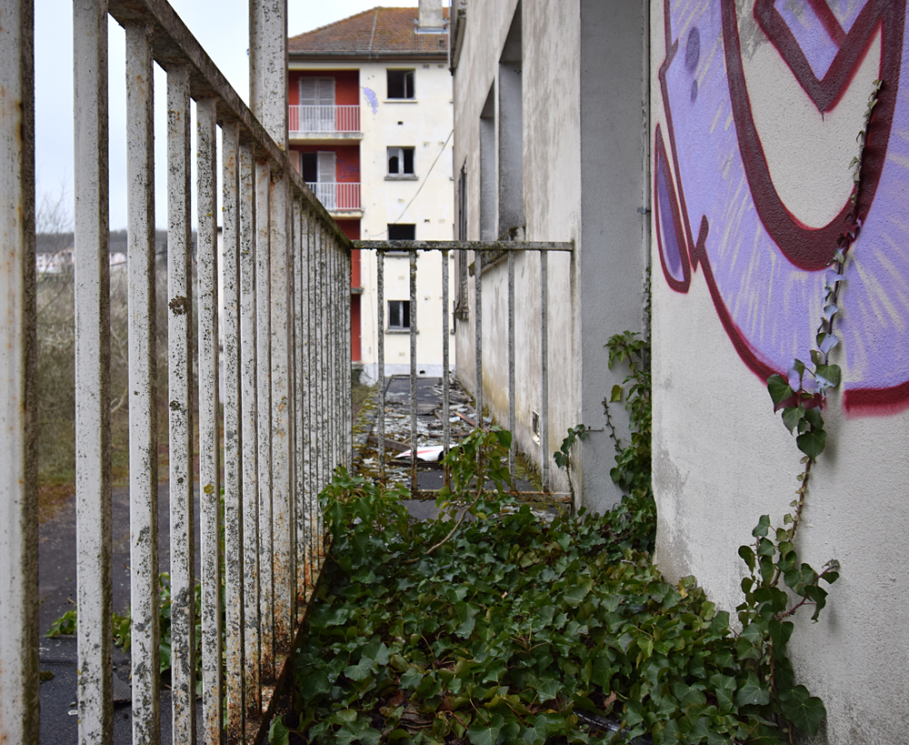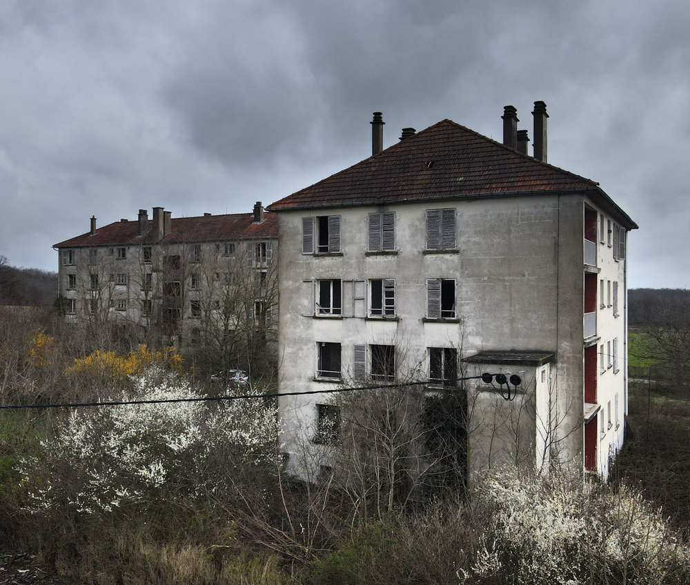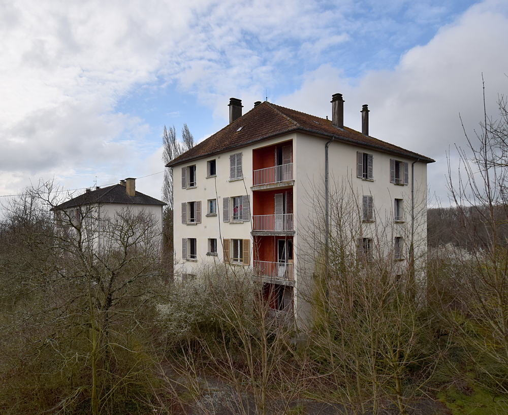 Là encore, la visite n’est pas si exceptionnelle que ça en terme d’architecture, mais c’est vraiment intéressant de découvrir ces ambiances si différentes les unes des autres selon les logements. Les différents papiers peints décrivent des vies différentes : ici, des fleurs, plus loin, des cerfs et des biches, à un endroit une magnifique photo de torrent vraiment sympa, et enfin, dans une chambre d’enfant, des Pierrot ! L’ambiance mélancolique de ce site me donne envie de lui donner le nom de ce personnage quasiment toujours représenté en train de pleurer. Ici, l’analogie est encore plus criante du fait que les trois bâtiments composant la cité n’ont (littéralement) plus de feu : plus de chauffage, et plus de vie. La visite de ce dernier bâtiment se termine comme elle a commencé : en prenant en photos les deux autres bâtiments. Mais d’un peu plus haut cette fois. |