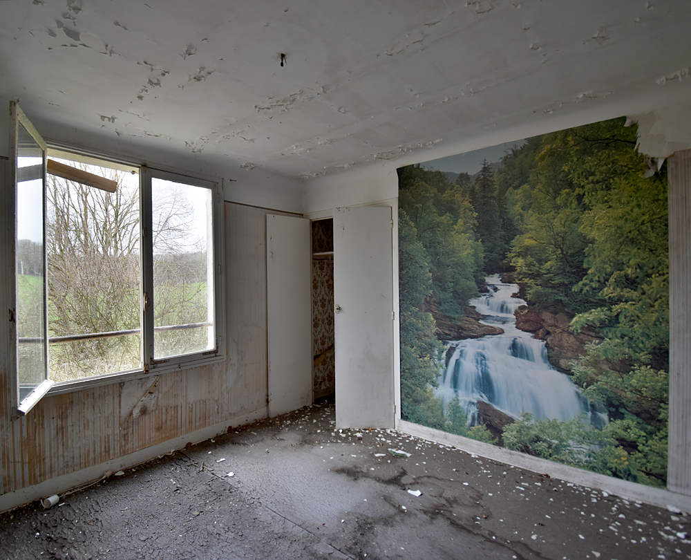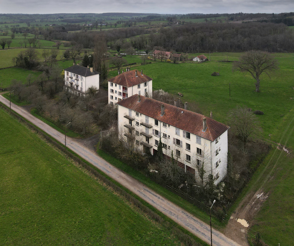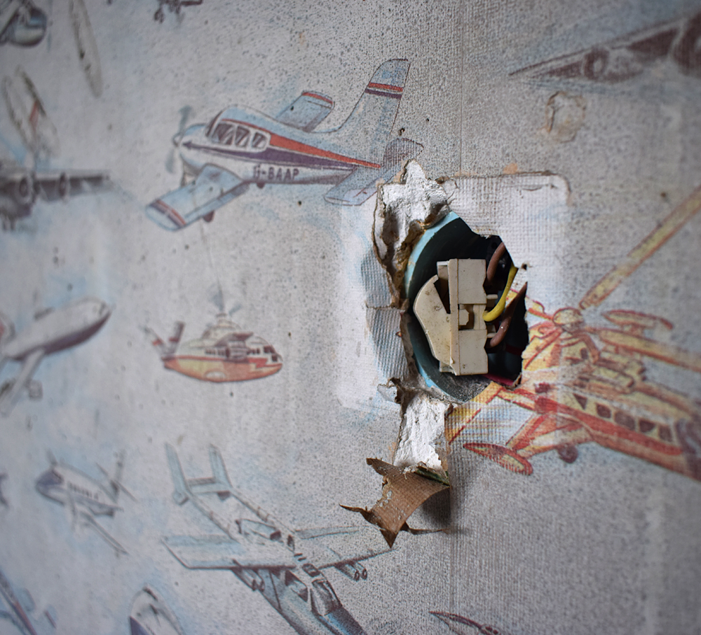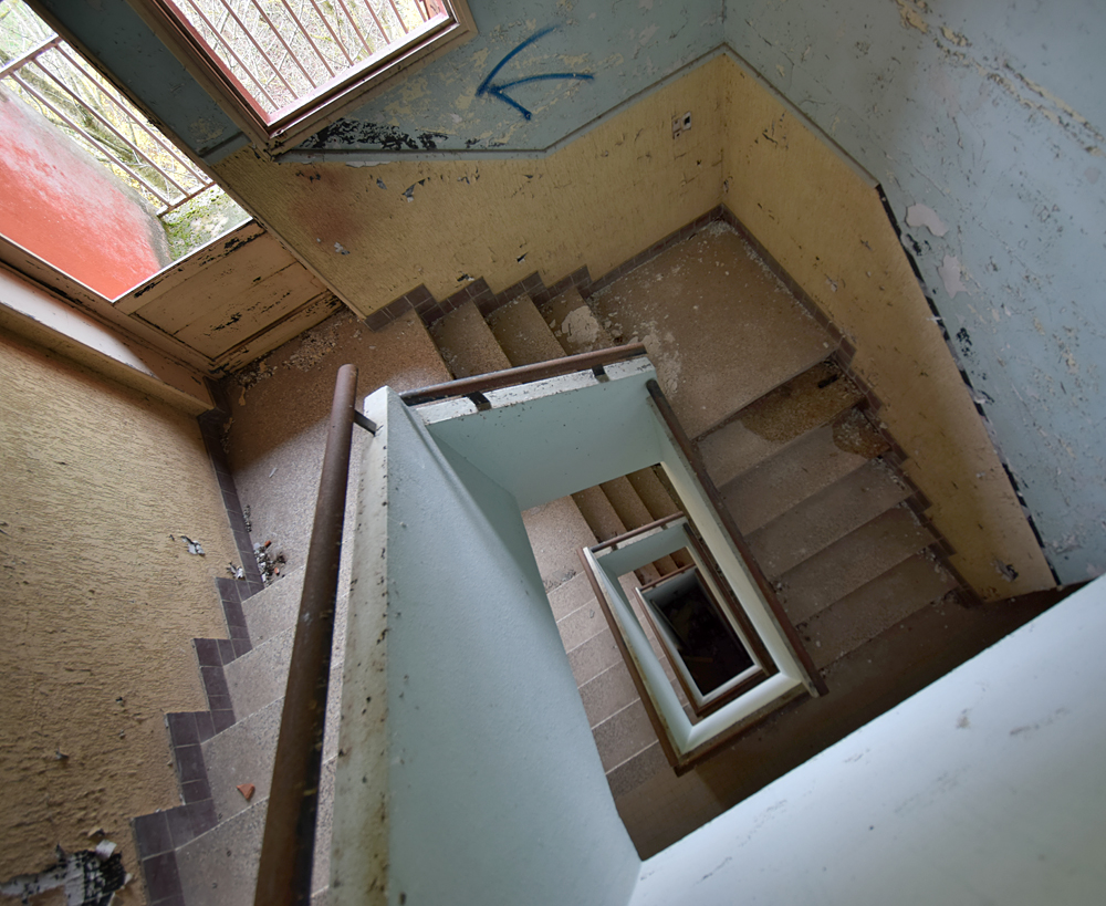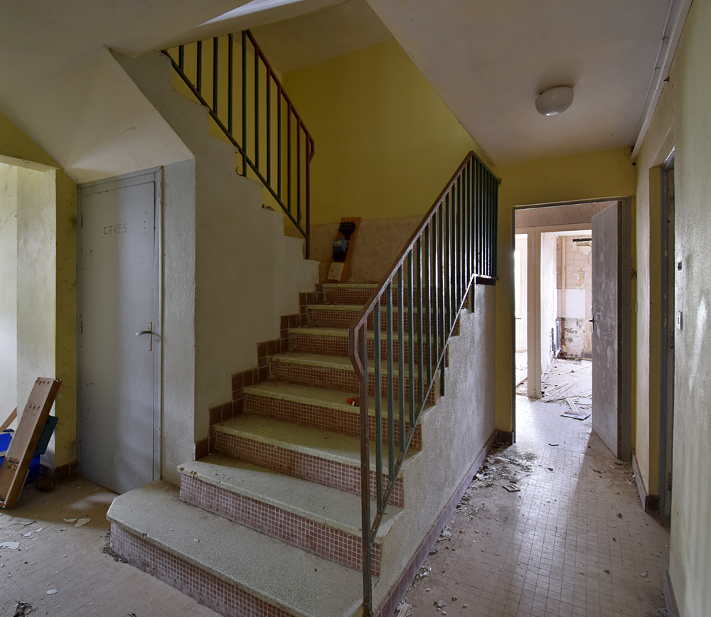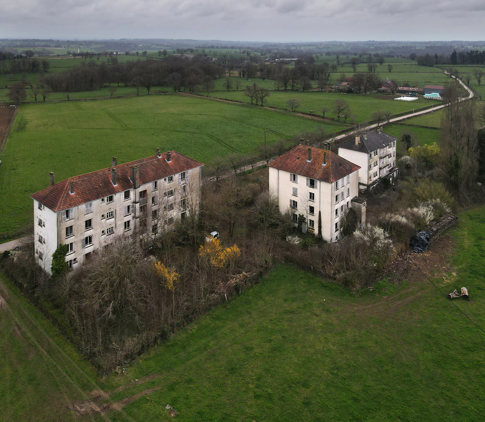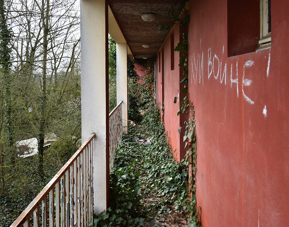 Là encore, la visite n’est pas si exceptionnelle que ça en terme d’architecture, mais c’est vraiment intéressant de découvrir ces ambiances si différentes les unes des autres selon les logements. Les différents papiers peints décrivent des vies différentes : ici, des fleurs, plus loin, des cerfs et des biches, à un endroit une magnifique photo de torrent vraiment sympa, et enfin, dans une chambre d’enfant, des Pierrot ! L’ambiance mélancolique de ce site me donne envie de lui donner le nom de ce personnage quasiment toujours représenté en train de pleurer. Ici, l’analogie est encore plus criante du fait que les trois bâtiments composant la cité n’ont (littéralement) plus de feu : plus de chauffage, et plus de vie. La visite de ce dernier bâtiment se termine comme elle a commencé : en prenant en photos les deux autres bâtiments. Mais d’un peu plus haut cette fois. |
