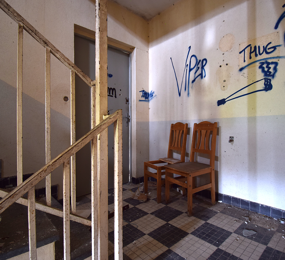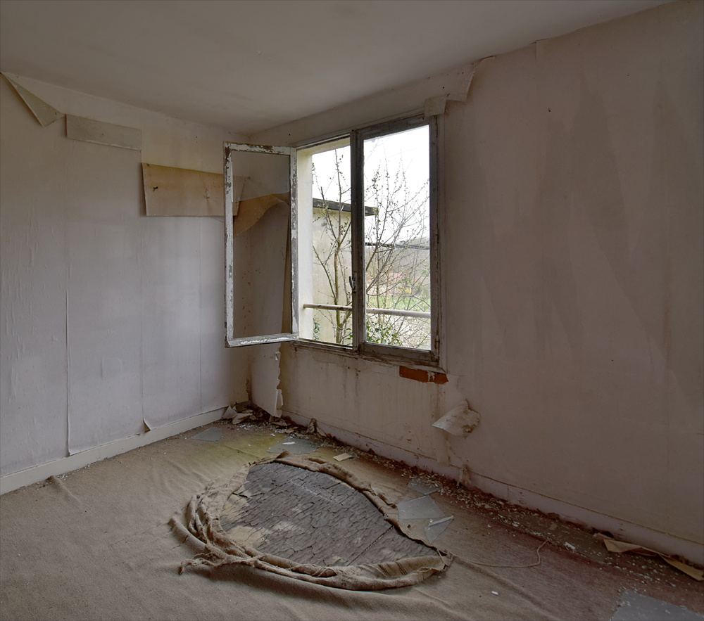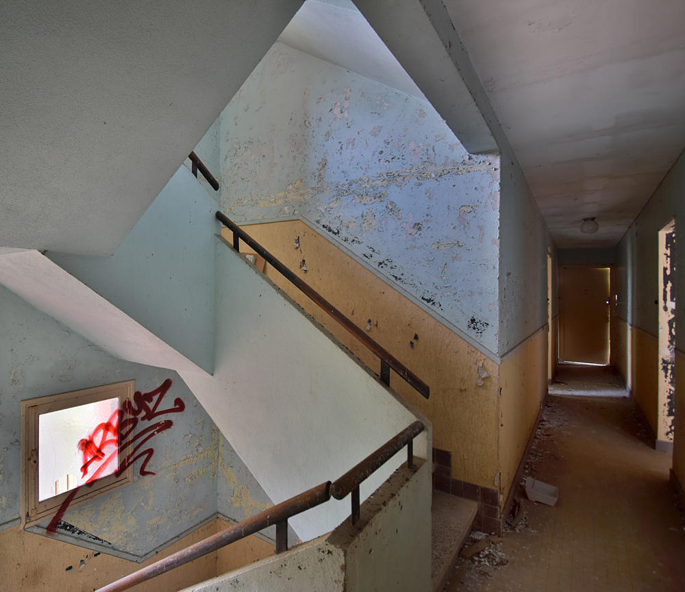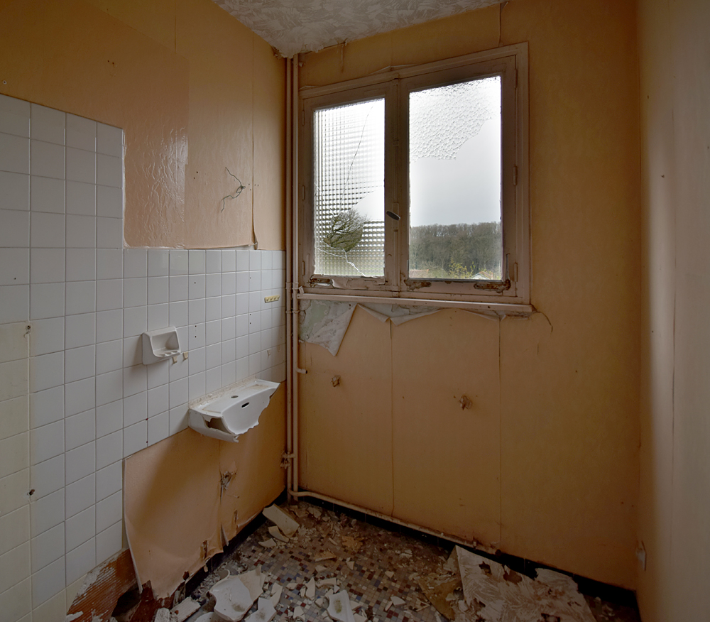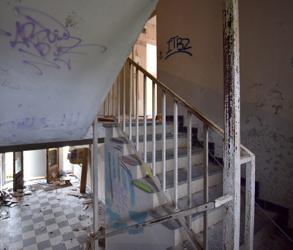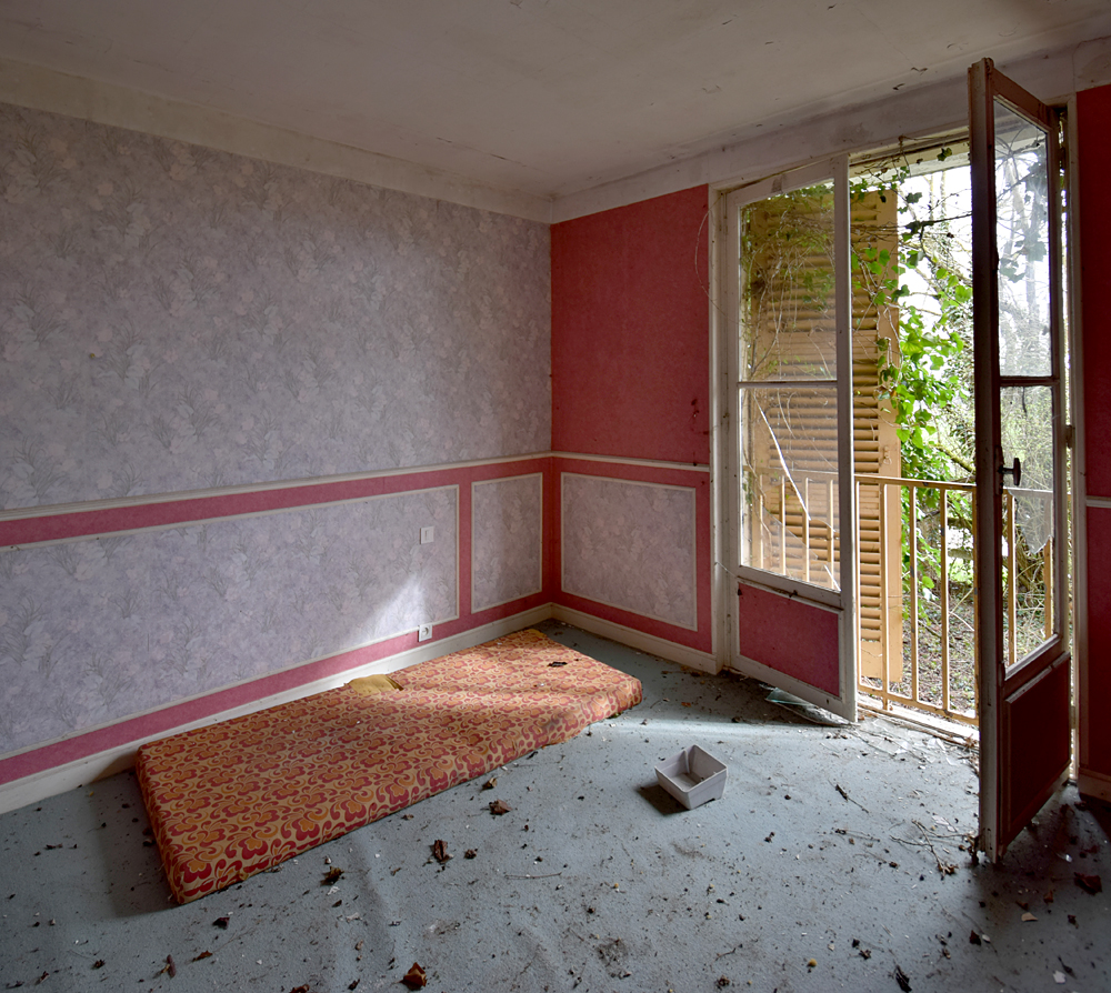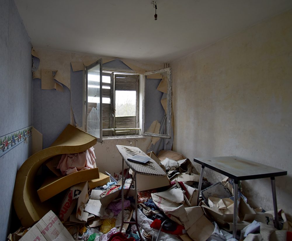 Là encore, la visite n’est pas si exceptionnelle que ça en terme d’architecture, mais c’est vraiment intéressant de découvrir ces ambiances si différentes les unes des autres selon les logements. Les différents papiers peints décrivent des vies différentes : ici, des fleurs, plus loin, des cerfs et des biches, à un endroit une magnifique photo de torrent vraiment sympa, et enfin, dans une chambre d’enfant, des Pierrot ! L’ambiance mélancolique de ce site me donne envie de lui donner le nom de ce personnage quasiment toujours représenté en train de pleurer. Ici, l’analogie est encore plus criante du fait que les trois bâtiments composant la cité n’ont (littéralement) plus de feu : plus de chauffage, et plus de vie. La visite de ce dernier bâtiment se termine comme elle a commencé : en prenant en photos les deux autres bâtiments. Mais d’un peu plus haut cette fois. |