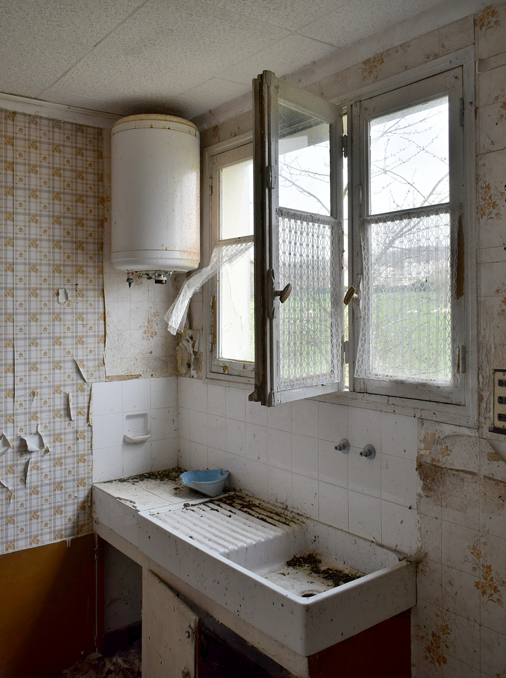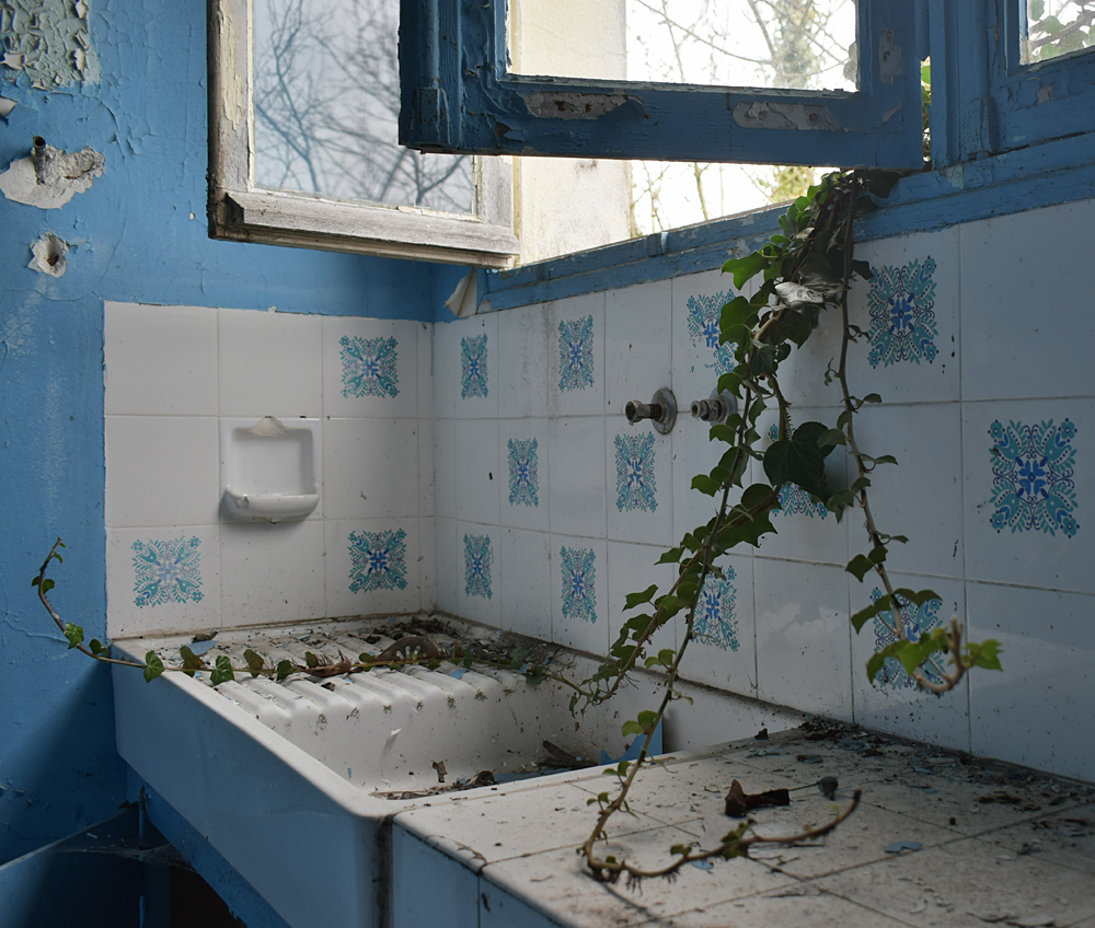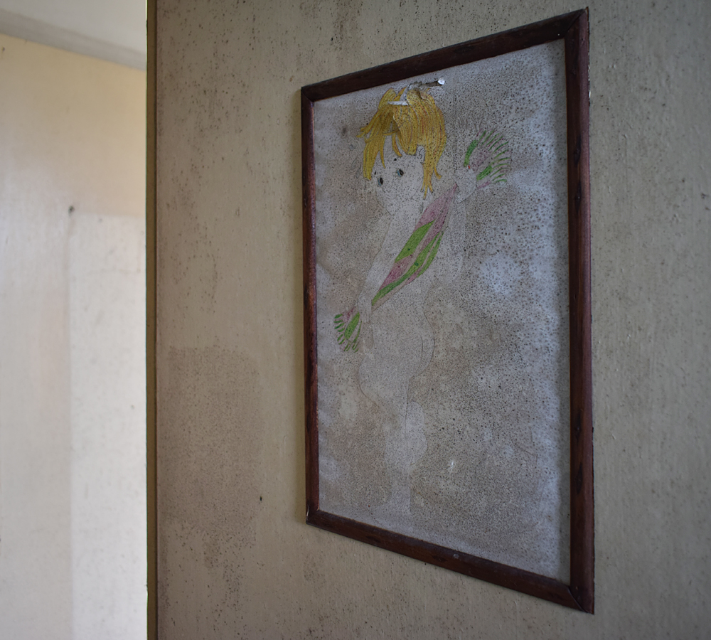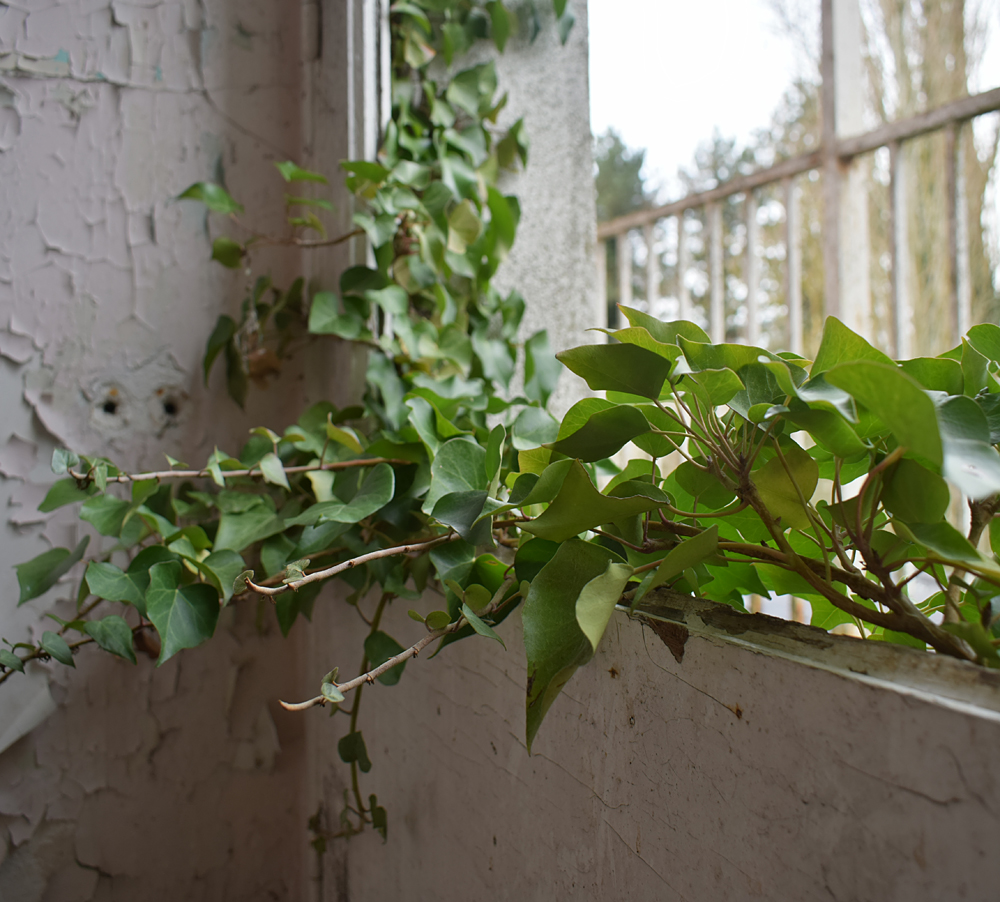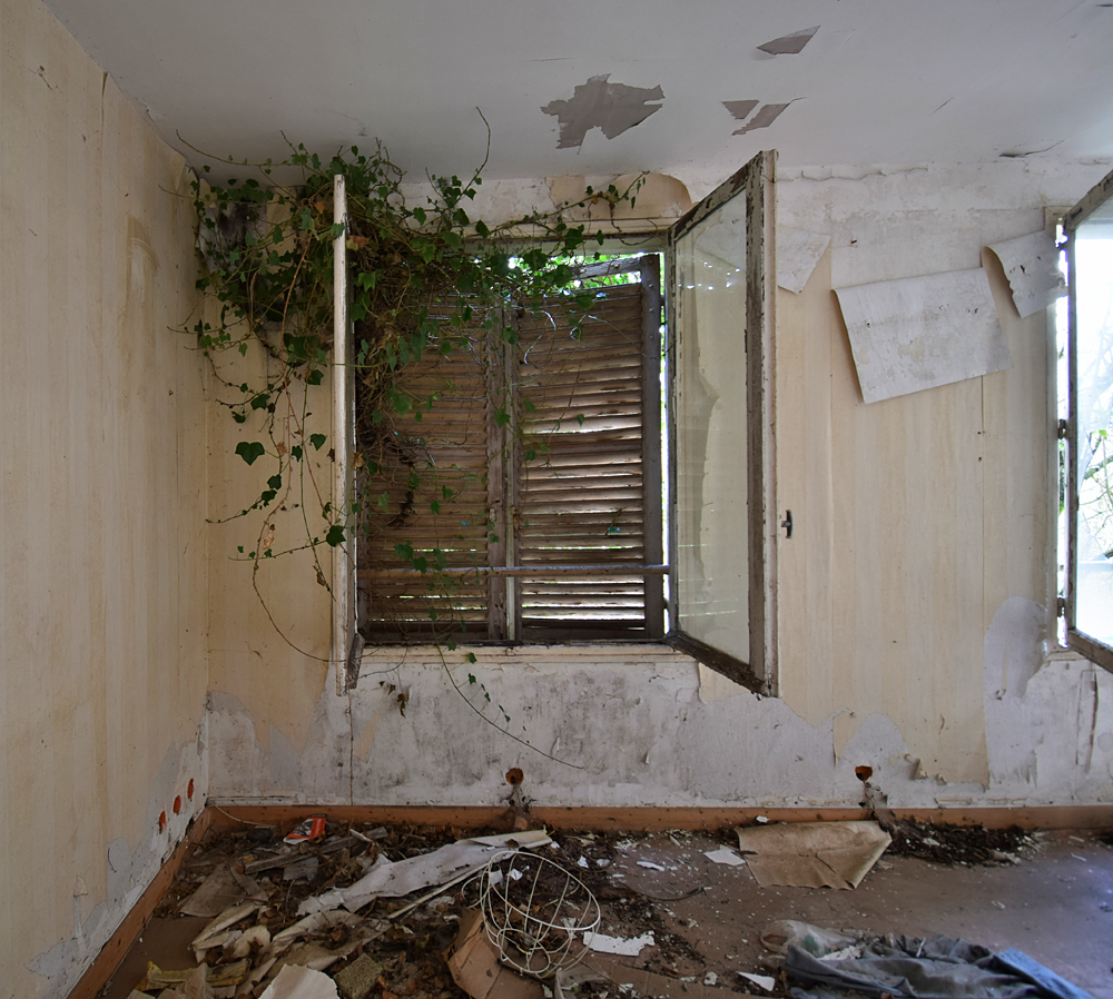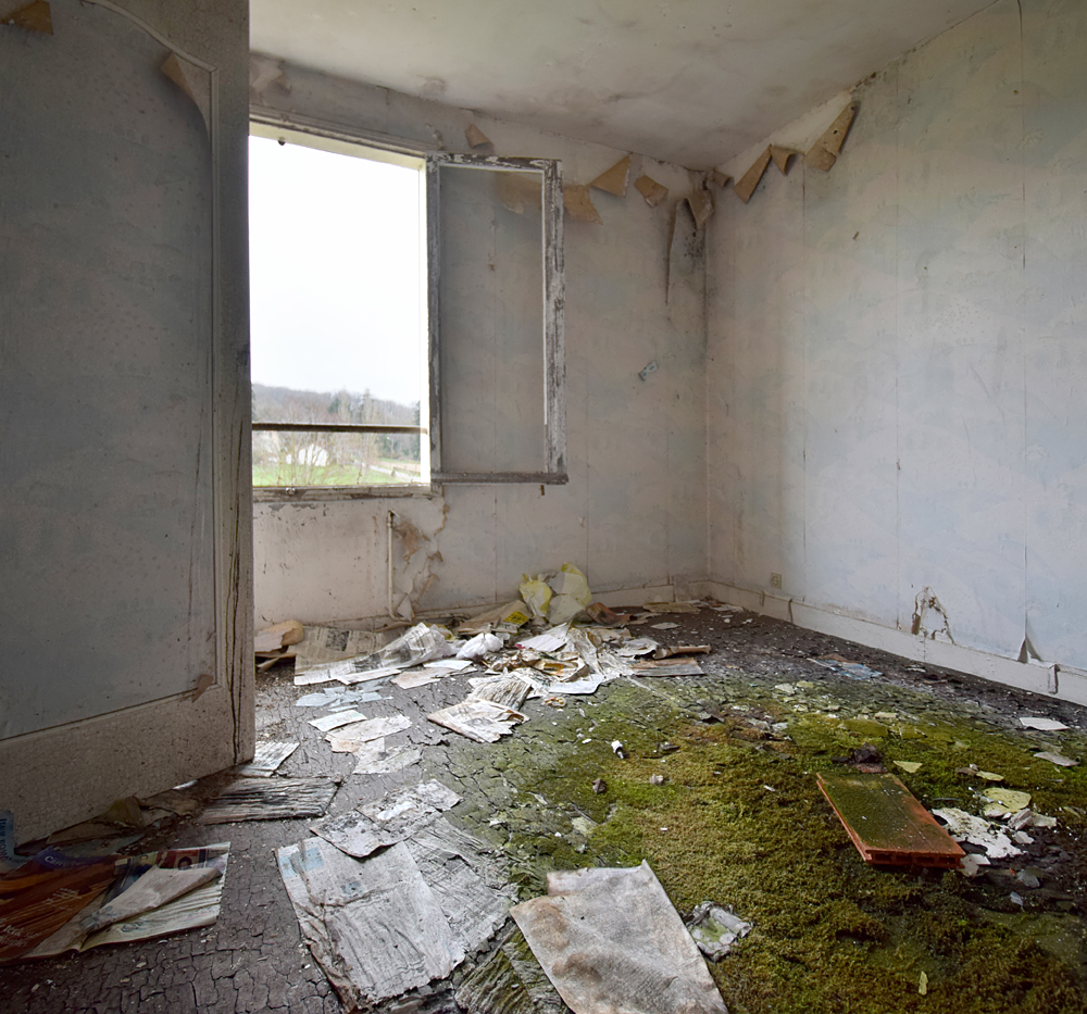 Là encore, la visite n’est pas si exceptionnelle que ça en terme d’architecture, mais c’est vraiment intéressant de découvrir ces ambiances si différentes les unes des autres selon les logements. Les différents papiers peints décrivent des vies différentes : ici, des fleurs, plus loin, des cerfs et des biches, à un endroit une magnifique photo de torrent vraiment sympa, et enfin, dans une chambre d’enfant, des Pierrot ! L’ambiance mélancolique de ce site me donne envie de lui donner le nom de ce personnage quasiment toujours représenté en train de pleurer. Ici, l’analogie est encore plus criante du fait que les trois bâtiments composant la cité n’ont (littéralement) plus de feu : plus de chauffage, et plus de vie. La visite de ce dernier bâtiment se termine comme elle a commencé : en prenant en photos les deux autres bâtiments. Mais d’un peu plus haut cette fois. |