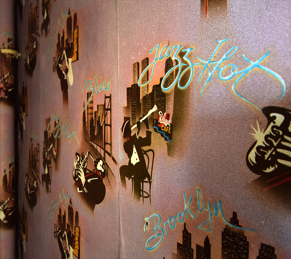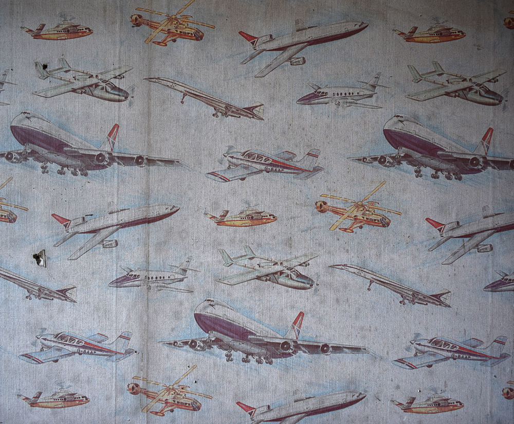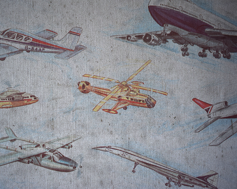 un papier peint parsemé d’avions en tous genres, là une chambre de