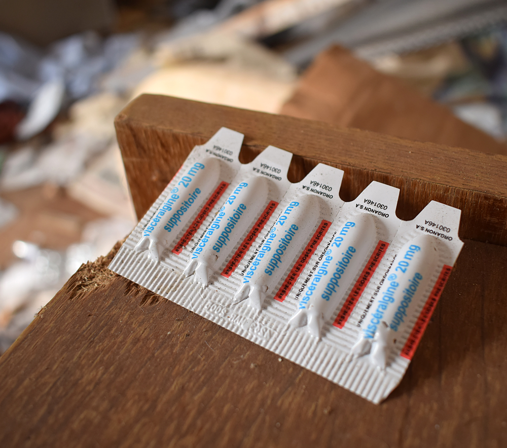 personne âgée avec de nombreuses boites de médicaments au sol… Toute