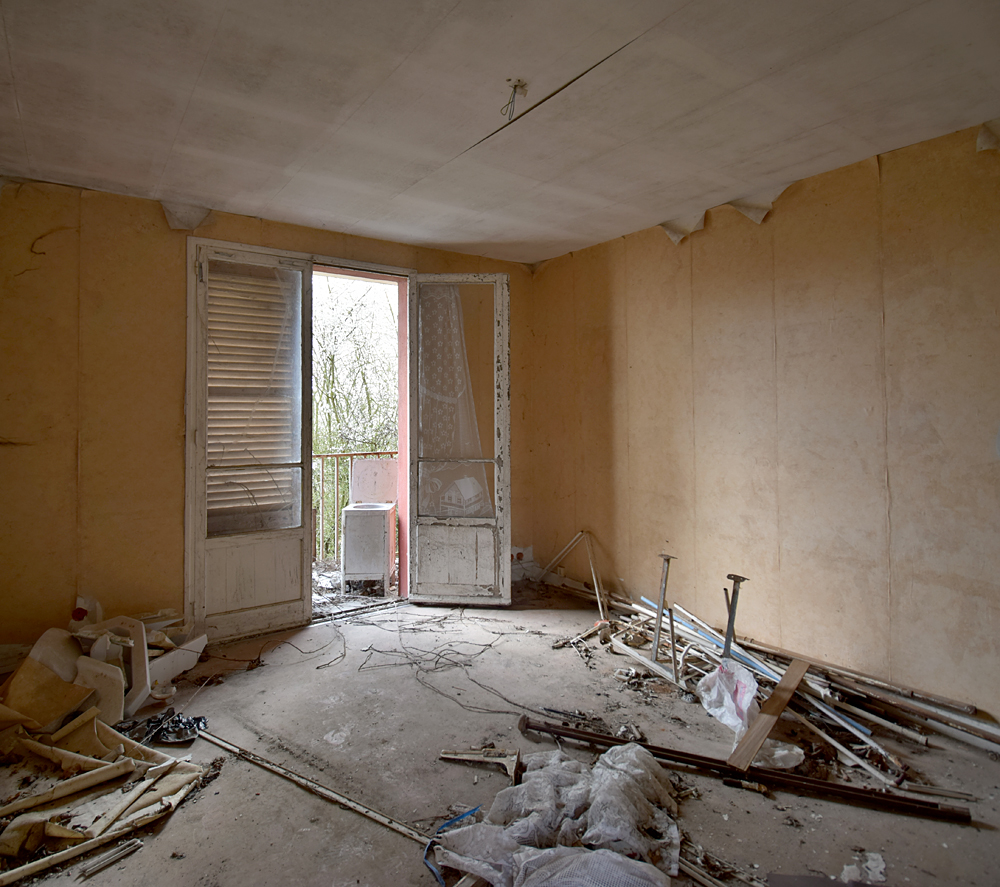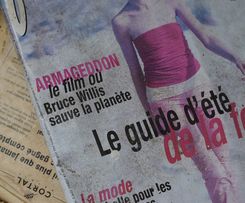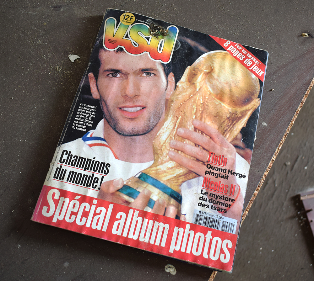Le temps de redescendre les escaliers, Cafarnaom et moi nous dirigeons vers le deuxième (celui du milieu), celui qu’il avait déjà visité lors de sa première visite. Avant d’y entrer je prends une photo du bâtiment dont nous venons de sortir, puis m’engouffre dans le suivant. Ici, pas grand-chose à dire de nouveau par rapport au premier bâtiment. Hormis l’agencement des appartements, tout est similaire : des pièces vides où gisent encore (parfois) de rares documents, témoins de la vie passée qui eut lieu ici. Quelques tags, du lierre, du papier peint, des dégradations… Pas grand-chose à dire si ce n’est que c’est toujours aussi émouvant de tomber sur des choses que l’on a connu ou vécu, comme cet autocollant Pif «J’aime les animaux» ou ce VSD spécial Coupe du Monde 1998. Fin de la visite du deuxième bâtiment ! Ci-dessous, les photos prises à l’intérieur : |