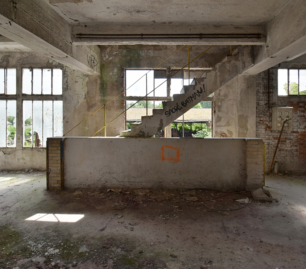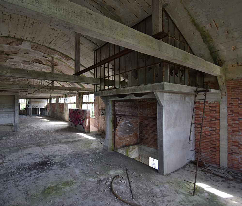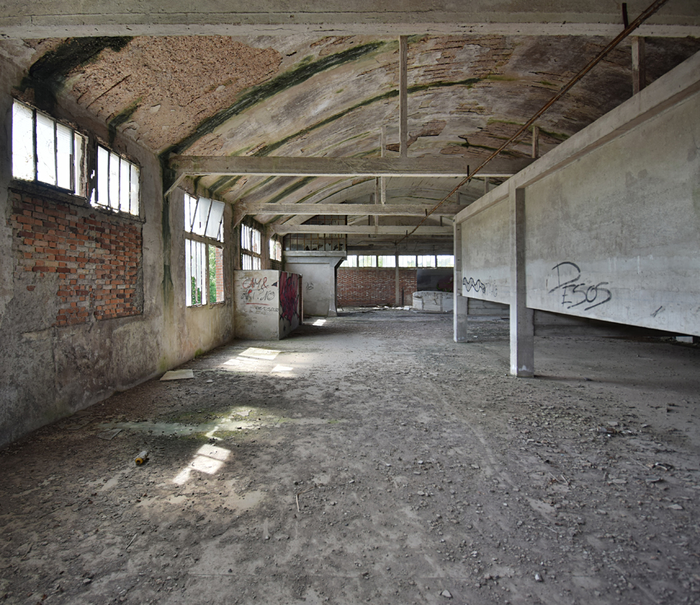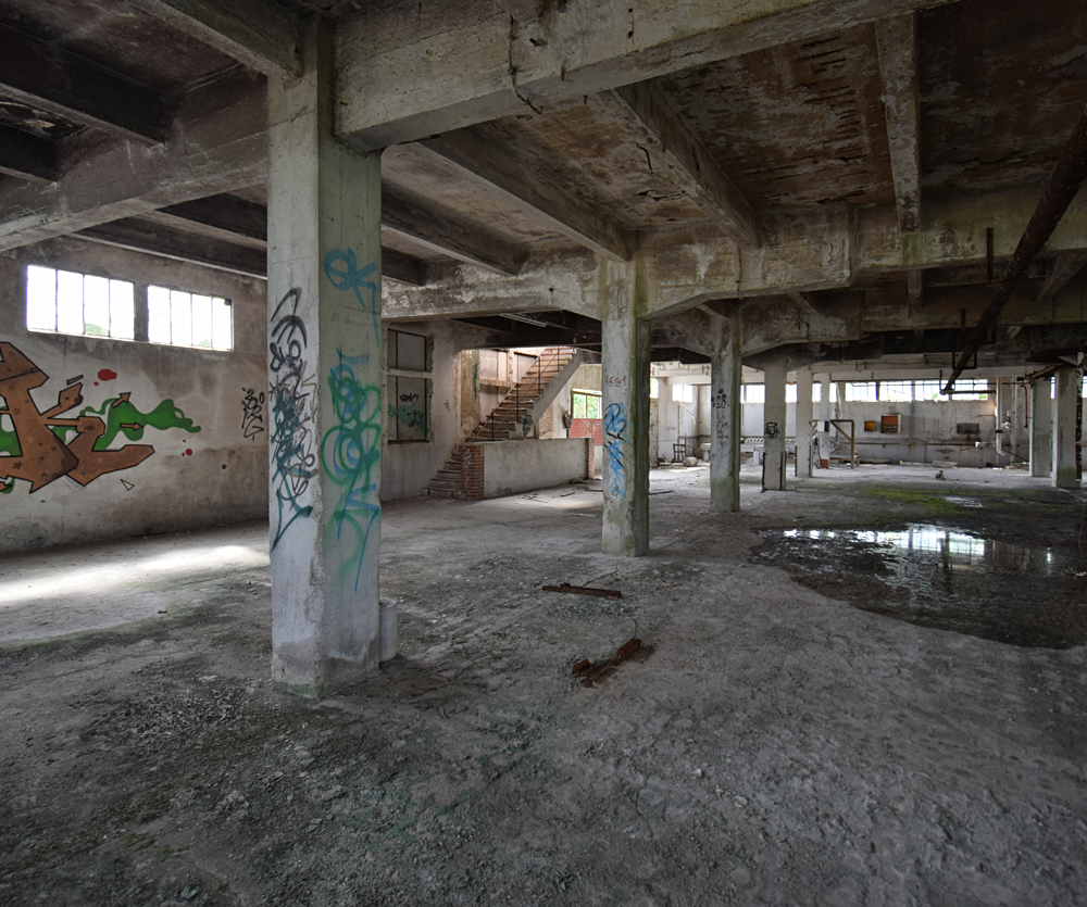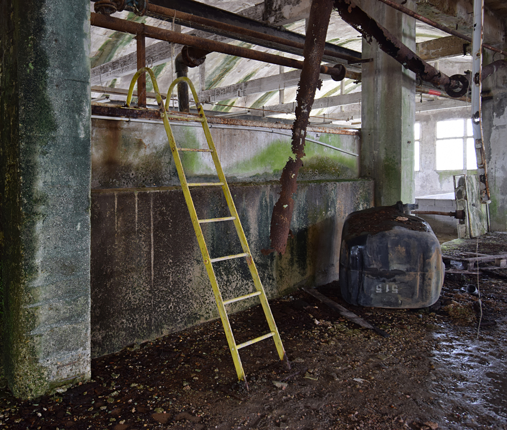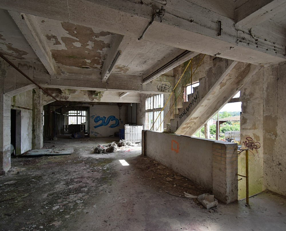 Revenant sur mes pas je gravis les marches d’un petit escalier et découvre un nouveau niveau presqu’entièrement vide. Probablement car il devait servir de stockage vu le grand monte-charge ? Aujourd’hui ce sont de grands espaces vides qui s’offrent au regard. Ici et là, quelques tags, des flaques, un peu de matériel, et à l’extrémité d’une pièce un accès au toit avec vue sur la cheminée. Une heure et trente minutes ont passé… La visite est-elle terminée ? On dirait bien que oui. Rangeant mon matériel je rejoins mes camarades d’exploration, et nous sortons sans encombre de la silencieuse papeterie. |