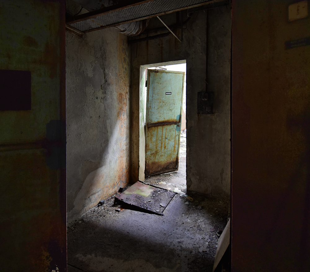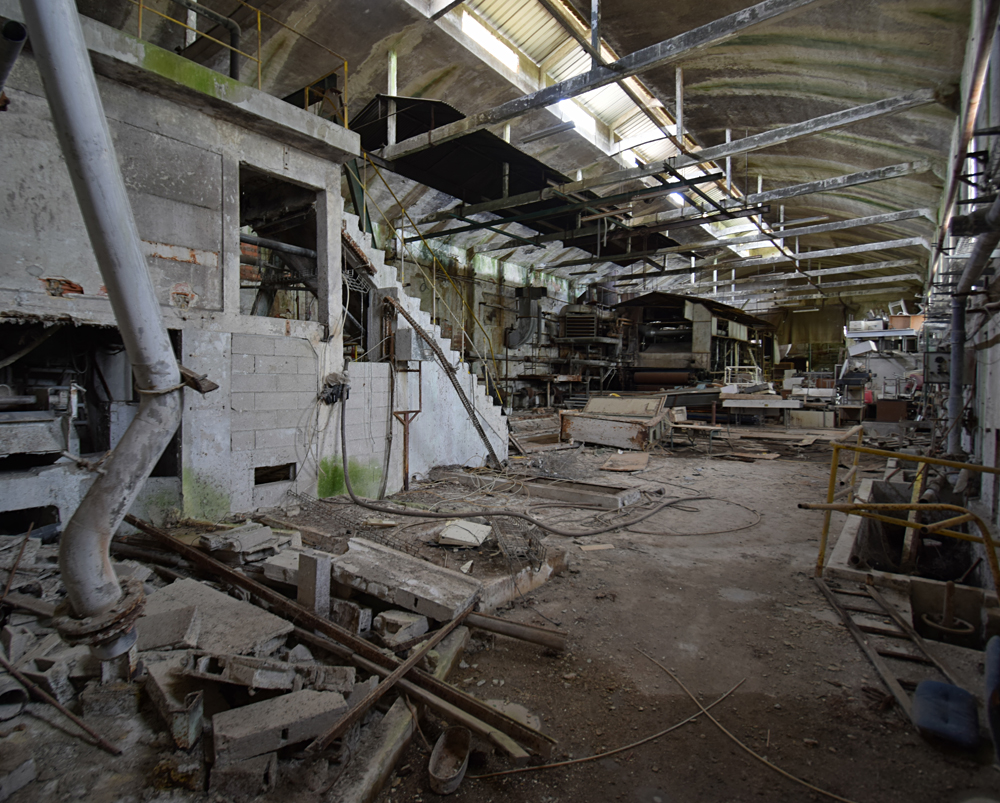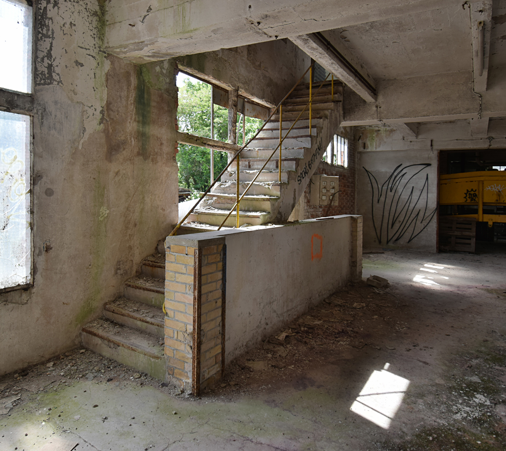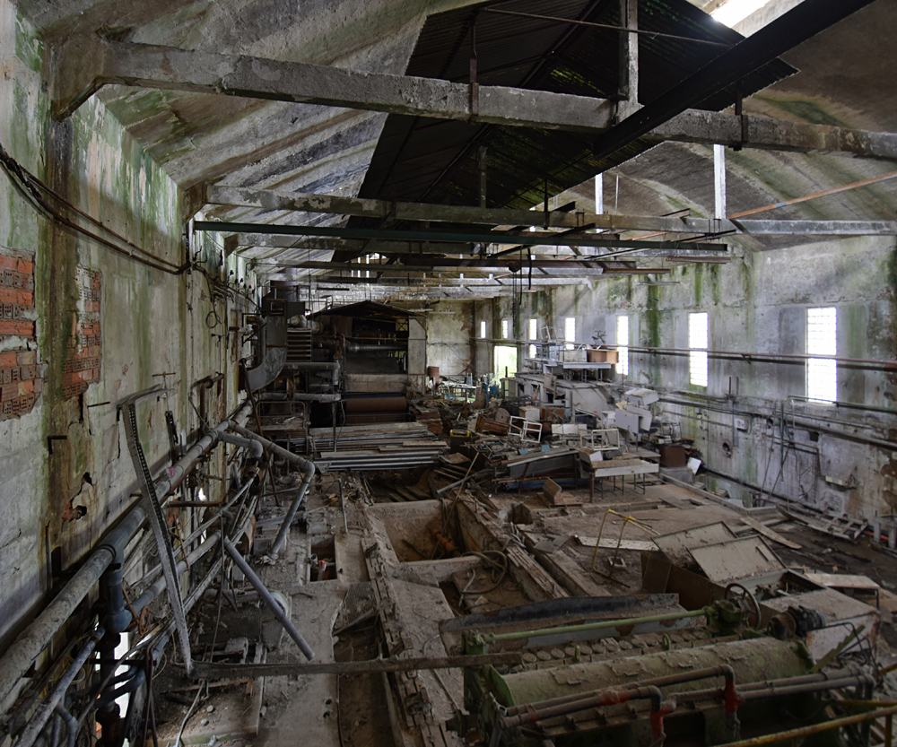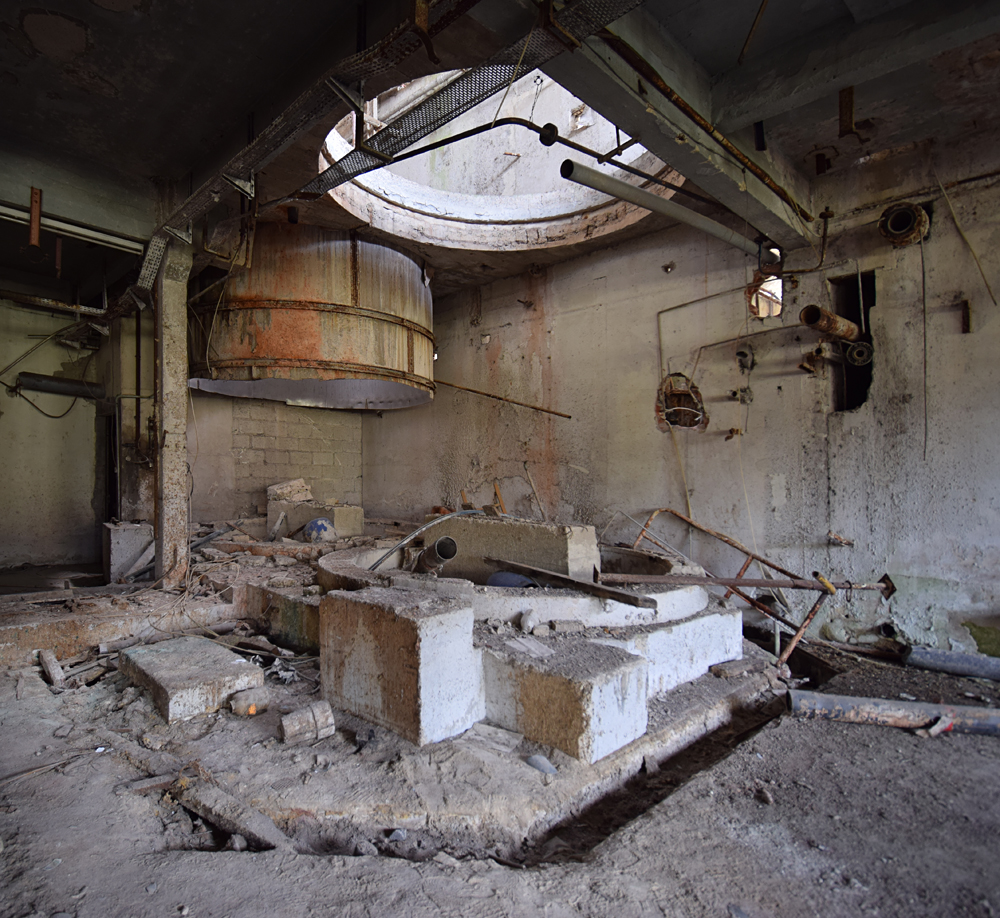 Revenant sur mes pas je gravis les marches d’un petit escalier et découvre un nouveau niveau presqu’entièrement vide. Probablement car il devait servir de stockage vu le grand monte-charge ? Aujourd’hui ce sont de grands espaces vides qui s’offrent au regard. Ici et là, quelques tags, des flaques, un peu de matériel, et à l’extrémité d’une pièce un accès au toit avec vue sur la cheminée. Une heure et trente minutes ont passé… La visite est-elle terminée ? On dirait bien que oui. Rangeant mon matériel je rejoins mes camarades d’exploration, et nous sortons sans encombre de la silencieuse papeterie. |