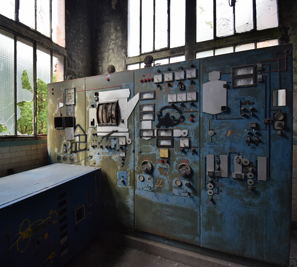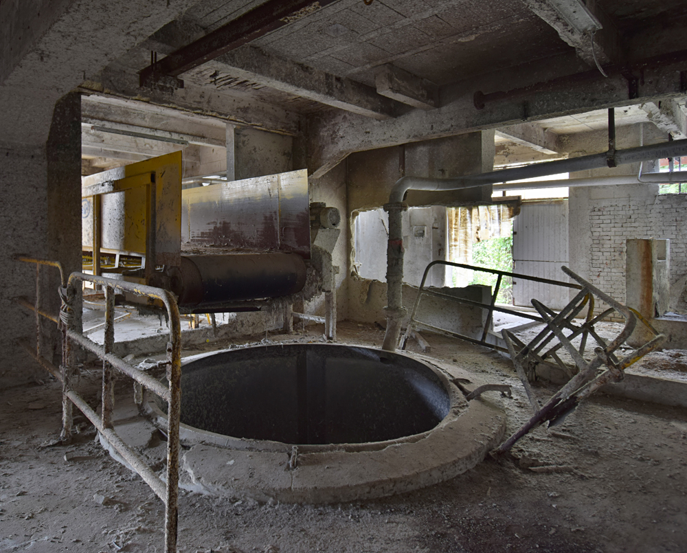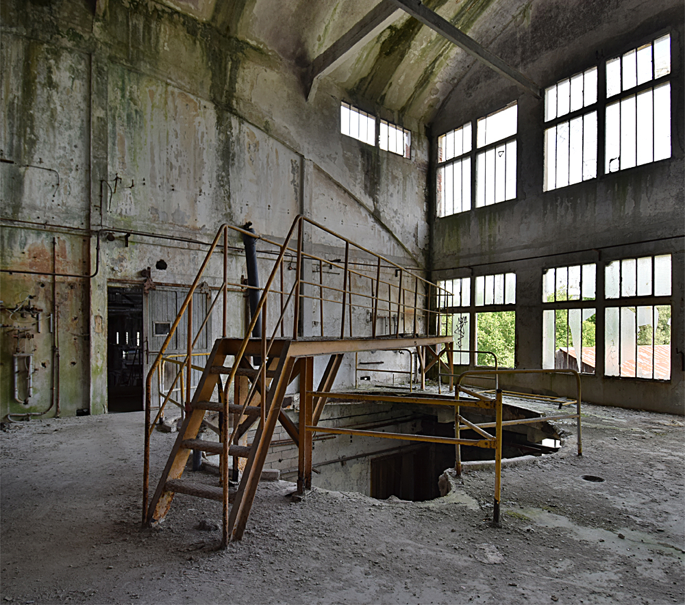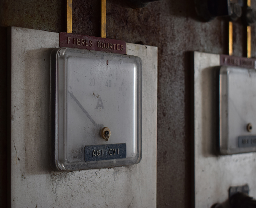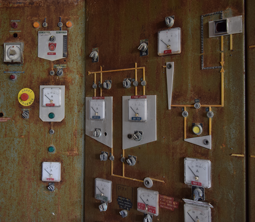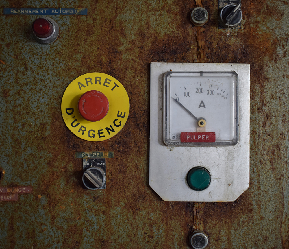 La visite de l’étage est une visite de site industriel comme je les adore, surtout ce jour-là avec ce grand soleil créant des tâches lumineuses à certains endroits. Pour autant, il ne faut pas oublier de rester sur ses gardes : l’intérieur de la papeterie est particulièrement dangereux avec tous ces trous et ces recoins sombres (malgré le grand soleil) qui donnent accès à d’anciennes cuves d’où l’on ne pourrait pas remonter en cas de chute... Plus d’un fois dans cette partie de l’usine j’ai renoncé à prendre certains clichés, l’opération étant trop périlleuse. On a beau se dire que le béton est un matériau solide, c’est tout de même toujours aussi stressant d’évoluer dans un lieu aussi fissuré par endroits, et où chaque rambarde rouillée et n’offre que peu de sécurité. Par endroits une certaine sérénité est tout de même possible, comme dans cette pièce abritant encore différentes armoires électriques où l’on peut lire d’obscures et jolies inscriptions telles que «PULPEUR», «PULPER», «AGI CVI» ou «FIBRES COURTES». |