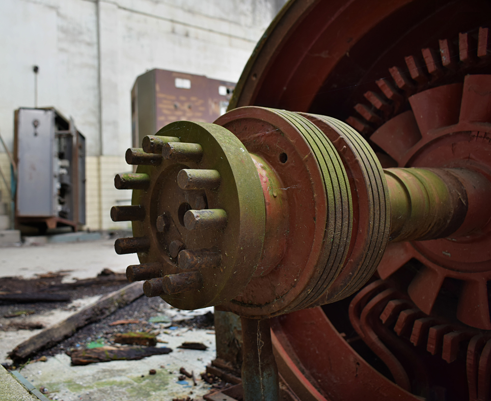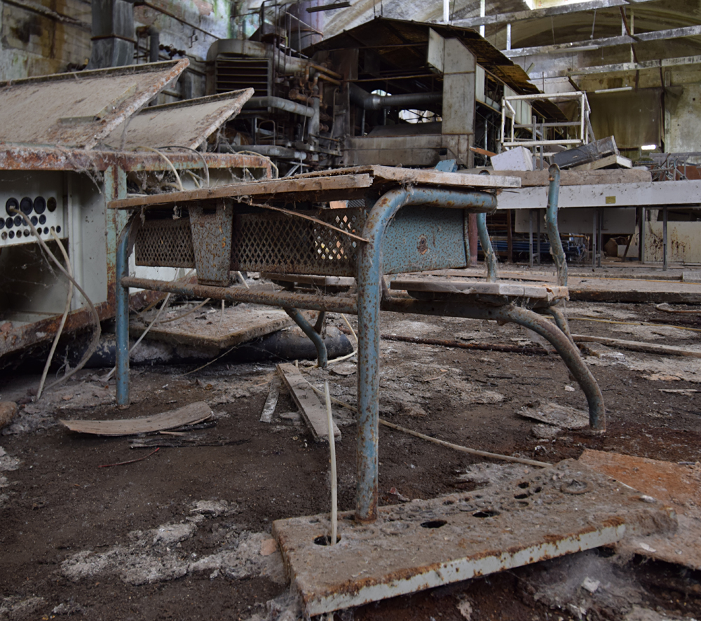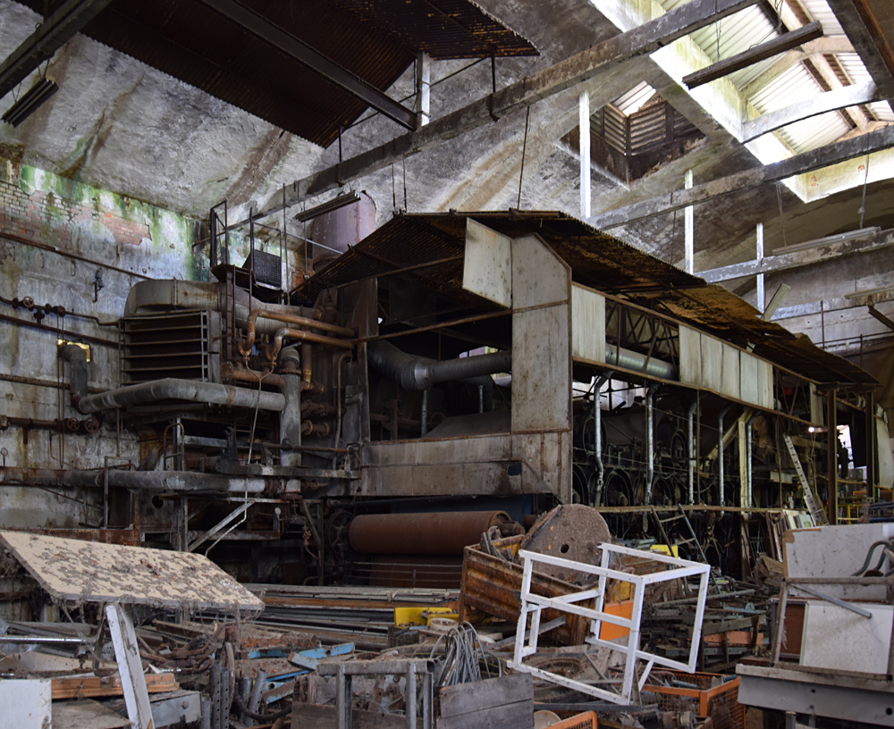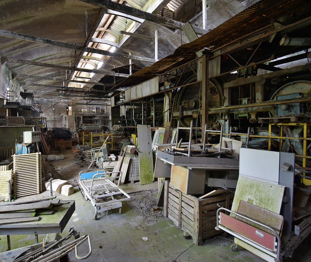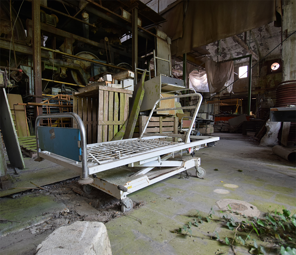 Après avoir poussé une porte, quelle n’est pas ma surprise de découvrir une immense salle qui (à priori) devait contenir l’immense machine servant à fabriquer les rouleaux de papier. Je précis bien «à priori» car je ne connais rien dans ce domaine, et ne peut que m’imaginer à quoi servaient telles ou telles pièces. N’hésitez pas à m’écrire si vous avez des informations. M’approchant lentement de ce qui reste du mastodonte de métal je tombe sur une table d’écolier, et plus loin un lit d’hôpital. Moi qui pensais (après avoir repéré le site de l’extérieur) que seulement l’extérieur du site était utilisé pour stocké pour entreposer du matériel de btp, j’ai une petite angoisse... Mieux vaut ne pas rester dans cette zone. Le temps de documenter la pièce je reviens sur mes pas et gravit les marches d’un escalier me menant au niveau supérieur. |