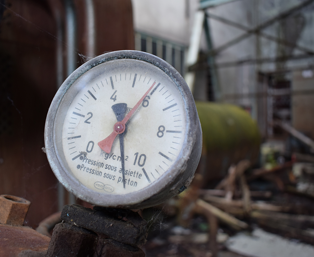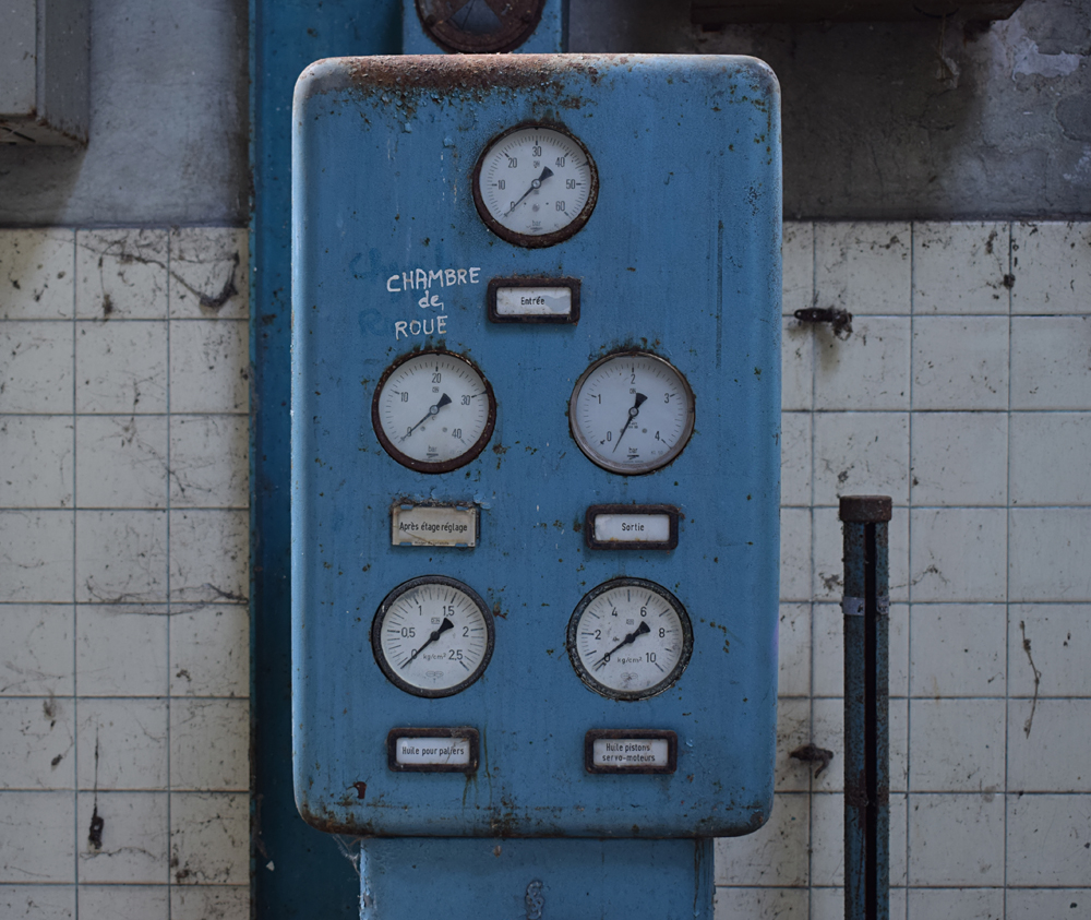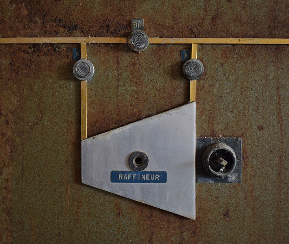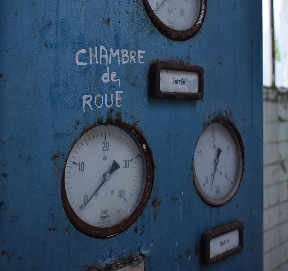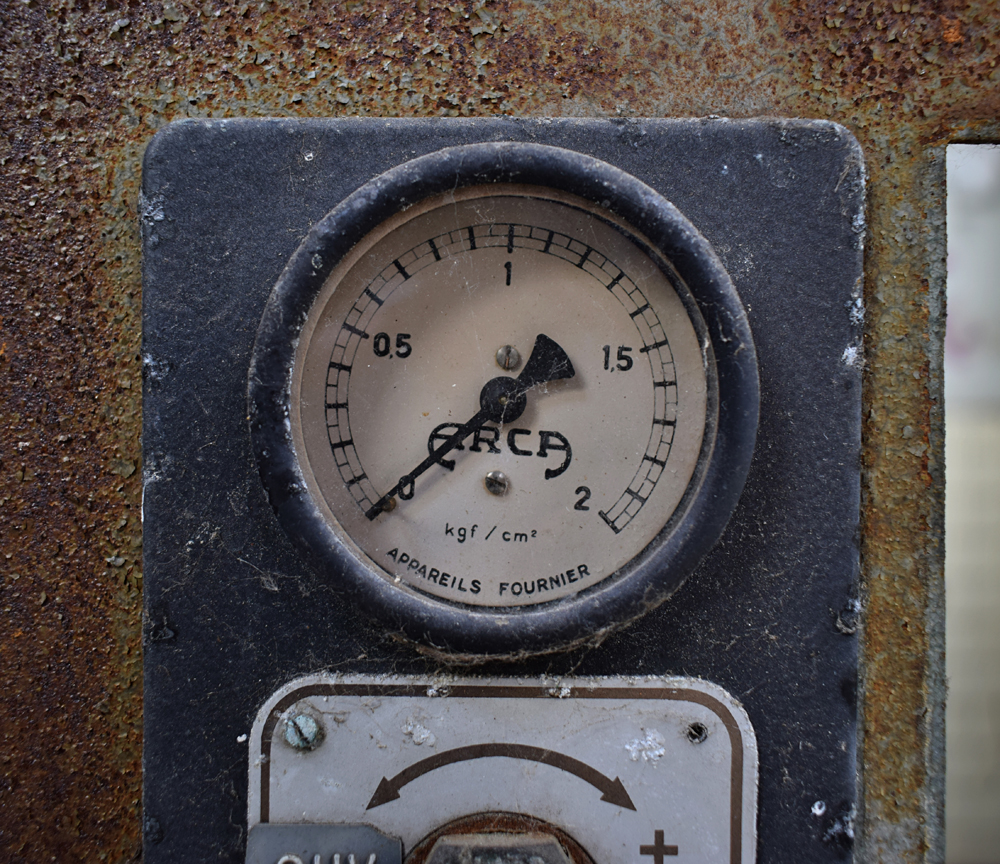 Quelques instants plus tard je découvre une jolie salle au plafond vouté dans laquelle de nombreux détails accrochent mon regard : la machinerie moussue, une sorte de balance bleue, de chatoyants boutons sur les condensateurs, et de splendides aiguilles un peu partout, dont une de la marque «ARCA / FOURNIER» particulièrement jolie avec son écriture Art Nouveau. Coup de cœur aussi pour cette inscription au Tippex précisant «CHAMBRE de ROUE», et que dire du manomètre indiquant «Pression sous assiette / Pression sous piston» ? Mais le plus beau c’est probablement cet autocollant précisant que «même le 110V (volts) peut tuer» avec cette tête de mort rouges (et ses os) devenant un éclair jaune et blanc. |