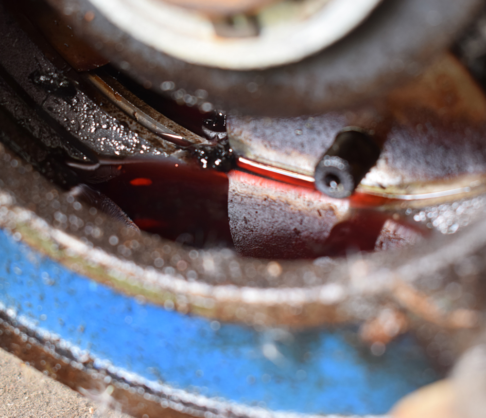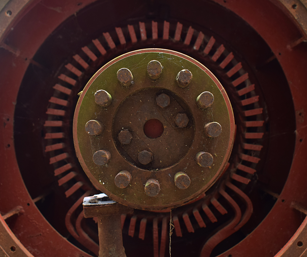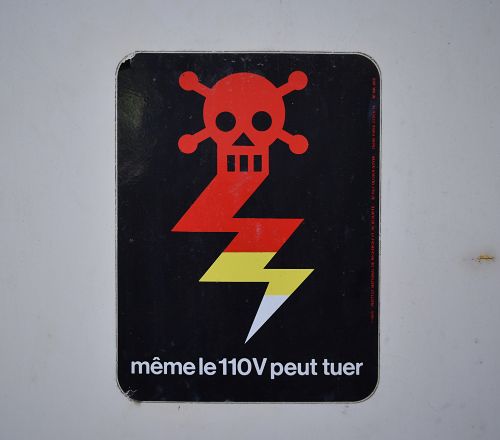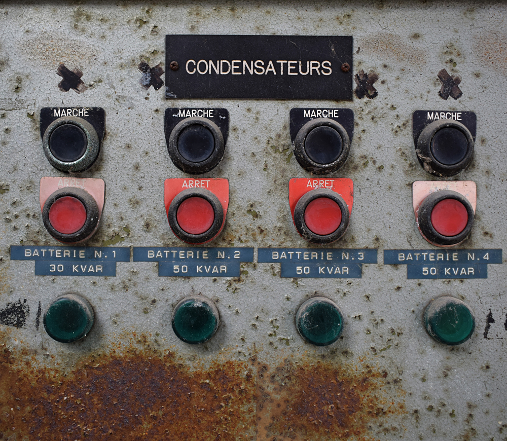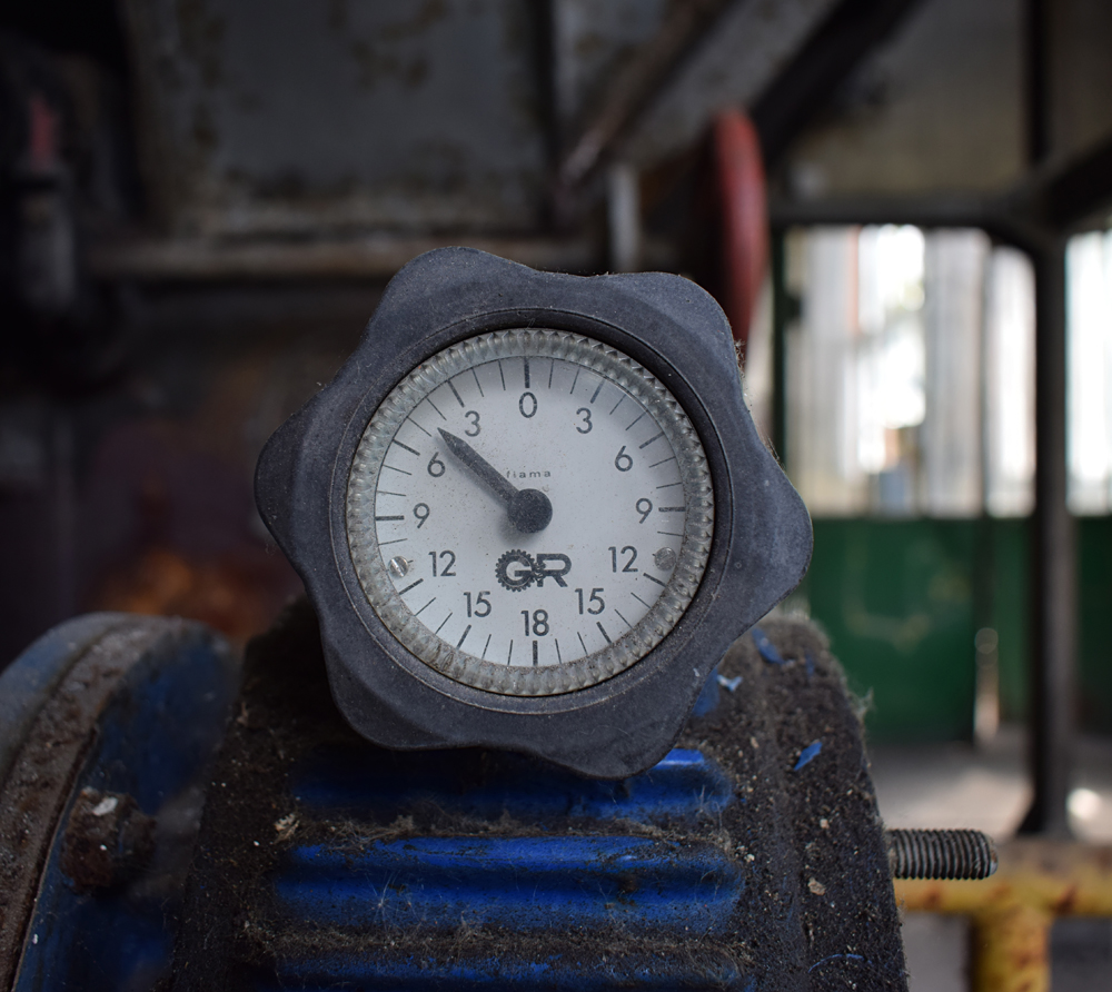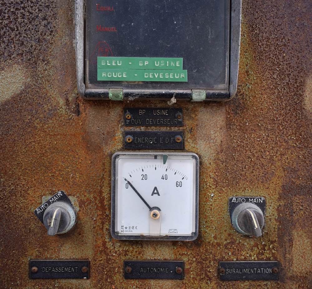 Quelques instants plus tard je découvre une jolie salle au plafond vouté dans laquelle de nombreux détails accrochent mon regard : la machinerie moussue, une sorte de balance bleue, de chatoyants boutons sur les condensateurs, et de splendides aiguilles un peu partout, dont une de la marque «ARCA / FOURNIER» particulièrement jolie avec son écriture Art Nouveau. Coup de cœur aussi pour cette inscription au Tippex précisant «CHAMBRE de ROUE», et que dire du manomètre indiquant «Pression sous assiette / Pression sous piston» ? Mais le plus beau c’est probablement cet autocollant précisant que «même le 110V (volts) peut tuer» avec cette tête de mort rouges (et ses os) devenant un éclair jaune et blanc. |
