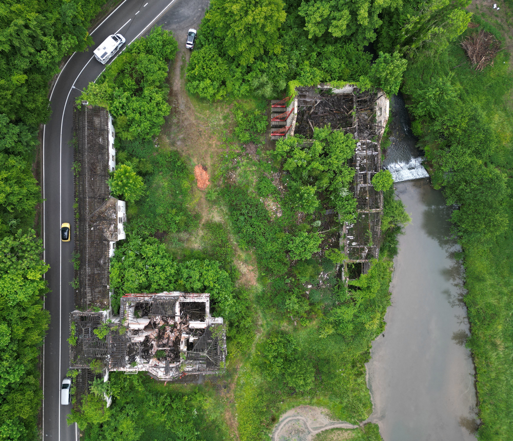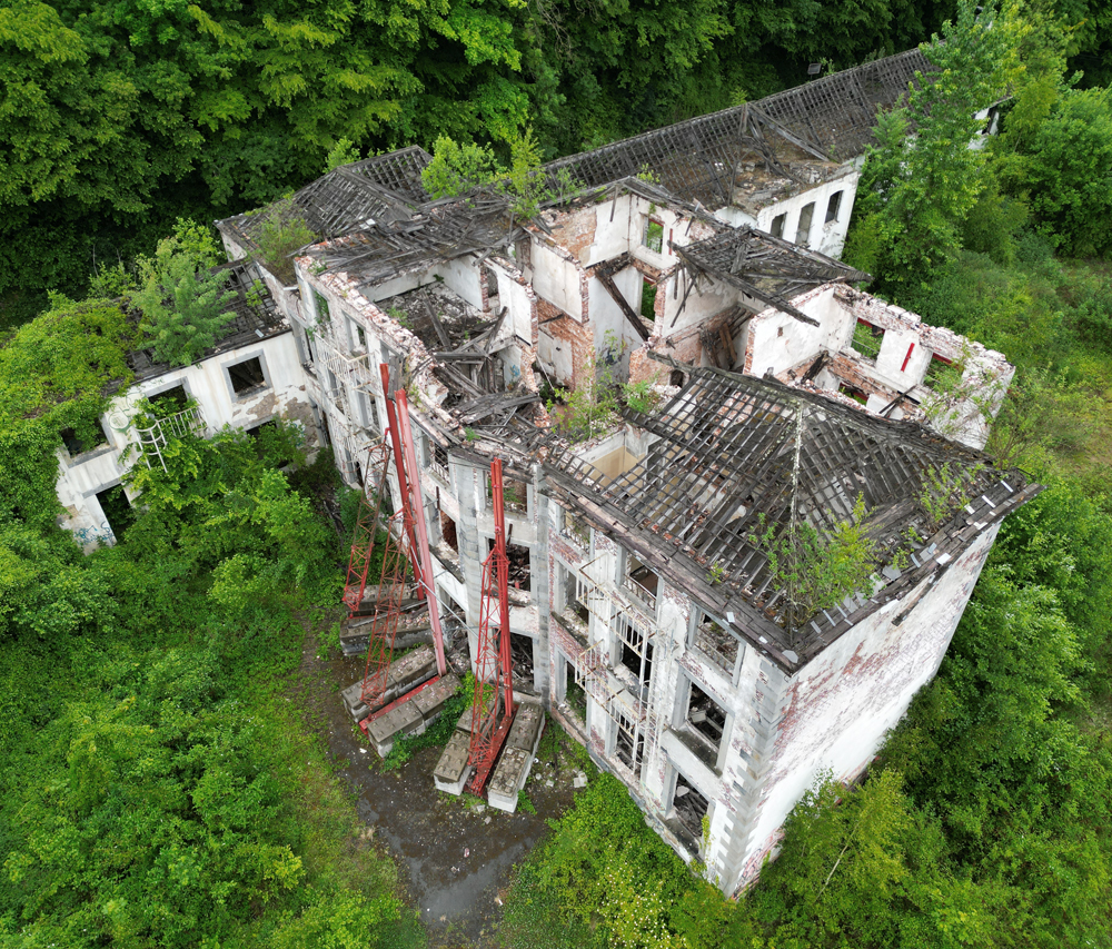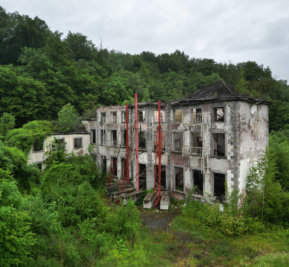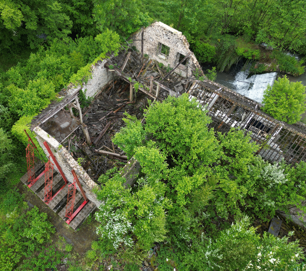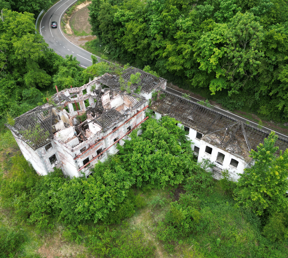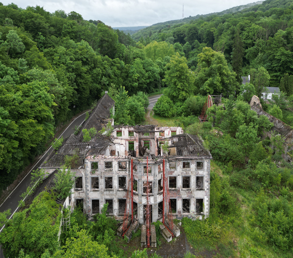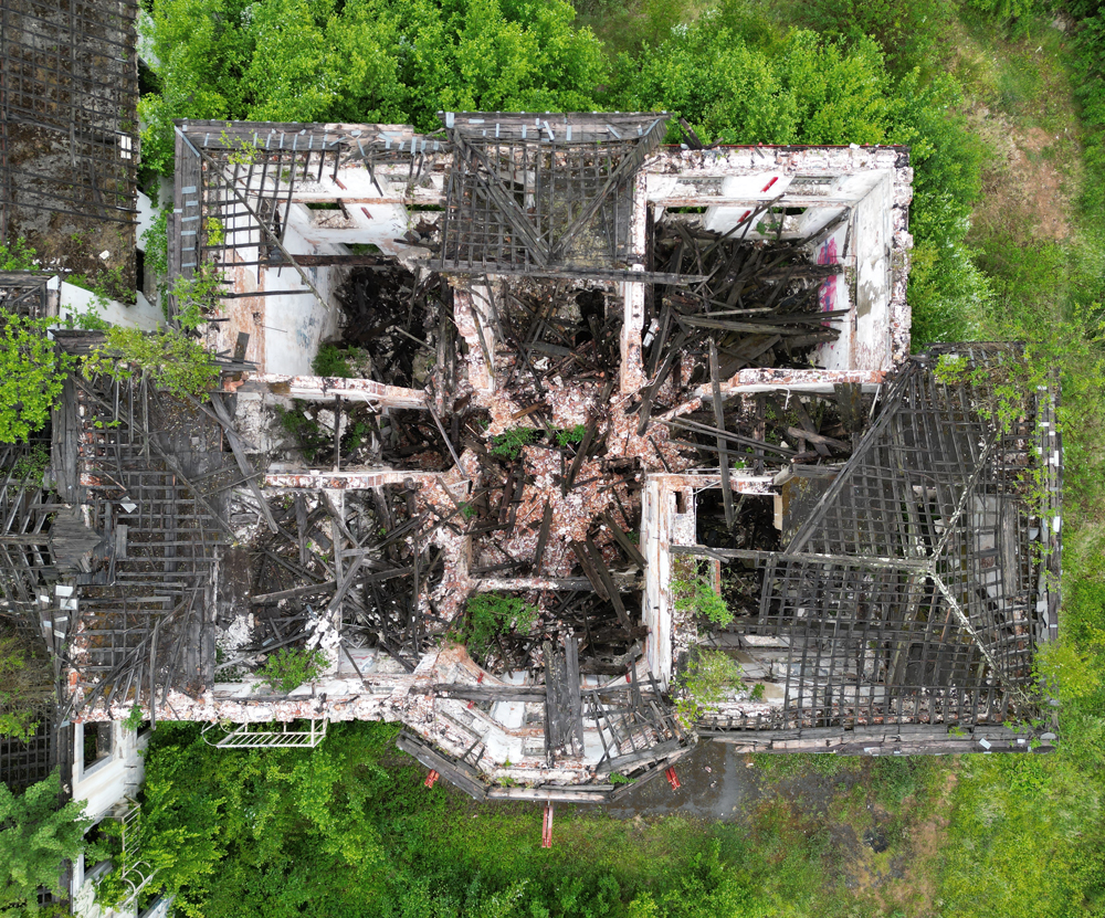 Avril 2025 : Situé à mi-chemin entre deux lieux à l’abandon, voici un site qui s’avérait intéressant sur Google Maps. Sur la vue satellite on distinguait un beau bâtiment, deux autres juste à côté, une rivière… De quoi promettre une chouette exploration, et surtout de jolies photos au drone ? Mai 2025 : Une fois sur place, outre la petite pluie fine qui rend la visite (légèrement) pénible, je constate que le site est vraiment en très mauvais état comparé à la vue satellite (de toute évidence pas à jour) qui m’avait motivé à venir un mois plus tôt : il n’y a plus de toiture ! La noirceur des poutres ne laisse aucun doute : un incendie a eu lieu ici. Quand ? Aucune idée. L’accès aux étages étant plus que compromis (planchers à moitiés effondrés) la visite sera donc bien plus courte que prévu, et moins passionnante, mais c’est ça l’exploration urbaine : il faut bien se rendre sur place si l’on veut pouvoir constater par soi-même. En guise d’introduction, voici une photo de la carcasse du château (car il s’agit d’un château) prise en fin de visite avec le drone d’Aude (que je remercie). Les étais ont-ils été posés avant l’incendie pour éviter que la carcasse ne s’écroule pas comme un château de cartes ? Ou après, en vue d’une possible réhabilitation ? Je n’en sais trop rien. |