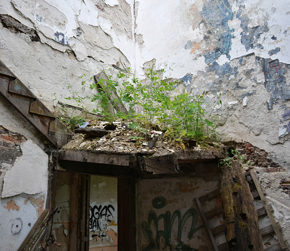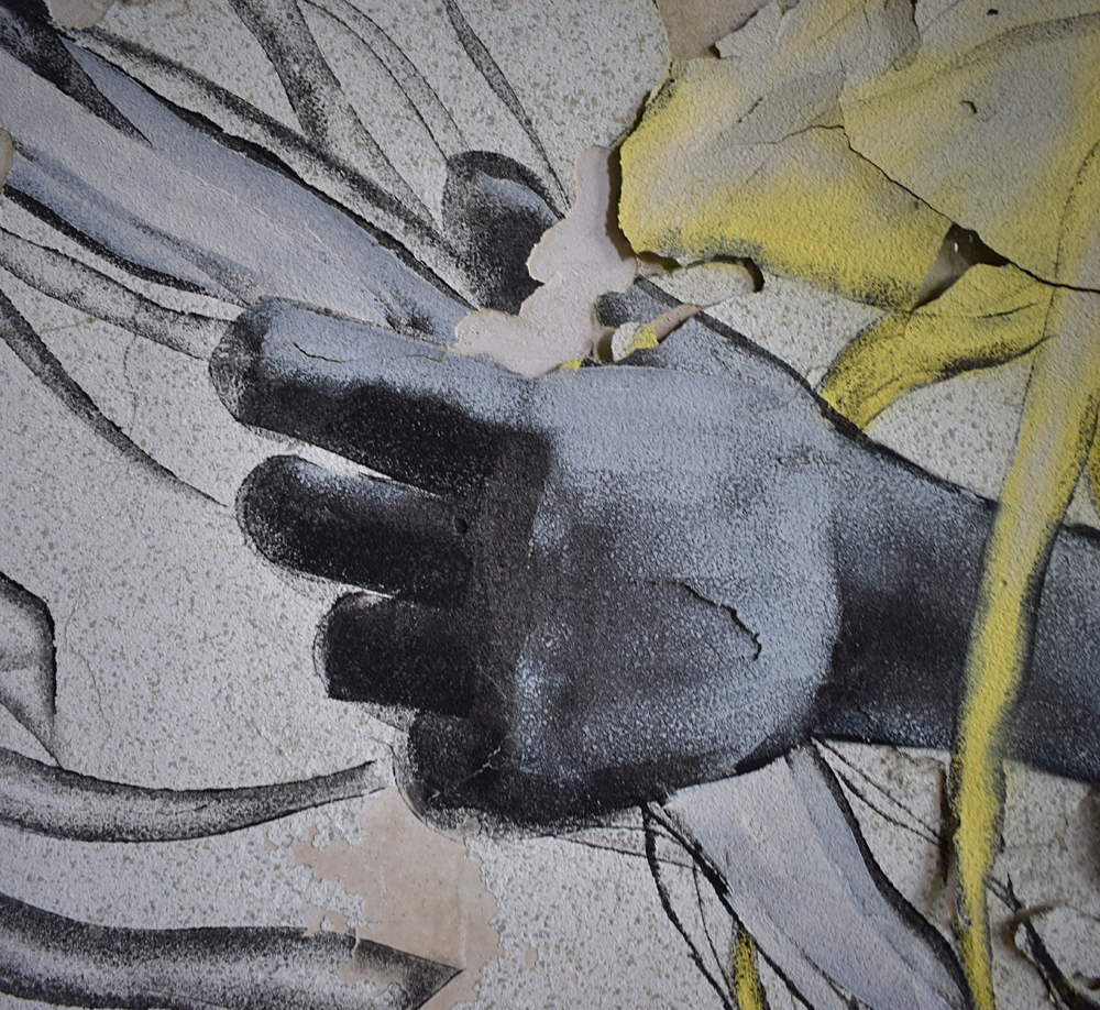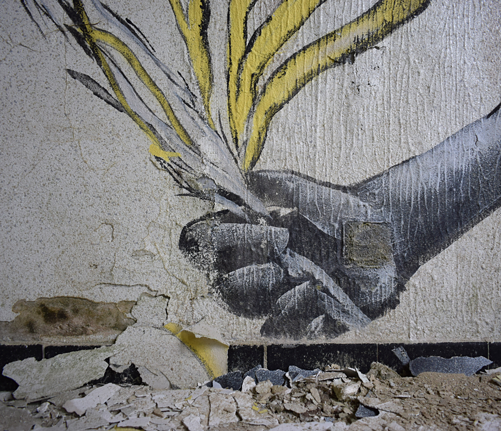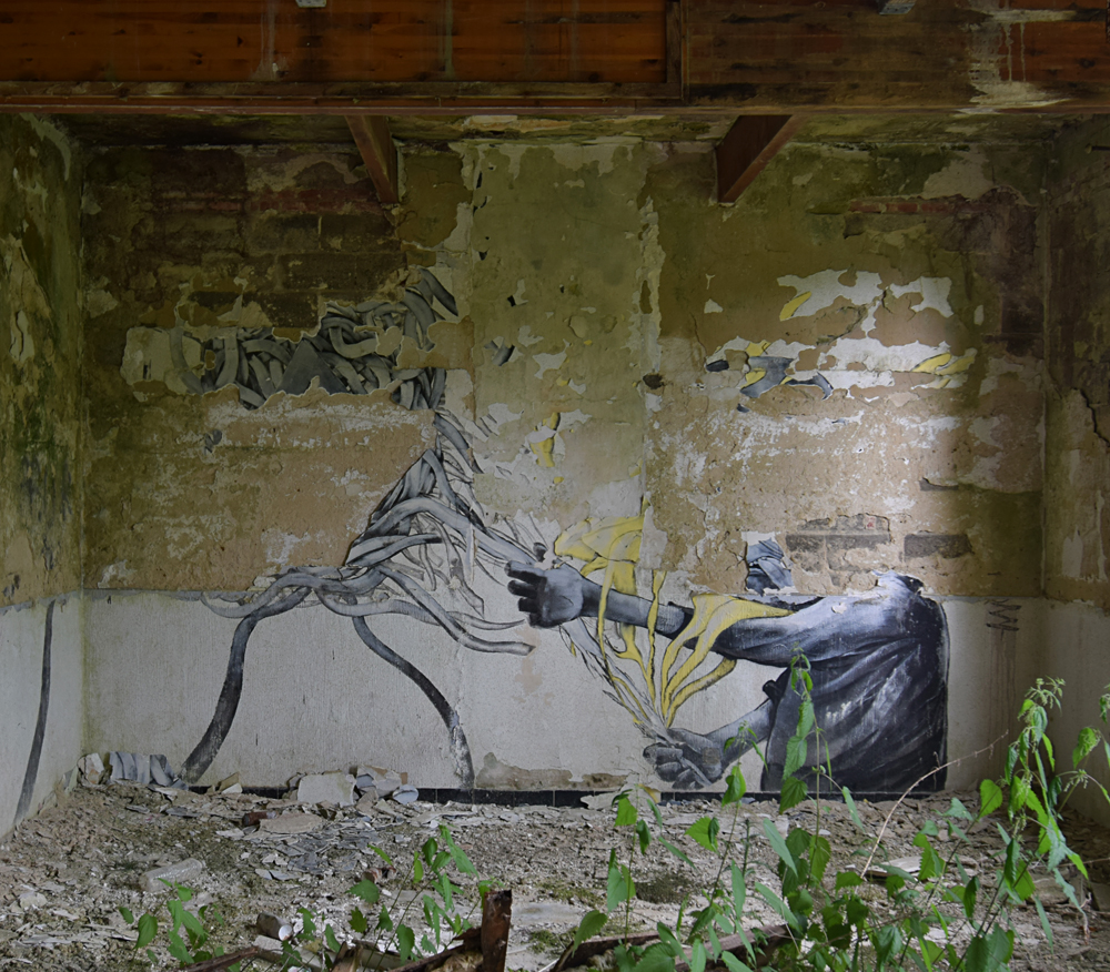Depuis la carcasse du château un couloir permet de rejoindre un autre bâtiment qui devait probablement servir de communs et/ou de logement pour le personnel. Ici aussi, tout est en plus ou moins mauvais état, et la toiture a également pris cher. Comme dans de nombreux lieux à l’abandon, on croise des tags et des grafs ici et là. L’un d’eux attire mon attention. Plutôt réussi, il est malheureusement compliqué à voir en entier car la peinture sur lequel il a été peint s’est trop décollé. Ne restent que des détails vraiment beaux, comme ces bandelettes tenues par la main d’un personnage. D’autres bandelettes, jaunes, partent de son autre main. Curieuse vision sur laquelle s’achève ma visite (pédestre) du site. |